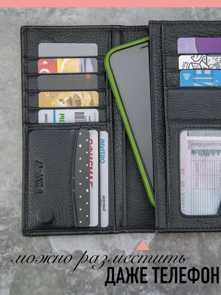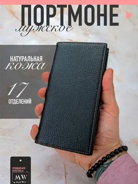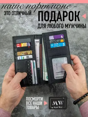 Стильный мужской складной партмоне-кошелек на магнитах из натуральной кожи это идеальный аксессуар для любого мужчины. Вместительное кожаное портмоне для документов с слотами под водительское удостоверение для банковских пластиковых и дисконтных карт, а так же паспорта. Кожаный лонгер для денег и кредиток. Кошелек имеет отделение для бумажных денежных купюр, 12 отделений для кредитных карточек, а также отделение для паспорта и стс, а так же прозрачный карман для водительского удостоверения. Складной кожаный кошелек на магнитах - клатч с двумя отделениями одно из которых на молнии, а во второе помещается мобильный телефон. Дизайнерский лонгер в стиле casual идёт в комплекте с подарочной упаковкой, а черный цвет делает кожаный кошелек особенно стильным и отлично подходит для автодокументов. Портмоне мужское кожаное подойдет для автомобильных прав и документов на машину, что делает его универсальным. Мужской бумажник из натуральной кожи в подарочной коробке - отличный выбор. Больше моделей кошельков и портмане Вы можете посмотрев кликнув на наш бренд Mark Well.