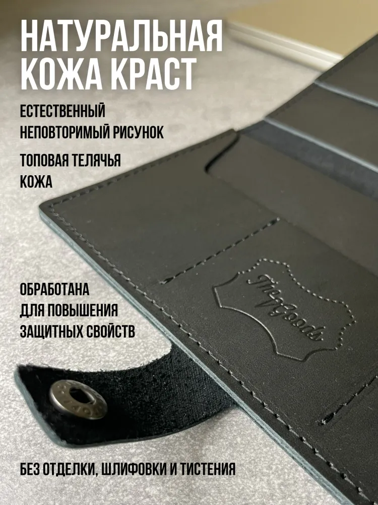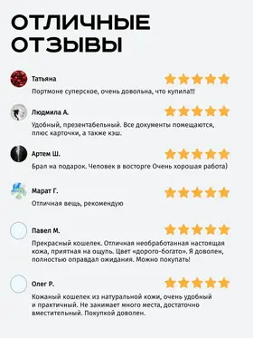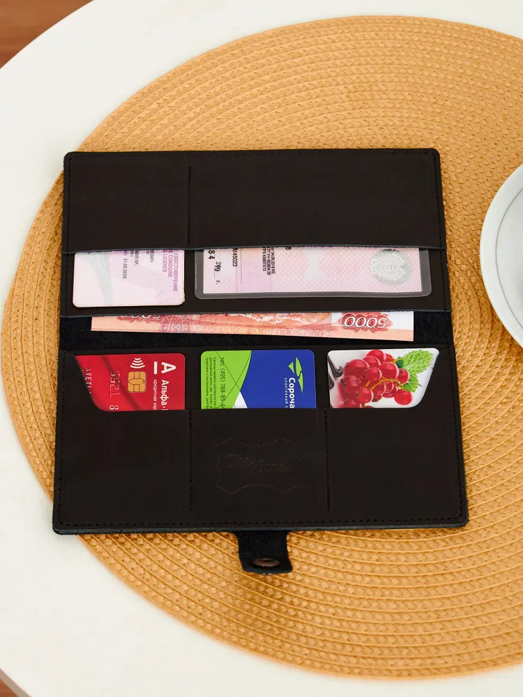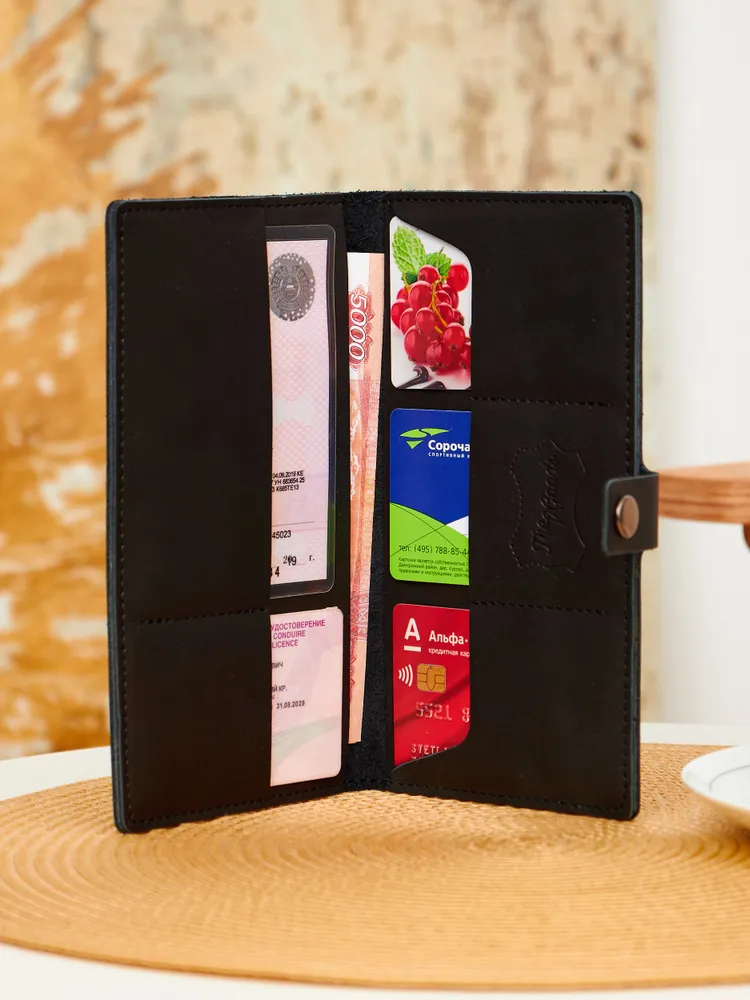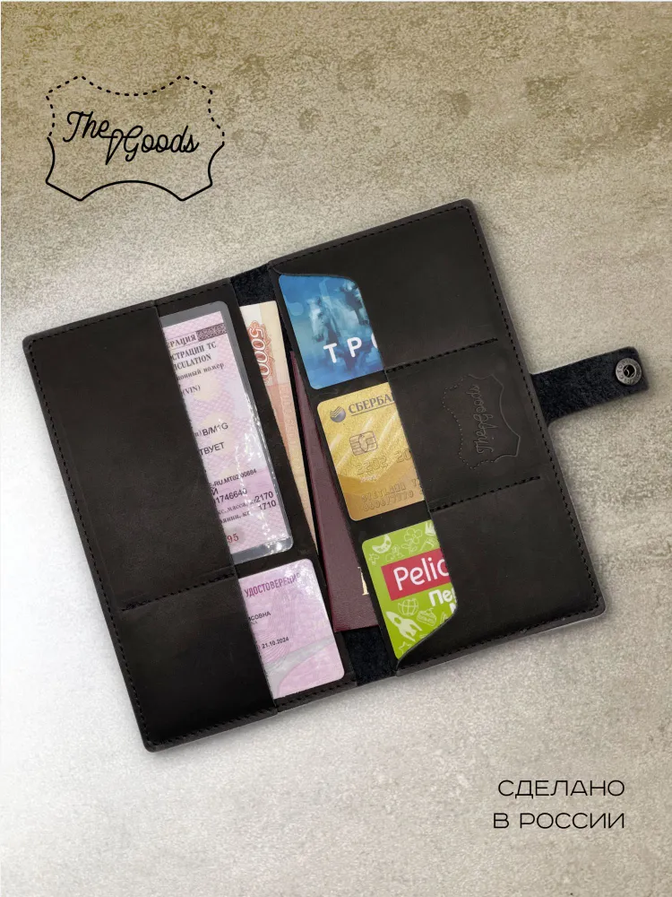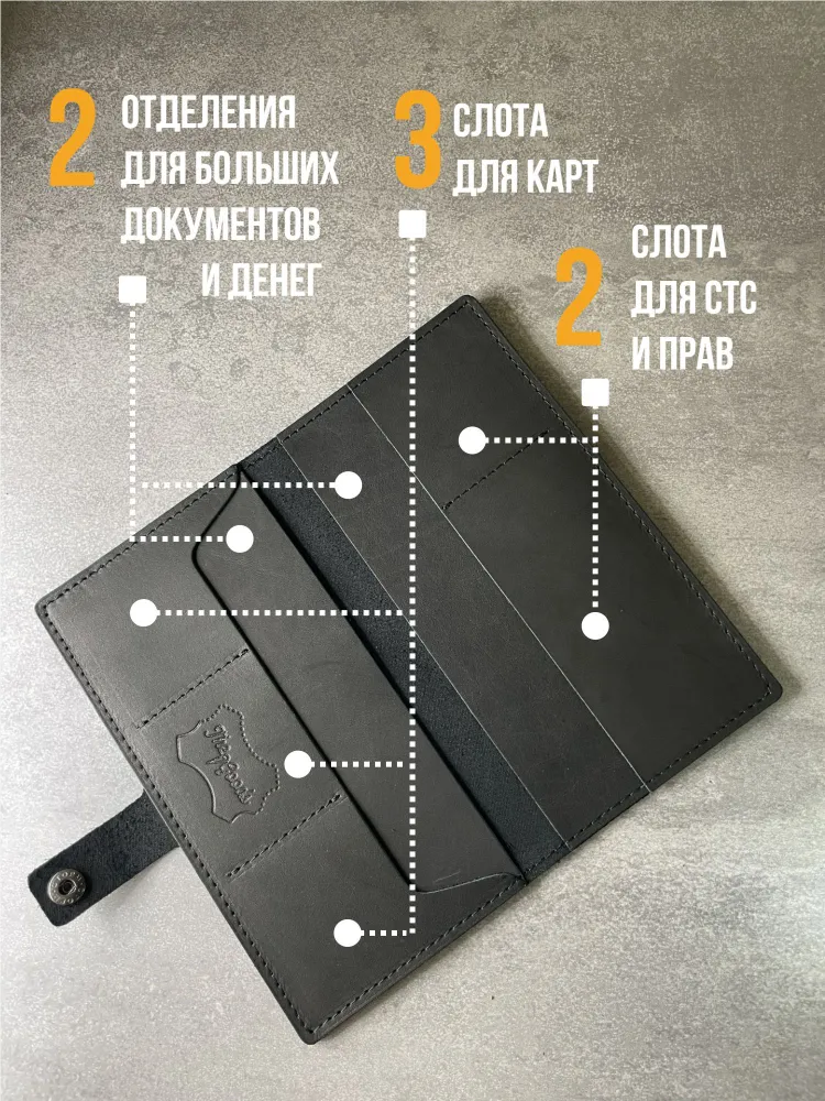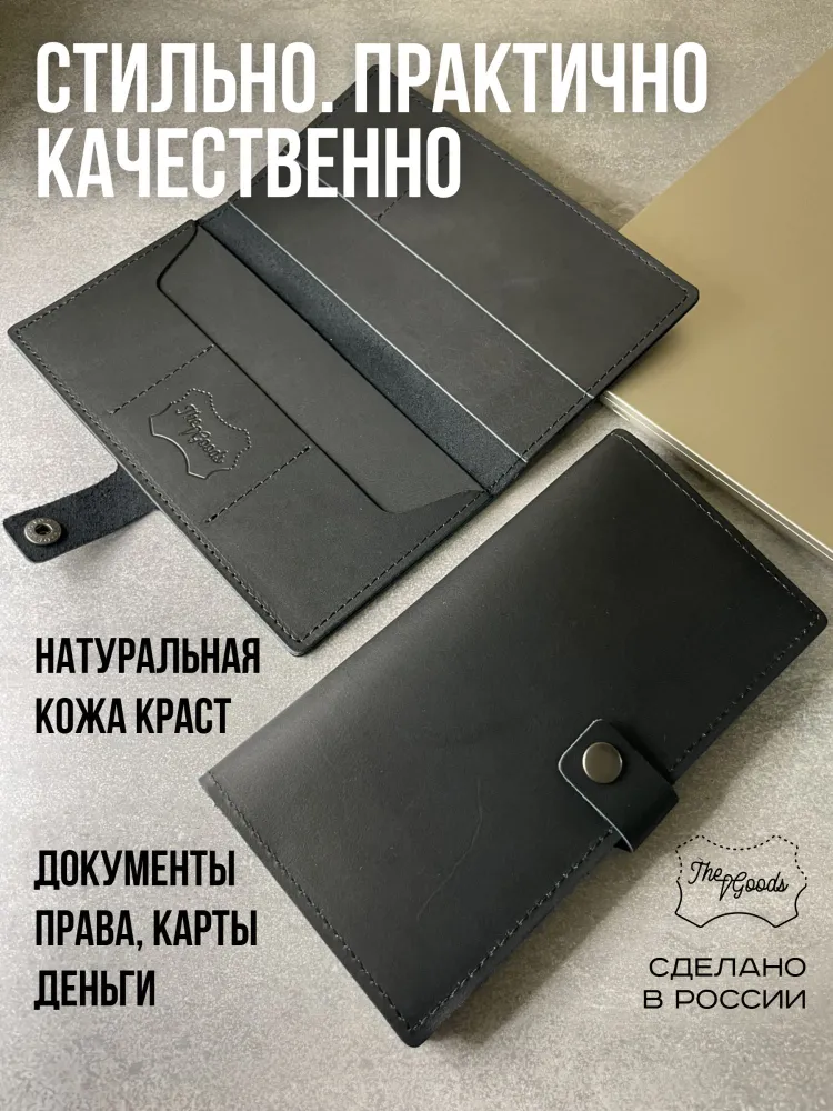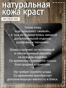 Портмоне из натуральной кожи Вы нашли то, что искали! Портмоне кожаное сделано из 100% натуральной телячьей кожи наивысшего качества, которую мы закупаем у проверенных российских поставщиков. Кожаное портмоне станет отличным подарком папе, брату, коллеге, маме, сестре или себе на день рождения, праздник или юбилей. Внимание к деталям При создании портмоне мы продумали каждую мелочь. Идеальные размеры кармашков для пластиковых карт, денег, паспорта, авто документов и других важных мелочей. Крепкие аккуратные швы. Надежная фурнитура застёжки-кнопки. Удобный размер портмоне: длина 19 см, ширина 10 см в сложенном состоянии, толщина 1 см. Отлично помещается в сумки, клатчи, внутренние карманы пиджака, куртки, пальто. Где бы вы ни находились: в путешествии, ресторане, машине, в гостинице или дома – всё самое важное всегда под рукой. Подарочная упаковка Каждое портмоне мы кладём в красивую белую подарочную коробочку. Презентабельный внешний вид – готовый подарок, который можно презентовать без дополнительной упаковки. Натуральная кожа KPC Crust Немного о коже, из которой мы делаем наши портмоне. Это 100% натуральная высококачественная кожа телёнка краст (Crust skin). Такую кожу ещё называют «живой», т.е. она не подвергалась никакой отделке, шлифовке и тиснению. Кожа сохраняет естественный и неповторимый рисунок на каждом изделии. Со временем становится только благороднее и приятнее. Уверены, что наше портмоне Вам понравится и будет радовать долгое время! Преимущества портмоне из кожи — Хранение всех документов в одном месте; — Оптимальный размер (19 на 10 см); — Удобная и надежная металлическая застежка-кнопка; — Стильный универсальный дизайн: прекрасный подарок как мужчине, так и женщине.; — Вместительность: 7 отделений внутри (3 кармашка для карт и визиток, 1 кармашек для водительского удостоверения, 1 кармашек для регистрационного удостоверения СТС, 2 вместительных отделения для денежных купюр, паспорта и даже телефона; — Высокое качество, долговечность, износостойкость: упругая, качественная натуральная кожа теленка проверенных российских производителей; — Приятное на ощупь портмоне: базовая вещь и атрибут для каждого джентльмена и дамы; — Красивая подарочная упаковка в комплекте (белая брендированная коробочка с крышкой).