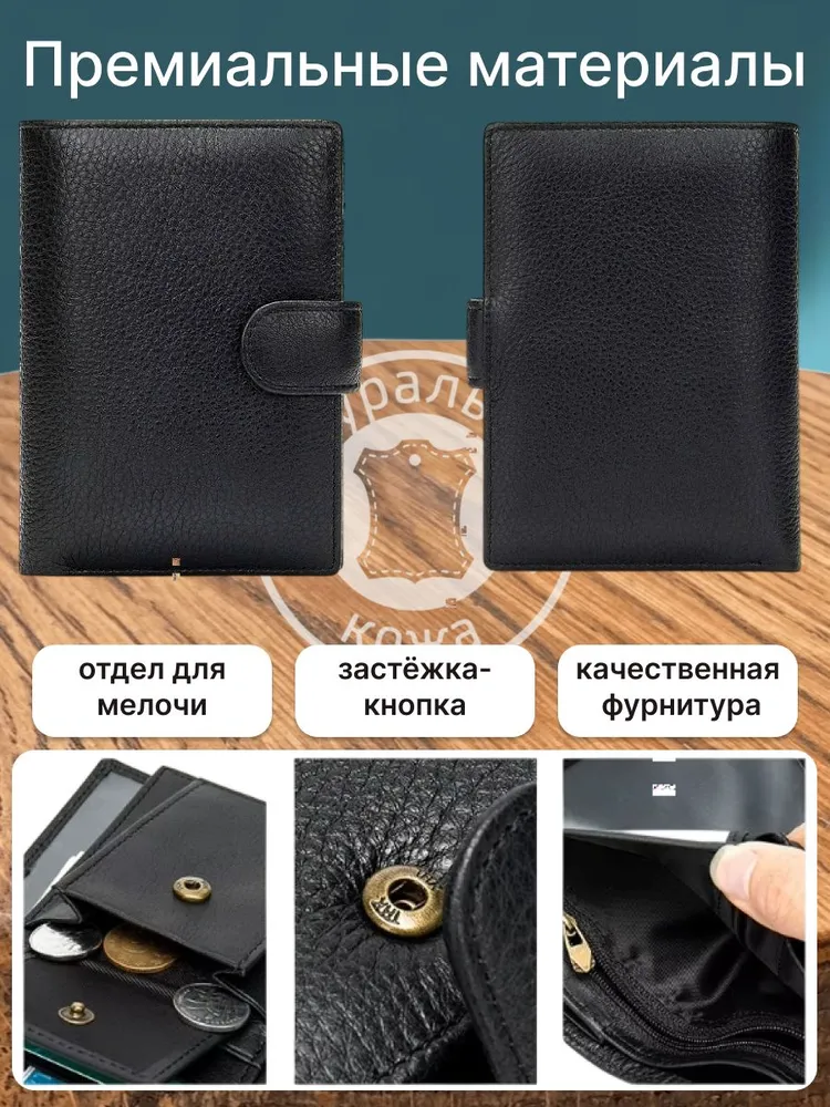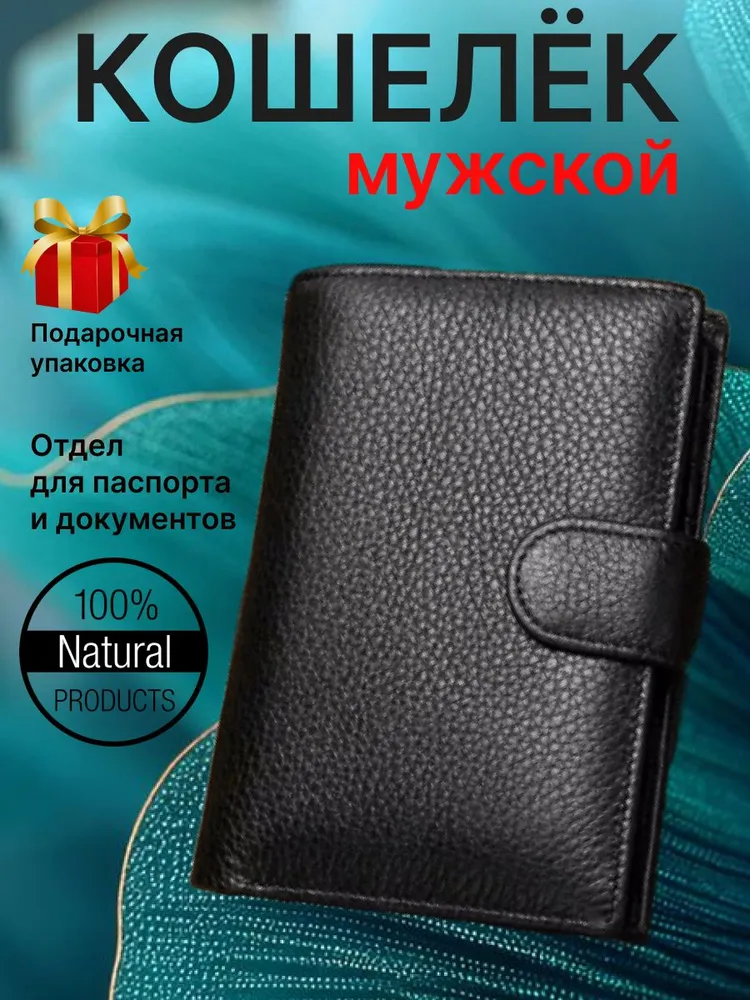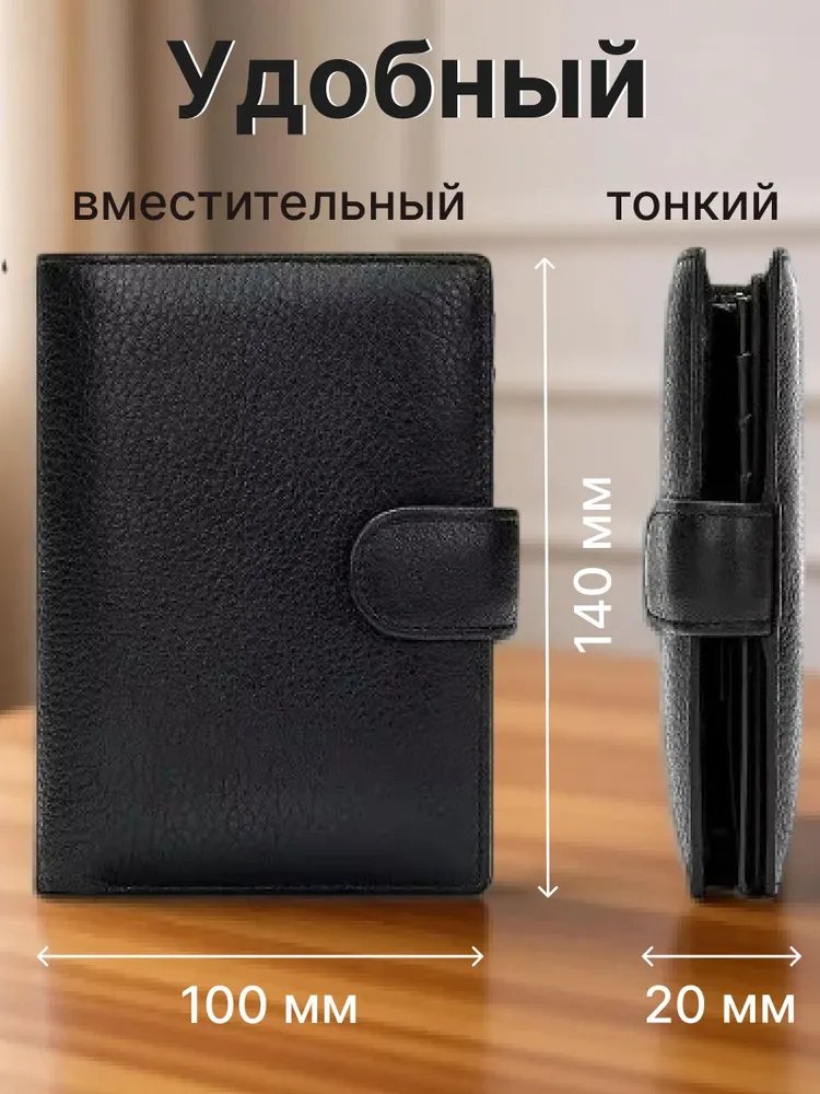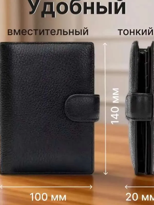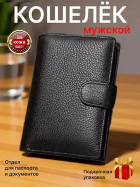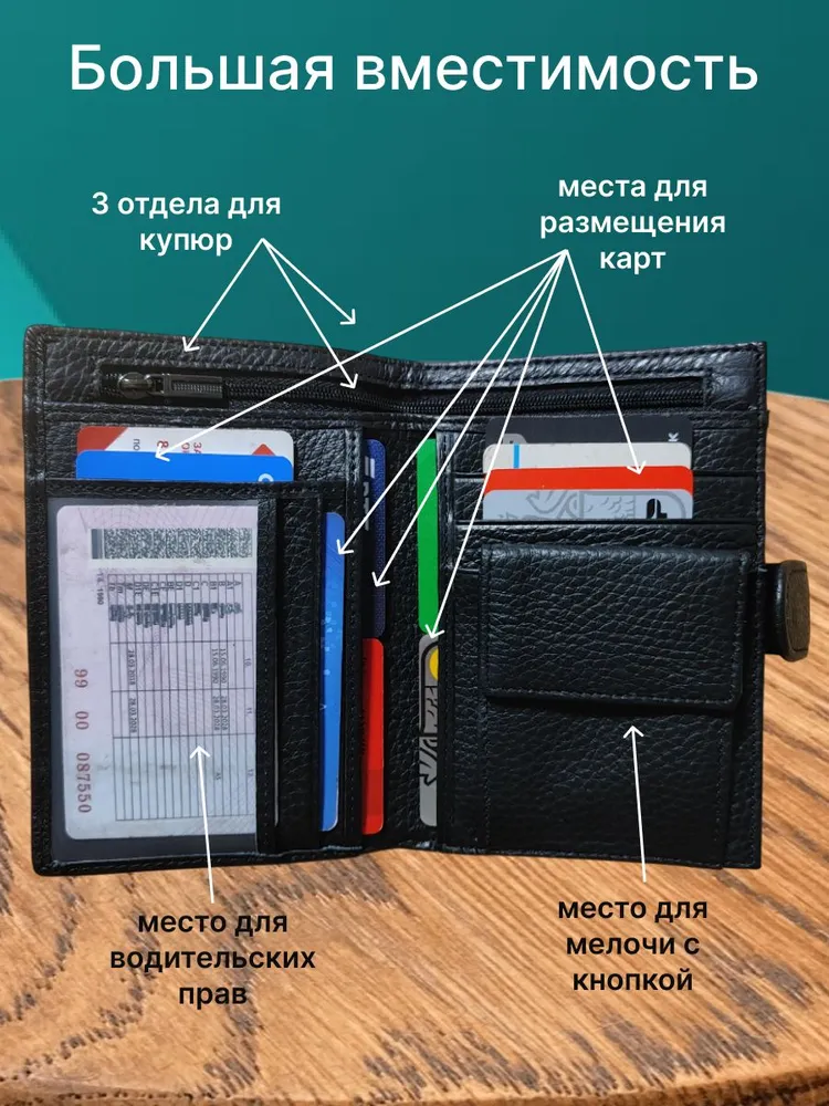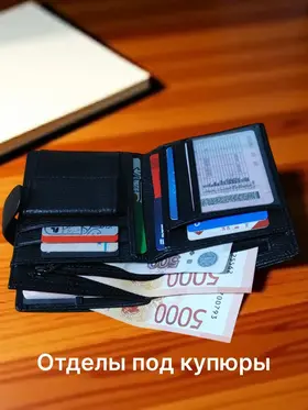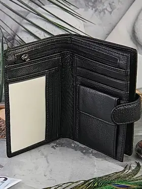 Кошелек мужской из 100% натуральной кожи. Мужской кошелек с хорошим функционалом изготовлен из качественной натуральной кожи отличной выделки. Имеет качественную прошивку и застежку. Материал прочный, надежный, износостойкий, не поддается истиранию и механическим повреждениям. Данная модель оснащена отсеками для разных предметов. Сочетает оптимальный размер, вместительность и функциональность. Мужское портмоне - это удобный способ хранения денег, купюр, монет, банкнот, банковских карт, визитных карточек, прав и прочих ценных мелочей. Элегантный, стильный и практичный бумажник с лаконичным дизайном, функциональный и простой в использовании. Кошелек мужской кожаный среднего размера имеет презентабельный вид, подходит для ежедневного применения. Кожаное портмоне чёрного цвета дополнит образ современного успешного мужчины, это отличный подарок на любой праздник! Качественные материалы. Портмоне выполнен из мягкой натуральной кожи и сшит прочными нитками. Он выдержит испытание временем и прослужит Вам долгие годы. Кожа, используемая для создания кошелька устойчива к царапинам и потертостям, а также отлично сохраняет форму изделия. Молния отсека для купюр выполнена из нержавеющей стали. Удобство. Размеры позволят носить бумажник как в барсетке, так и во внутреннем кармане пиджака или в заднем кармане джинсов. А его функционал позволяет использовать его как картхолдер и визитница, а также в него можно поместить паспорт , водительские права и документы на автомобиль. Лаконичный дизайн. Стильный аксессуар, который имеет классический дизайн , что делает его очень практичным и подходящим под любой стиль. Цвет и форма подойдет под любой образ. Вместительный и универсальный. Банковские карты и наличные всегда под рукой. Удобное размещение до 11 карт , 3 отделения для купюр, отделение для водительских прав и документа на автомобиль, а также отделение для паспорта. Оптимальное количество слотов и карманов, чтобы портмоне оставалось компактным. Максимальная функциональность в стильном исполнении. Паспорт всегда с собой. Отдел для паспорта. Супер вместительность. Может вместить 11-12карт.