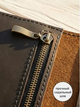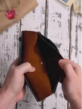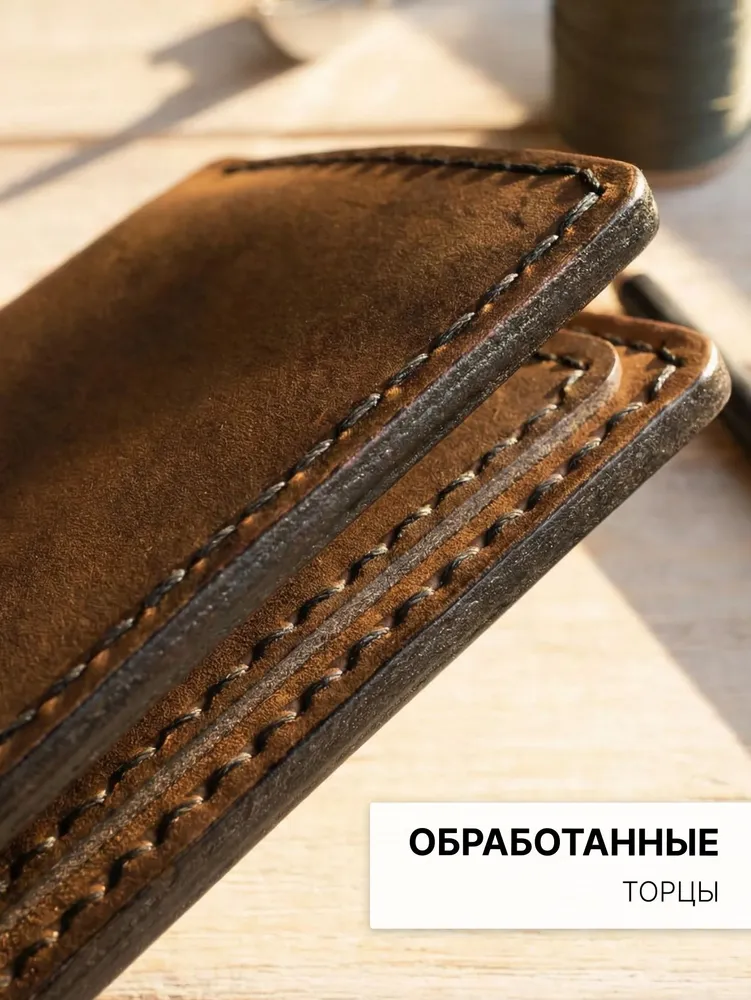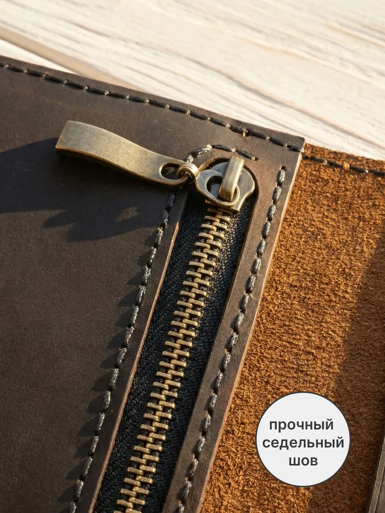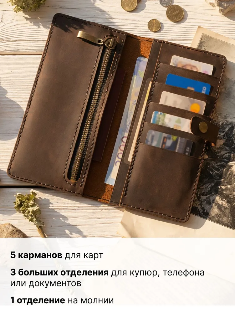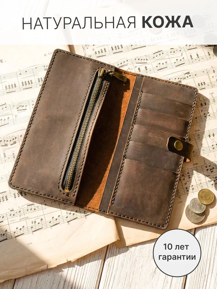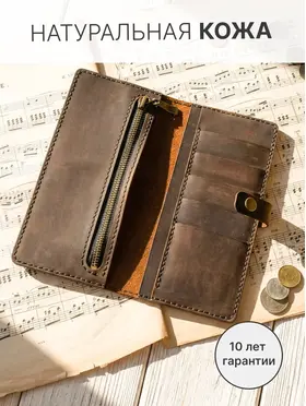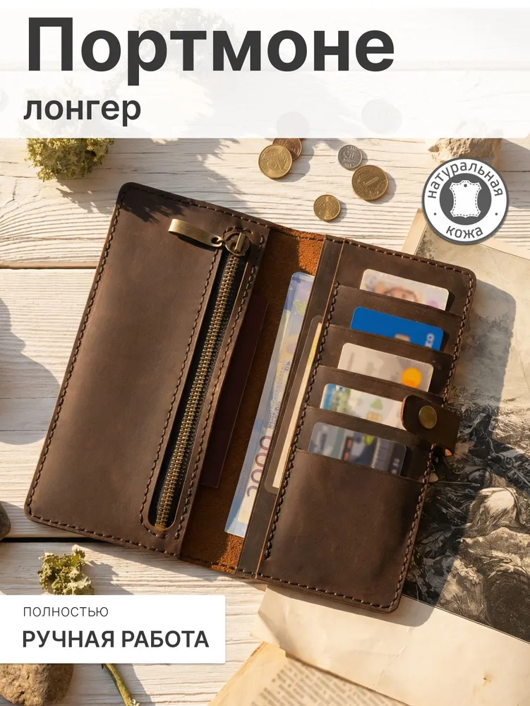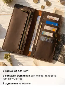 Портмоне мужское из натуральной кожи — кожаный бумажник ручной работы Мужское портмоне-лонгер «Кондор» — это стильный кожаный кошелек, выполненный полностью вручную из высококачественной натуральной воловьей кожи вида «Крейзи Хорс» (Crazy Horse Leather) с благородным ореховым оттенком. Благодаря особой технологии выделки кожа со временем светлеет в местах изгибов, заломов и частых прикосновений, что придает этому мужскому бумажнику неповторимый шарм предмета с богатой историей — чем дольше вы пользуетесь портмоне, тем характернее и красивее оно становится. Это портмоне мужское для документов и денег создается вручную с исключительной тщательностью и вниманием к каждой детали, включая прошивку. Мы используем только лучшую натуральную кожу, которая не только выглядит роскошно, но и дарит приятные тактильные ощущения. Мужской кошелек кожаный «Кондор» — это портмоне мужское для денег, карт и документов с продуманной внутренней организацией: 5 карманов для банковских карт, 2 просторных отделения для купюр, телефона и документов, а также отделение на прочной молнии для хранения мелочи. Бумажник мужской из натуральной кожи идеально помещается во внутренний карман пиджака, оставаясь незаметным и удобным в повседневном использовании. Ручная работа гарантирует, что каждый кожаный мужской кошелек уникален и обладает собственным характером. Портмоне «Кондор» станет отличным подарком или надежным спутником на долгие годы — как для мужчин, так и для женщин, ценящих качество и натуральные материалы. ОСОБЕННОСТИ — Натуральная воловья кожа «Крейзи Хорс» (Crazy Horse Leather) — Полностью ручная работа, включая прошивку — 5 карманов для карт — 2 больших отделения для купюр, телефона и документов — 1 большое отделение на прочной молнии для мелочи Размеры: 20 × 10 см в закрытом состоянии Вес: 185 г