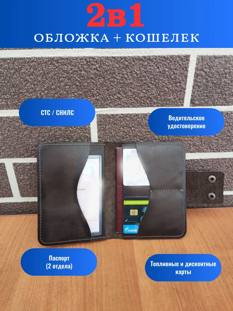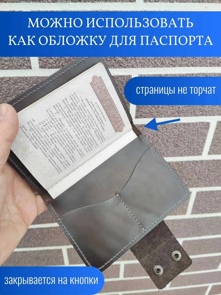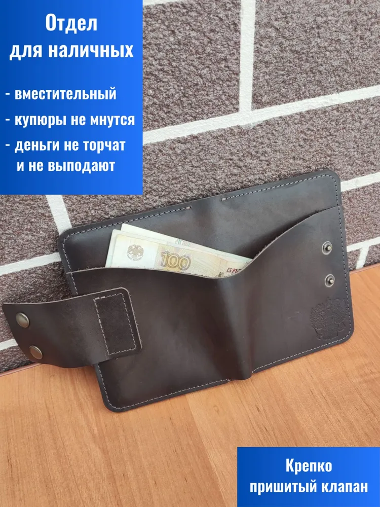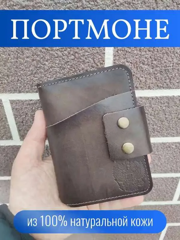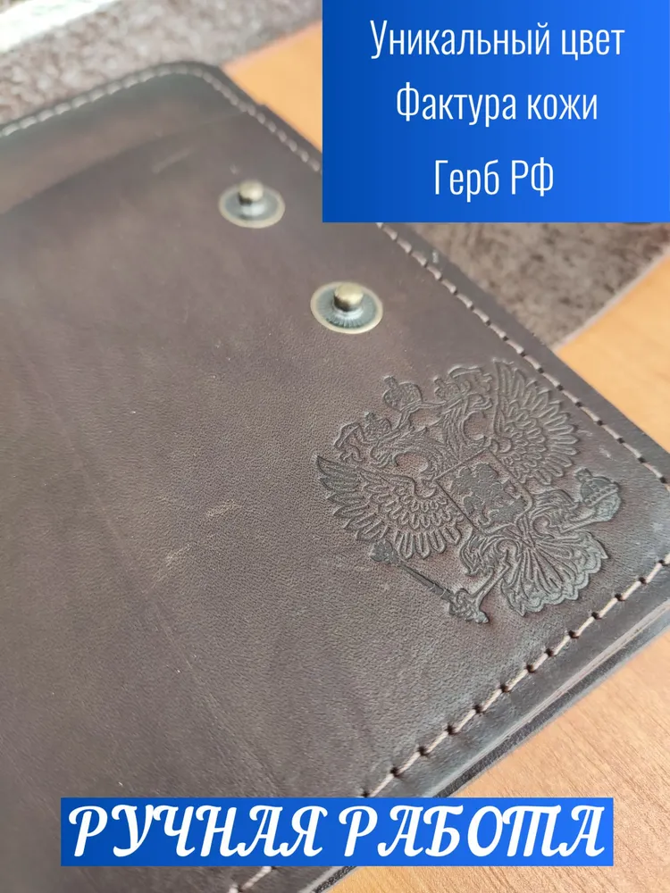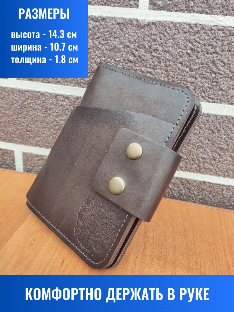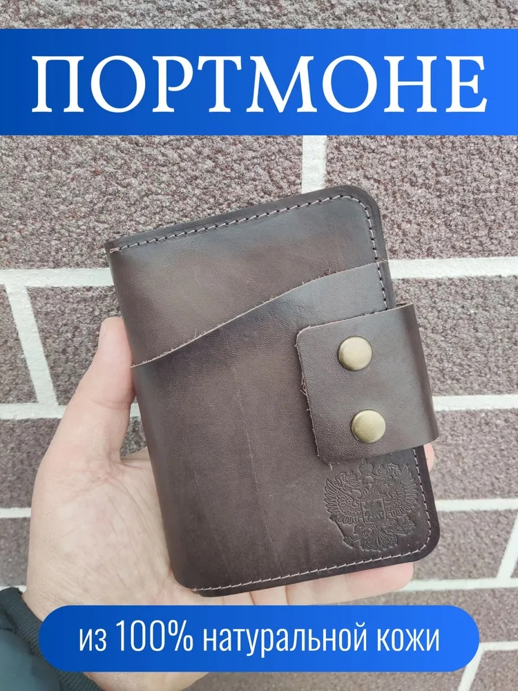 Элегантное решение для повседневного использования! Портмоне выполнено из мягкой натуральной кожи тёмно-коричневого оттенка «ром», сочетает минималистичный дизайн и практичность. Функциональные отделения: удобно храните паспорт, автодокументы, водительские права, банковские карты и наличные. Компактные размеры идеально подходят для сумочек любого формата. Прочные металлические кнопки обеспечивают надёжную защиту, а ручная работа подчёркивает индивидуальность каждой детали. Изделие сохраняет высокую прочность благодаря качественной кожаной подкладке и рассчитано на долгосрочное использование. Портмоне украшено тиснением в виде Герба Российской Федерации. Аксессуар закрывается на 2 металлические кнопки (качественная фурнитура), что обеспечивает надежную защиту для документов, а также позволяет использовать портмоне как классическую обложку для паспорта.