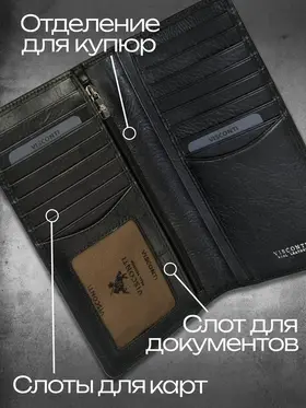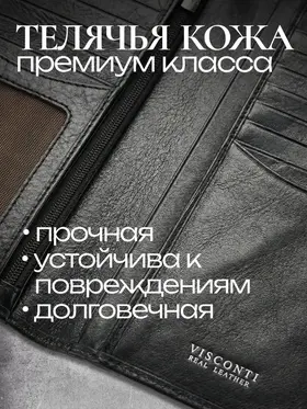 Портмоне Visconti Real Leather TSC45 Стильный многофункциональный бумажник Visconti Real Leather TSC45 из коллекции Tuscany, сделанный из прочной телячьей кожи растительного дубления. Бумажник имеет два отделения для купюр, одно из которых на молнии, 16 отделений для хранения пластиковых карт, отделение для проездного/пропуска или водительского удостоверения. Для тех, кто ценит безопасность, данная модель оснащена защитой RFID от несанкционированного доступа к бесконтактным кредитным картам, когда они находятся в бумажнике. Данный бумажник будет прекрасным подарком для делового мужчины. В комплекте идет фирменная подарочная коробка. Натуральная кожа 100% Для производства используется специально отобранная кожа, изготовленная по традиционным технологиям, что придаёт изделиям уникальный, неповторимый характер и внешний вид. Сделано вручную Все изделия изготавливаются вручную, что обеспечивает непревзойдённое качество и придаёт дополнительную уникальность каждому изделию. Гарантия 3 месяца Мы официальный представитель Visconti Real Leather в России и уверены в качестве изделий под этой маркой. Именно поэтому мы даем гарантию 3 месяца на весь ассортимент моделей. Более 20 лет на рынке Английская компания Visconti Leather занимается производством аксессуаров из натуральной кожи уже более 20 лет. За это время компания зарекомендовала себя как производитель качественной кожгалантереи.