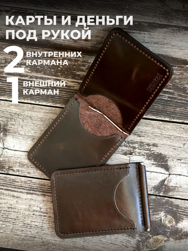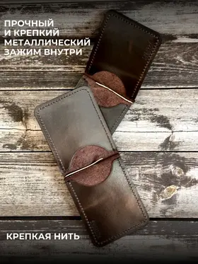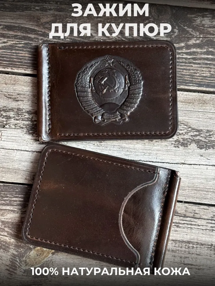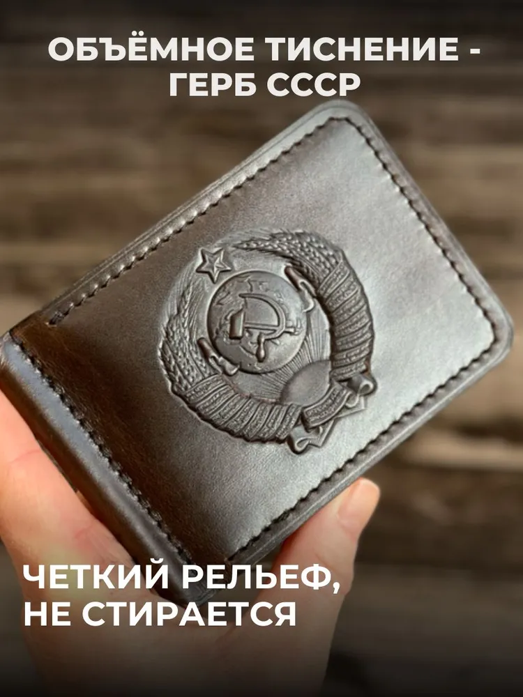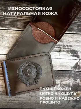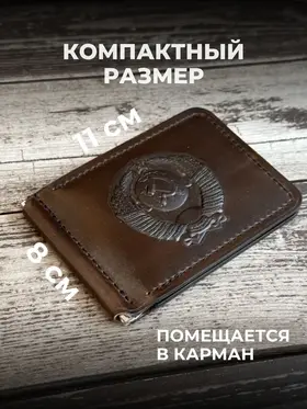 Кожаный зажим для купюр с гербом СССР| Держатель денег и карт | Российский производитель Зажим для банкнот из натуральной кожи – стиль, статус и удобство!Идеальная замена громоздкому кошельку! Наш кожаный зажим для денег надежно фиксирует купюры и карты, сохраняя их в идеальном порядке. -Натуральная кожа -Объемное тиснение герба СССР -Компактный и функциональный бумажник с зажимом – вмещает 10-15 банкнот и 2-3 карты, легко помещается в карман.-Подходит мужчинам и женщинам. -В комплекте крафтовая коробка Идеальный подарок на:→ День рождения→ 23 Февраля, 9 Мая→ День финансиста, предпринимателя→ Корпоративные праздники→ Новый год, юбилей -Материал: 100% натуральная кожа с эффектом винтаж -Отделка: рельефное тиснение герба CCCP -Цвет: черный (возможны другие варианты) -Размер: 8 × 11 см (компактный, удобный для ношения) -Комплектация: зажим в крафтовой коробке Ключевые преимущества: -Стильный минимализм – никаких лишних деталей, только практичность. -Надежная фиксация – купюры не мнутся и не теряются. -Российское производство