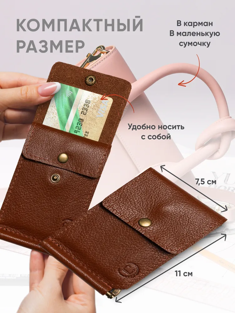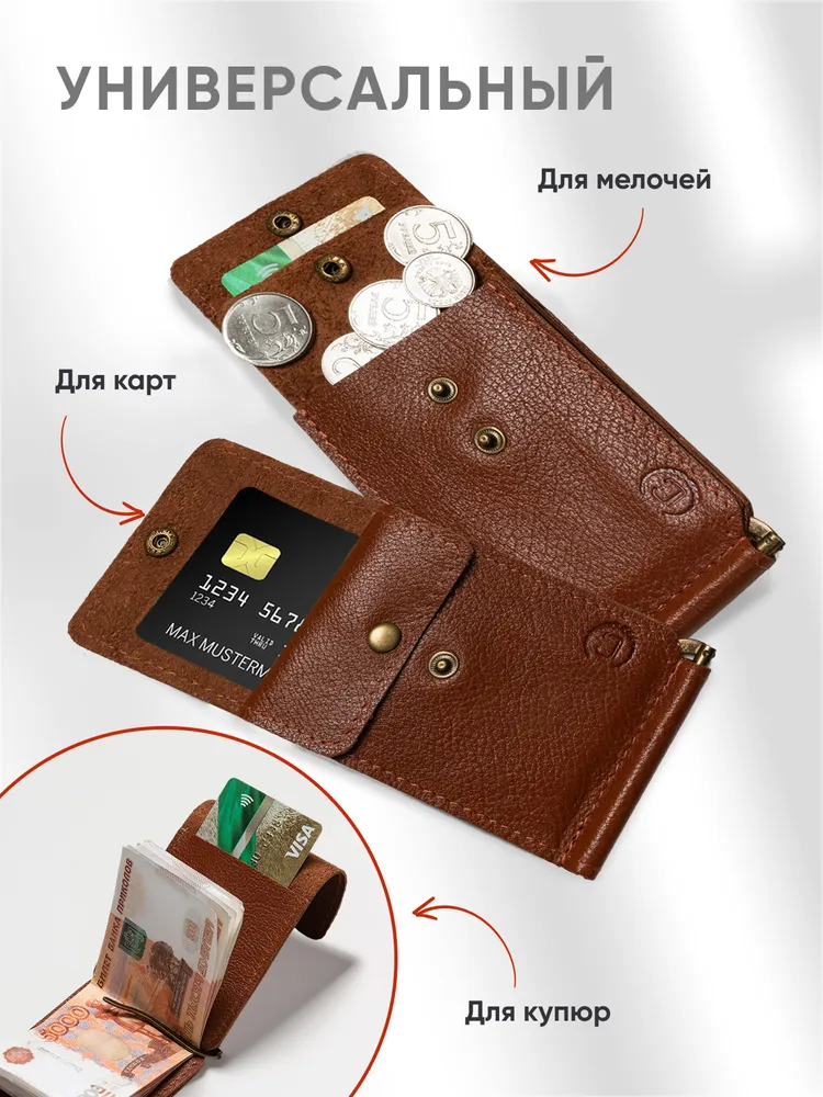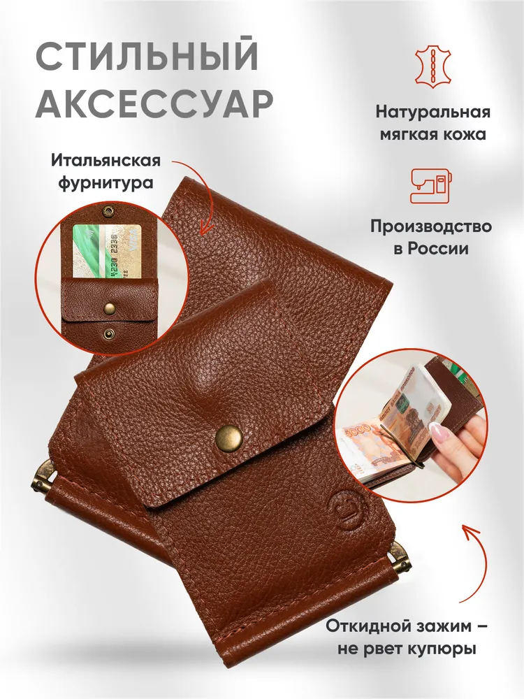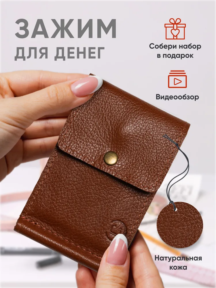 Откидной зажим из натуральной кожи Зажим для денег - незаменимый аксессуар, изготовленный из натуральной кожи. Идеально подходит для тех, кто хочет организовать свои финансы, не теряя стиль и комфорт. Этот кошелек для денег сочетает в себе удобство использования и привлекательный дизайн. Наш зажим для купюр имеет компактные размеры, что позволяет легко поместить его в карман или сумку, не занимая много места. Однако, несмотря на свою небольшую величину, он вмещает достаточное количество купюр и карточек, позволяя держать все деньги в одном месте. Зажим для денег мужской женский изготовлен из высококачественных материалов, что гарантирует его долговечность и стойкость к повреждениям. Внутренняя отделка сделана таким образом, чтобы обеспечить надежную фиксацию купюр и карточек, предотвращая их выпадение. Практичность и компактность Мужской кошелек привлекает внимание своей элегантностью и стильным исполнением. Благодаря своей универсальности, он подходит для мужчин и женщин, делая его отличным подарком на любой праздник. Неотъемлемый элемент гармонии между практичностью и эстетикой, наш кошелек женский мужской из натуральной кожи - выбор тех, кто ценит стиль и удобство. Чехол для денег это превосходный подарок на новый год, 14 февраля, 8 марта, 23 февраля, день рождение или юбилей, который порадует любого получателя своим изысканным видом и функциональностью. ВНИМАНИЕ: Фурнитура у нового изделия туго разжимается, это нормально, в процессе эксплуатации будет работать плавно. Мы часто обновляем наш ассортимент, поэтому рекомендуем, добавить наш бренд в избранное, чтобы не пропустить наши новинки! Удачных и стильных покупок с Leather Collection