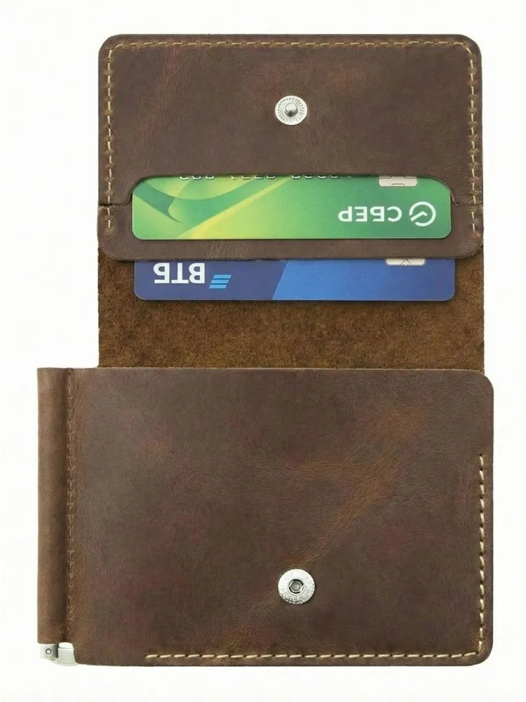 Зажим для денег + картхолдер кожаный Corium, цвет темно-коричневый Зажим для денег из натуральной кожи с функцией картхолдера. Внутри 4 кармана для карт, отделение для сложенных пополам купюр, металлический зажим для купюр с фиксацией в открытом положении. Дополнительное откидное отделение внутри увеличивает емкость, позволяя разместить большое количество пластиковых карт. Мужской функциональный зажим для денег и держатель карт Corium открывается в 3 сложения и закрывается на кнопку. Зажим для купюр - отличный подарок, практичный и оригинальный! Материал: натуральная кожа Размеры: 120 х 85 х 15 мм Натуральная кожа премиум Натуральная кожа Пуллап обладает необычной фактурой поверхности с легкой мраморной окраской. Это натуральная кожа с восково‑масляной пропиткой: когда её сгибают или тянут, цвет на заломах немного светлеет, появляется красивый «живой» эффект.