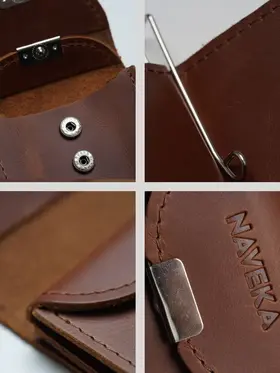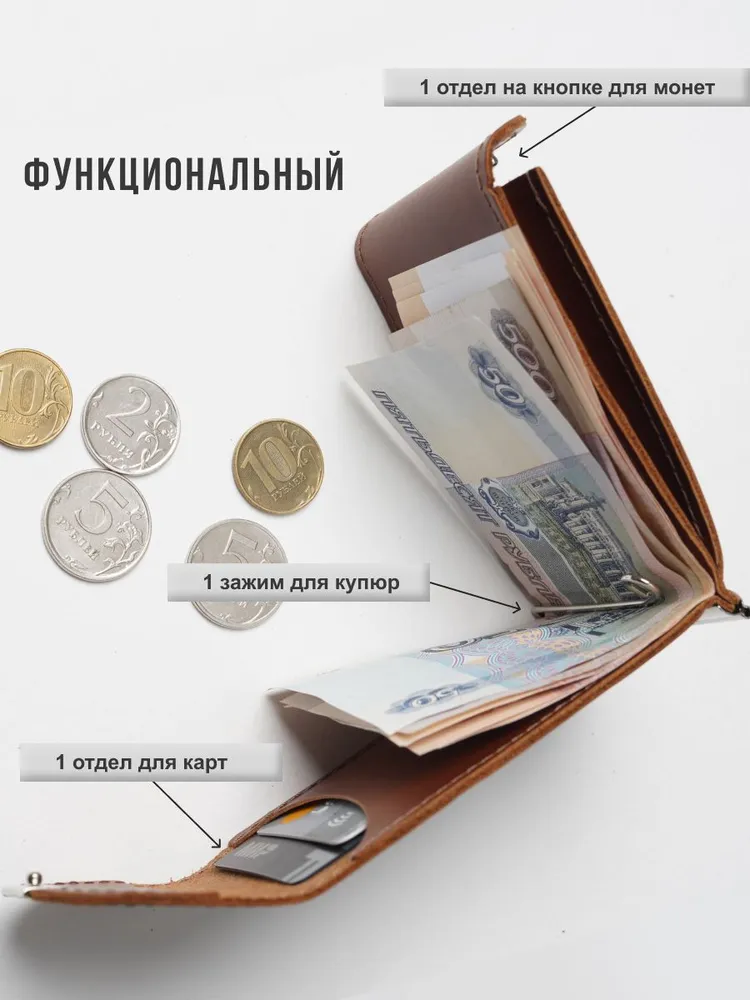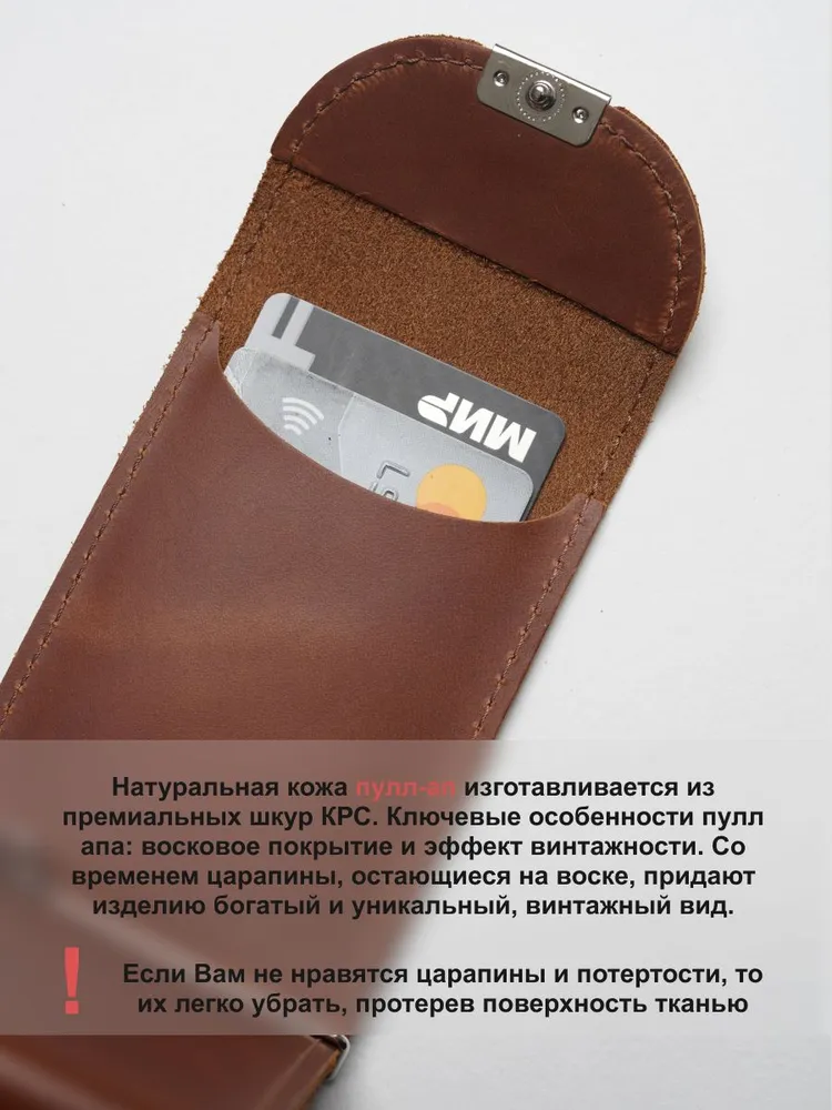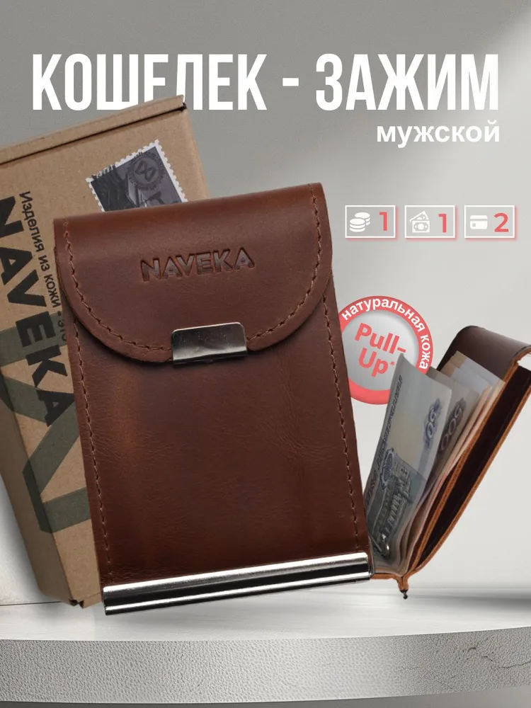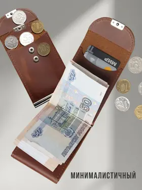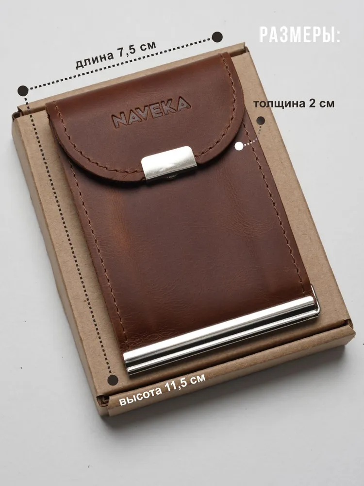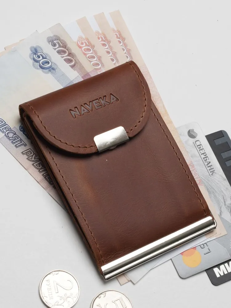 Кошелек с зажимом для денег из натуральной кожи, стильный аксессуар для мужчин и женщин. Внутри зажима есть отделения для купюр, карт и монет. Размер: высота 11 см ширина 7.5 см глубина 2 см. Портмоне изготовлен из высококачественной натуральной кожи, что делает его долговечным и прочным для повседневного использования. Благодаря своей маленькой и компактной форме кошелёк с монетницей легко помещается в карман или сумку, надежно закрывается на кнопку. Сделан из натуральной кожи Pull Up (с винтажным эффектом старения). Наше производство находится в России, все изделия изготавливаются вручную нашими мастерами, а отдел качества тщательно проверяет каждое изделие. Мы любим своё дело и очень стараемся, что бы вы получили качественные изделия, которые прослужат Вам не один год. Небольшой, тонкий и стильный зажим для купюр, он может служить как карманный кардхолдер, мини купюрница, холдер для визиток, бумажник, молодежный тревел кошелёк с металлическим держателем наличных и обложка для кредиток, благодаря тому что он компактный несомненно он поместится в любой карман. Коричневый кошелек отличается своей износостойкостью и долговечностью, а качественная фурнитура надежно защитят карты и деньги от выпадения и утери. Упакован в экологичную крафтовую подарочную коробку. Благодаря такому подарочному набору, вам не придётся задумываться о дополнительной упаковке. Подойдёт как подарок мужчине на день рождения, такой подарок будет выглядеть стильно и дорого, идеальный подарок мужчине. Также он может быть как подарок девушке, подарок учителю или подарок папе, подарок парню. Вы сможете сразу же подарить кошелёк близкому человеку на любой праздник, будь то Новый год, День рождение, Рождество или просто, что бы порадовать себя. Он подойдет как для мужчин, так и для женщин, и даже для подростков. Он станет стильным дополнением к вашему образу и прекрасным подарком для любого повода.