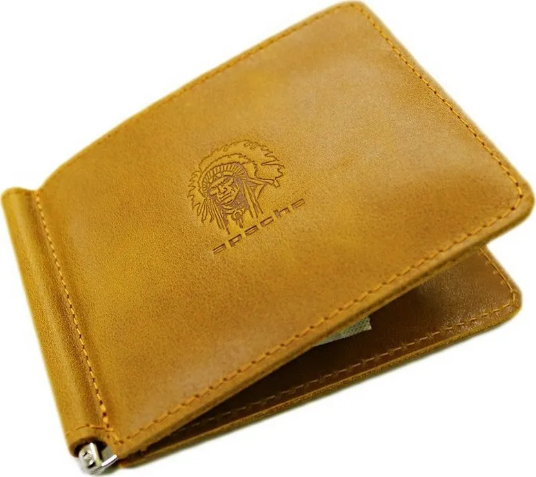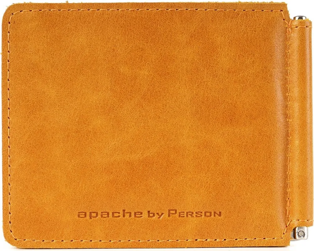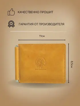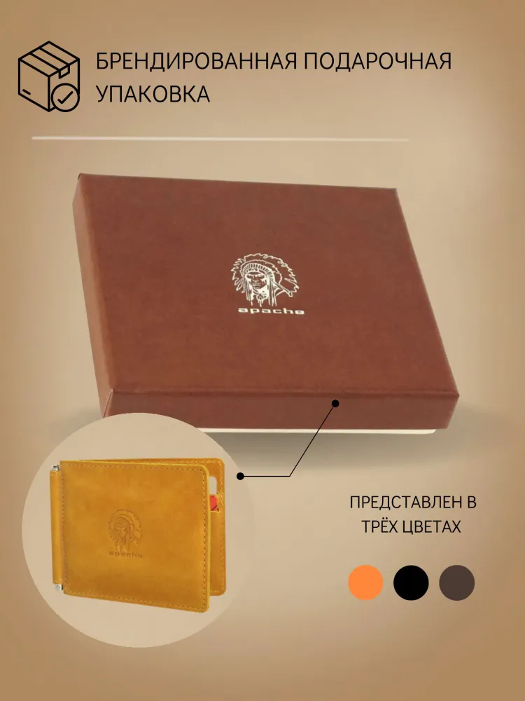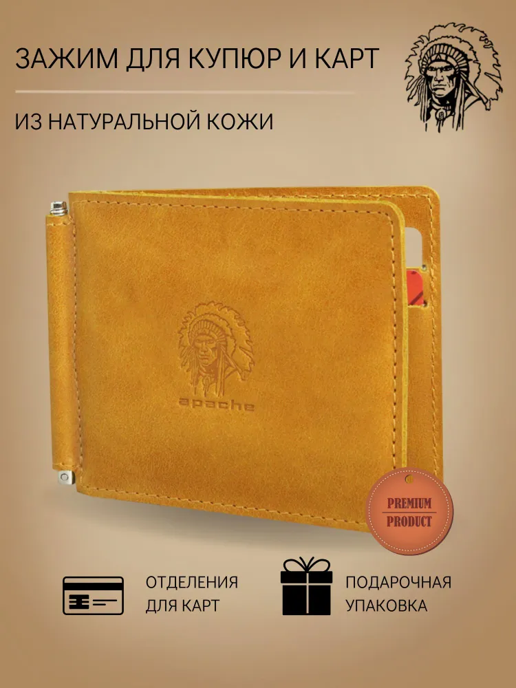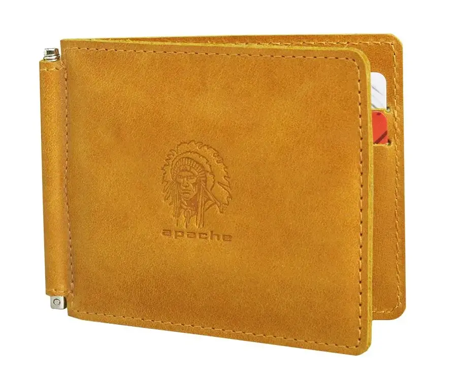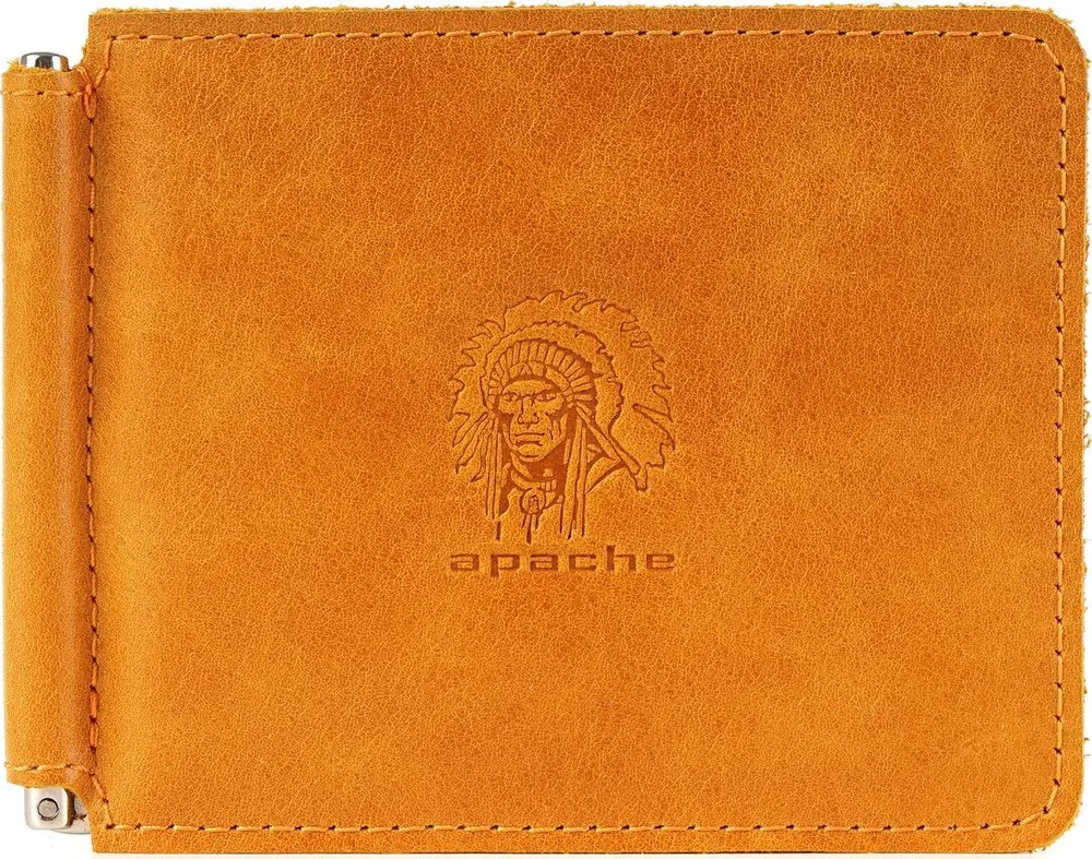 Зажим для денег кожаный ОК-А Apache табачно желтого цвета Зажим для купюр с местом для банковских карт, необходимый аксессуар для женщин и мужчин. Зажим для денег бренда Apache, лёгкий, имеет небольшой размер, поместится в любой карман. Зажим для денег из натуральной кожи, украшен двумя тиснениями (снаружи на лицевой и задней стенках) и декоративной строчкой. Внутри, на передней и задней стенках, горизонтальные кожаные карманы для пластиковых карт. По центру установлен прочный, металлический зажим для купюр который отличается качеством и долговечностью Зажим упакован в брендированную коробку из плотного картона с логотипом бренда. Такой зажим из натуральной гладкой кожи отлично подойдёт для подарка себе или своим близким. 23 февраля, День Рождения и Новый год, хороший повод подарить другу, папе, мужу, дедушке, маме или коллеге презент который прослужит долгую жизнь.