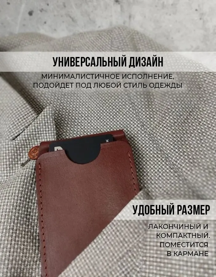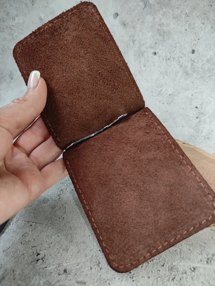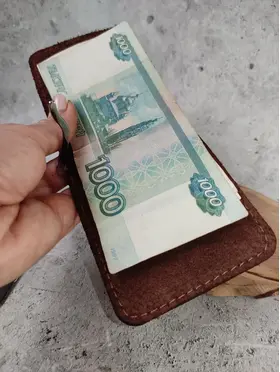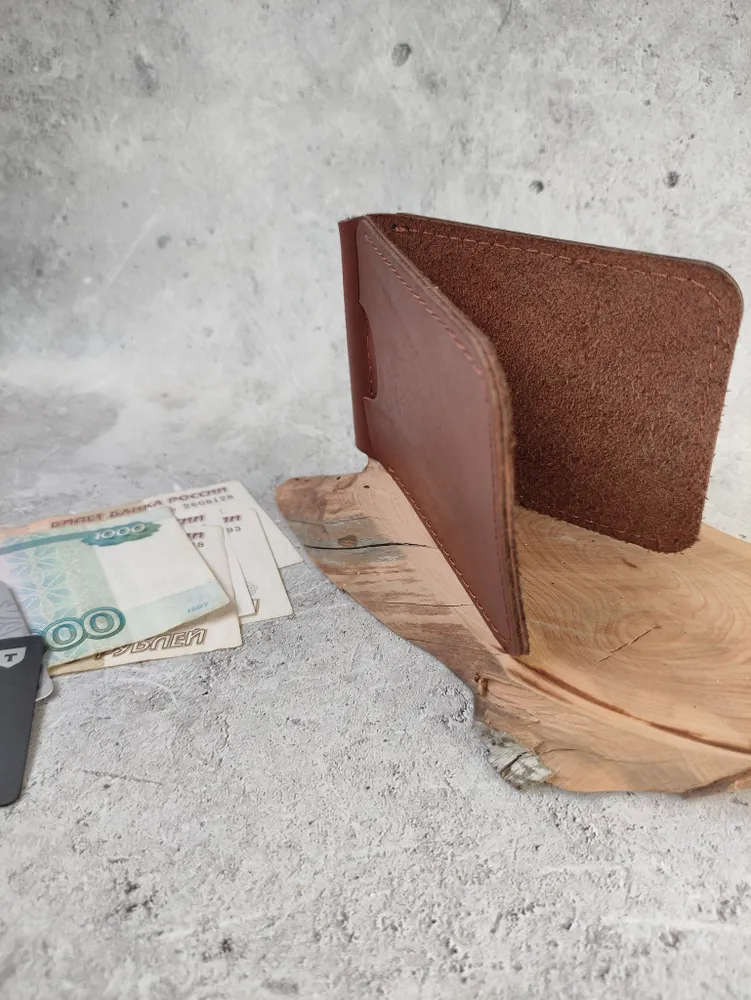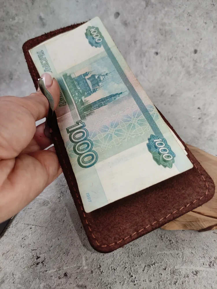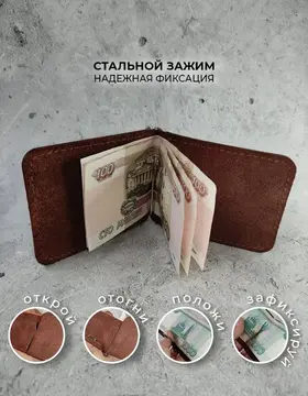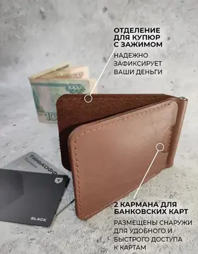 Кошелек-зажим для денег ручной работы из натуральной кожи - стильный и функциональный аксессуар для хранения ваших карт и купюр. В зажиме имеются два кармана для пластиковых карт и отдельный зажим для купюр, что обеспечивает удобство и быстроту доступа к вашим средствам. Благодаря высококачественной коже, кошелек-зажим долговечен и устойчив к износу, сохраняя свой внешний вид на долгие годы.