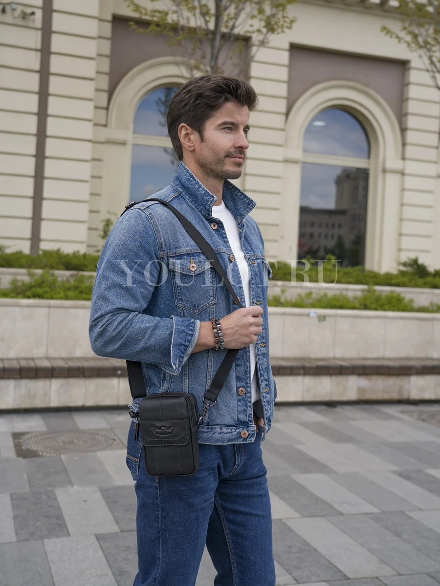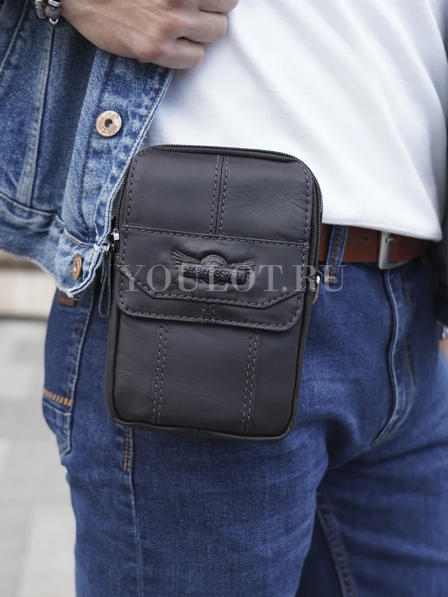 На передней части расположен карман для телефона, закрывающийся клапаном с магнитной кнопкой — практичное решение для быстрого доступа и надёжной фиксации гаджета. Универсальный формат ношения позволяет использовать сумку через плечо или на поясе, что особенно удобно в движении и в поездках.