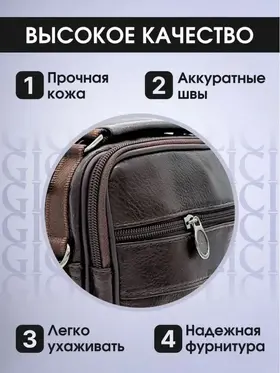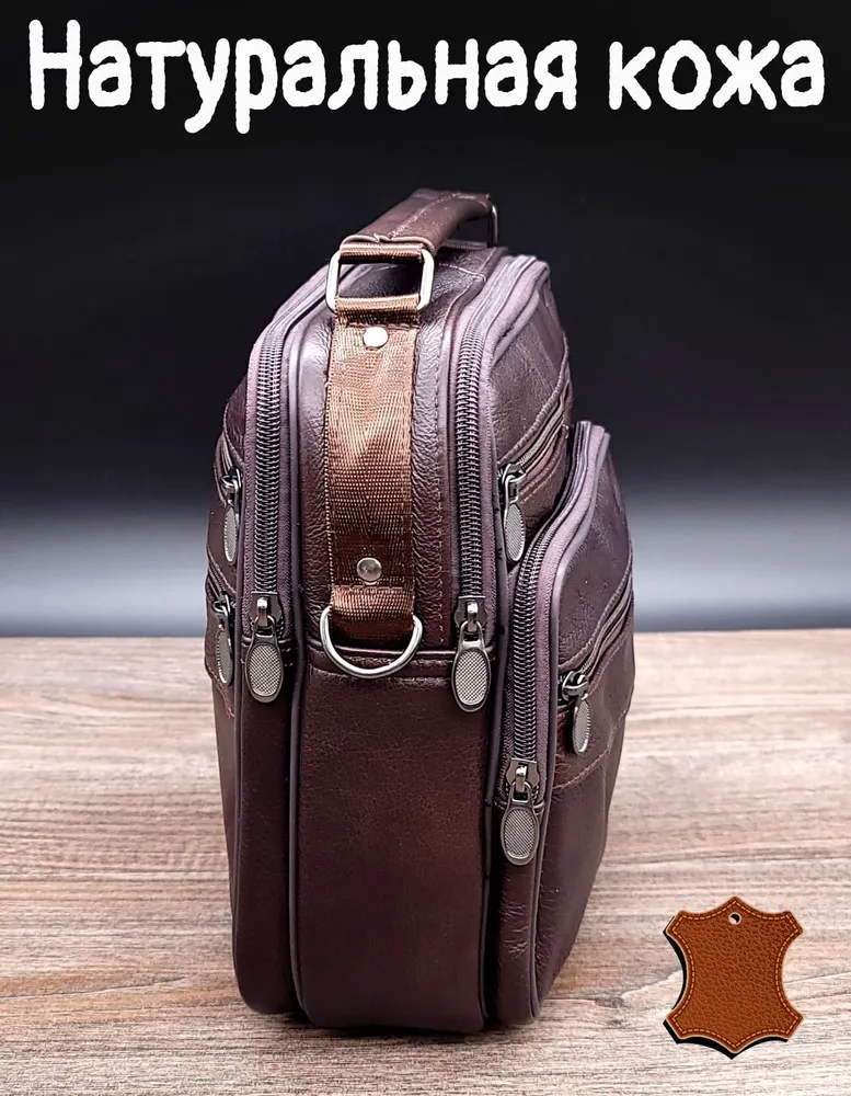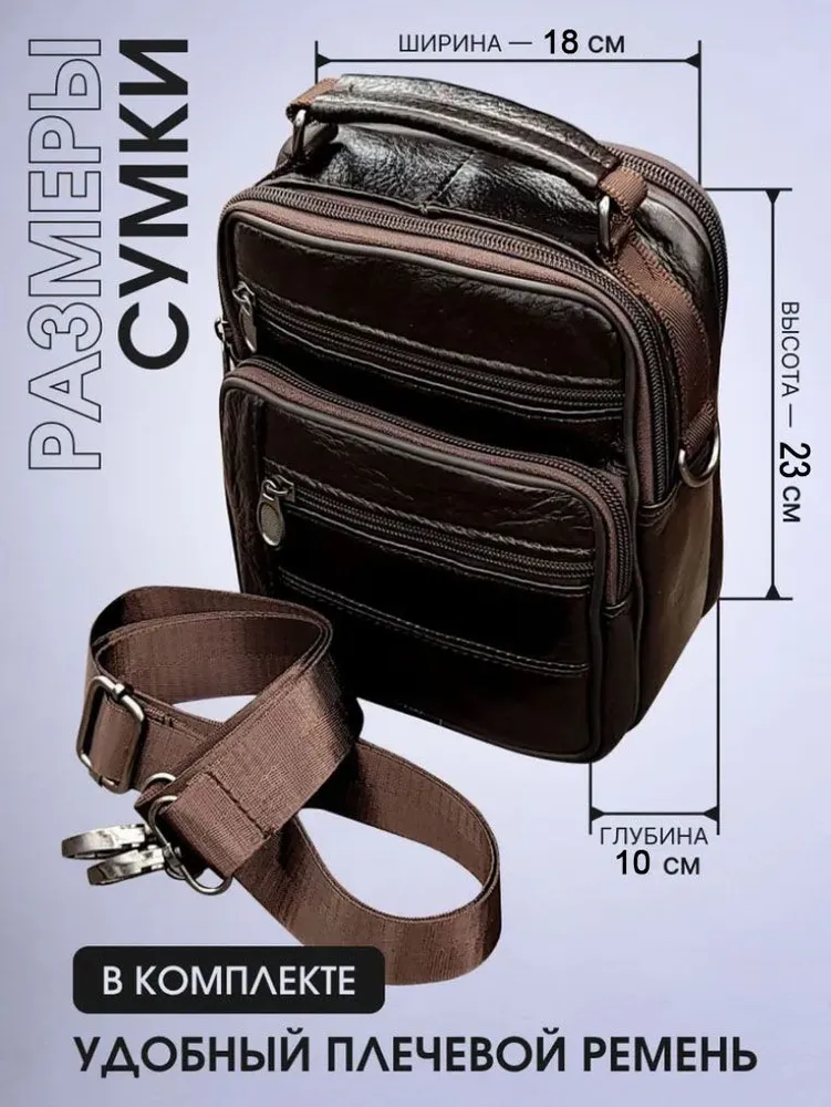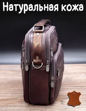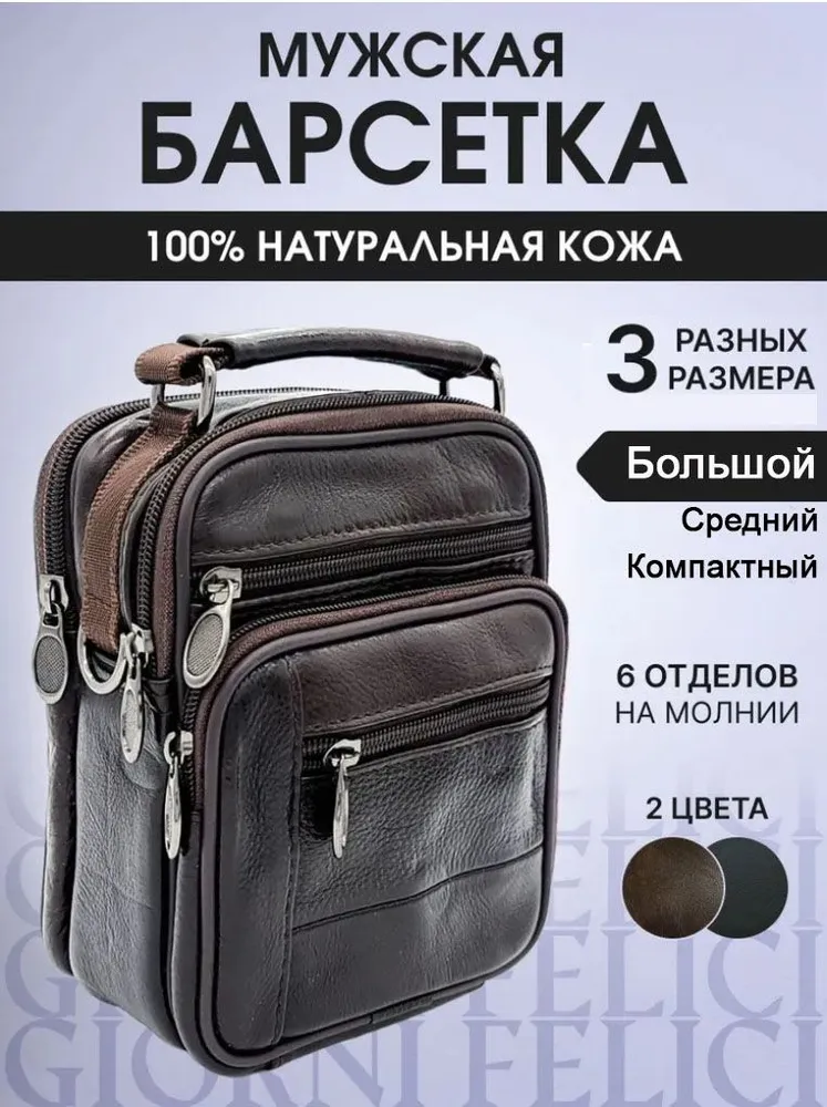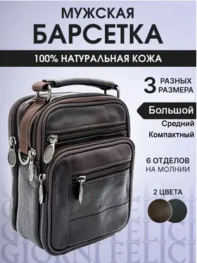 Сумка-барсетка мужская из мягкой натуральной кожи. Внутри два отделения на молнии, спереди три кармана на молниях. На задней стенке один карман также на молнии. Сумка снабжена ремнем на плечо, который можно отрегулировать под любой рост и размер. Практичная и удобная в использовании мужская барсетка, создана, чтобы носить с собой только самые необходимые вещи: паспорт, документы для авто, мобильный телефон, ключи. Отличный вариант для делового и повседневного использования.