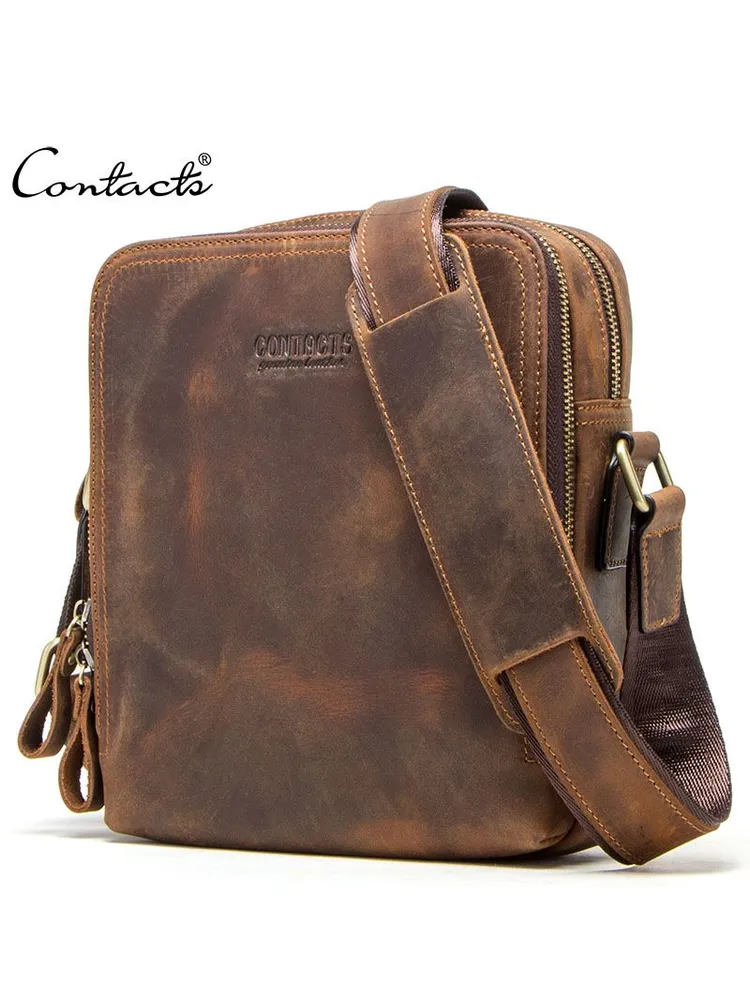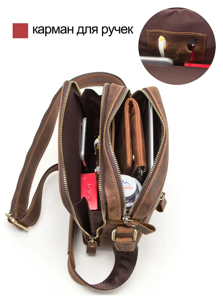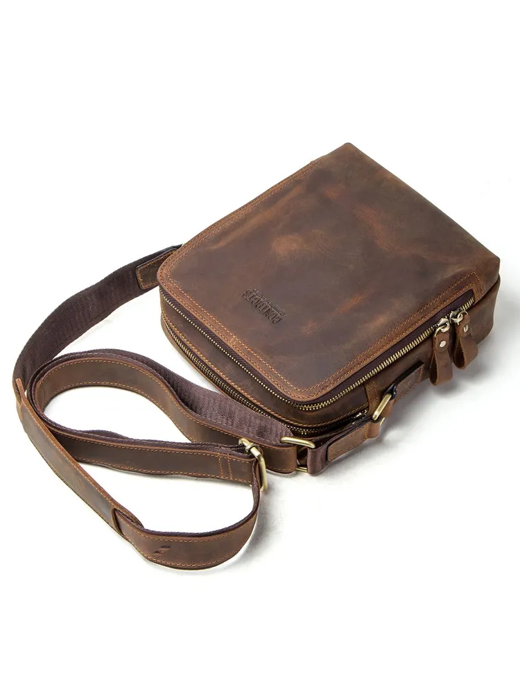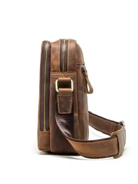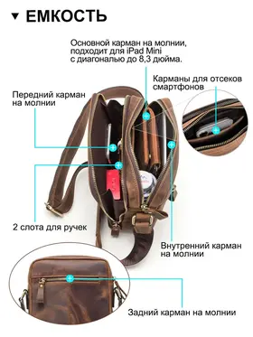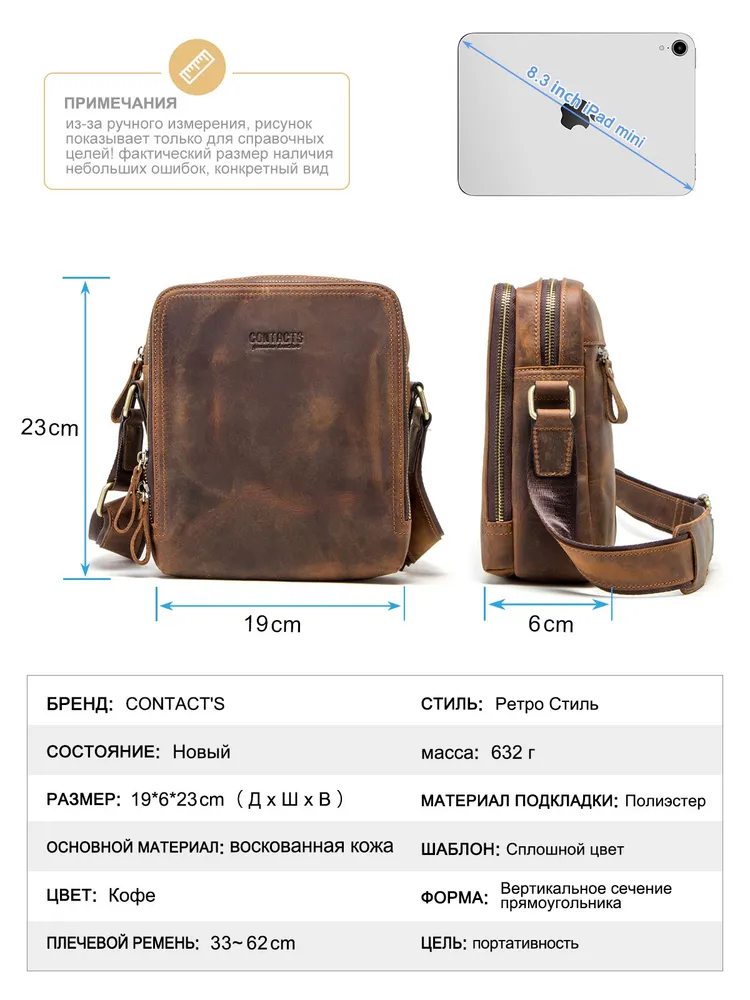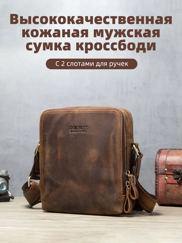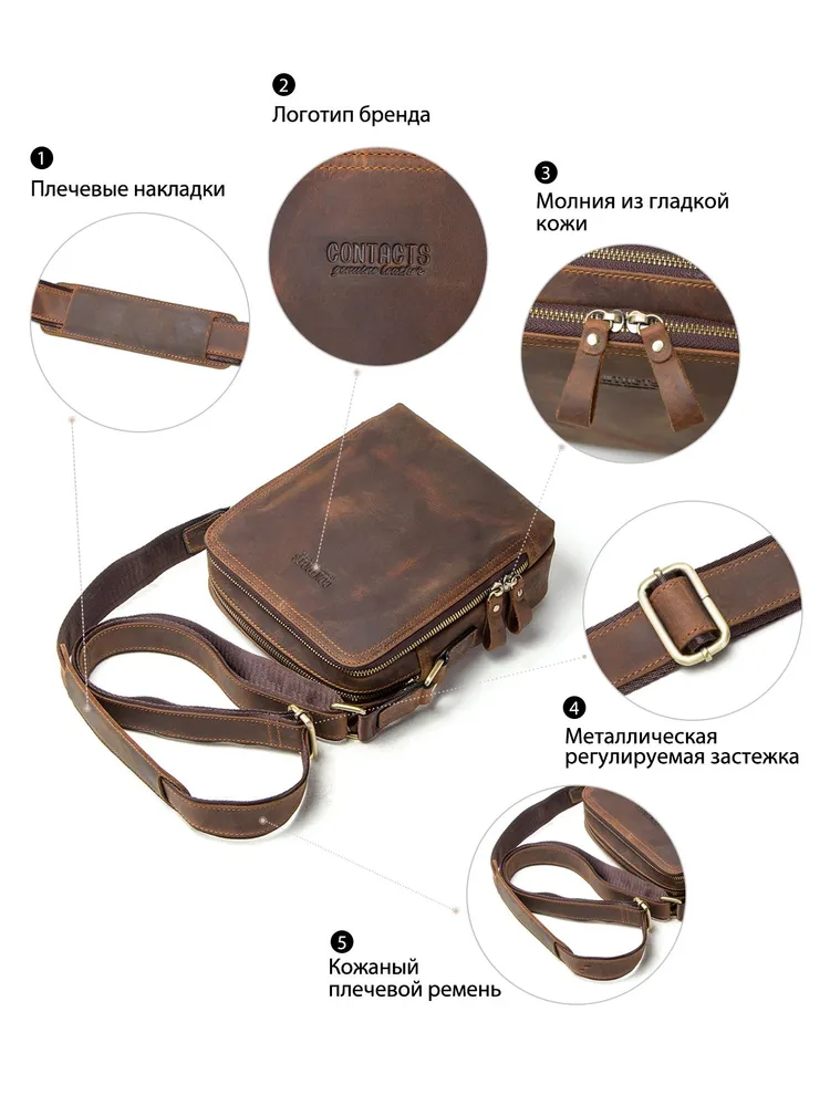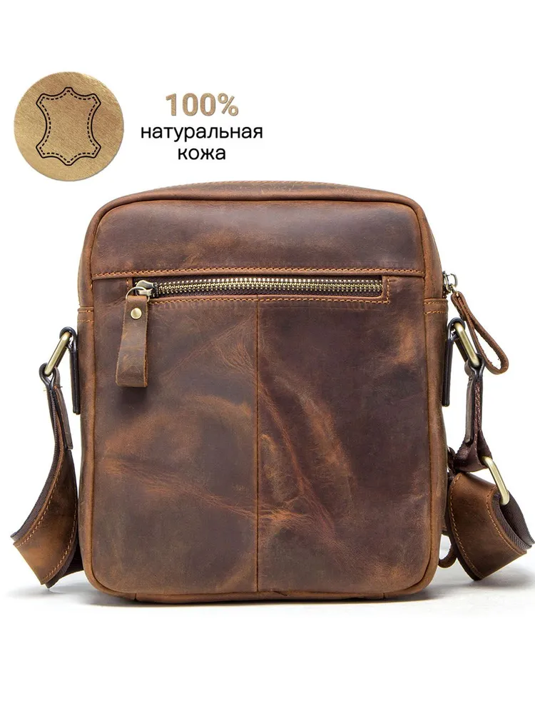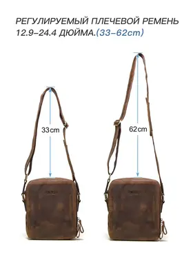 Продукт: Натуральная кожаная сумка на плечо Описание продукта: Эта стильная и практичная сумка на плечо изготовлена из высококачественной кожи Crazy Horse и выполнена в классическом коричневом цвете. Основные характеристики: Материалы: Сумка выполнена из кожи Crazy Horse, которая славится своей прочностью и винтажным внешним видом. Размеры: 19.3x8.9x22.9 см, вес 632 грамма. Длина ремня: Регулируемая длина плечевого ремня составляет 84-140 см, что позволяет адаптировать сумку под ваш рост и предпочтения. Просторные отделения: Сумка оснащена двумя большими отделениями на молнии, в одном из которых имеются два держателя для ручек. На задней стороне также имеется небольшой карман на молнии для удобного хранения мелких предметов. Функциональность: Сумка идеально подходит для переноски iPad mini с диагональю 7.9 дюйма, а также других личных вещей.