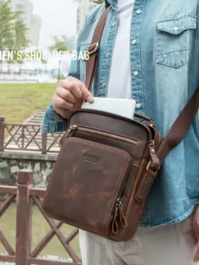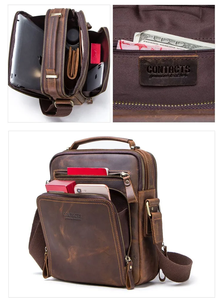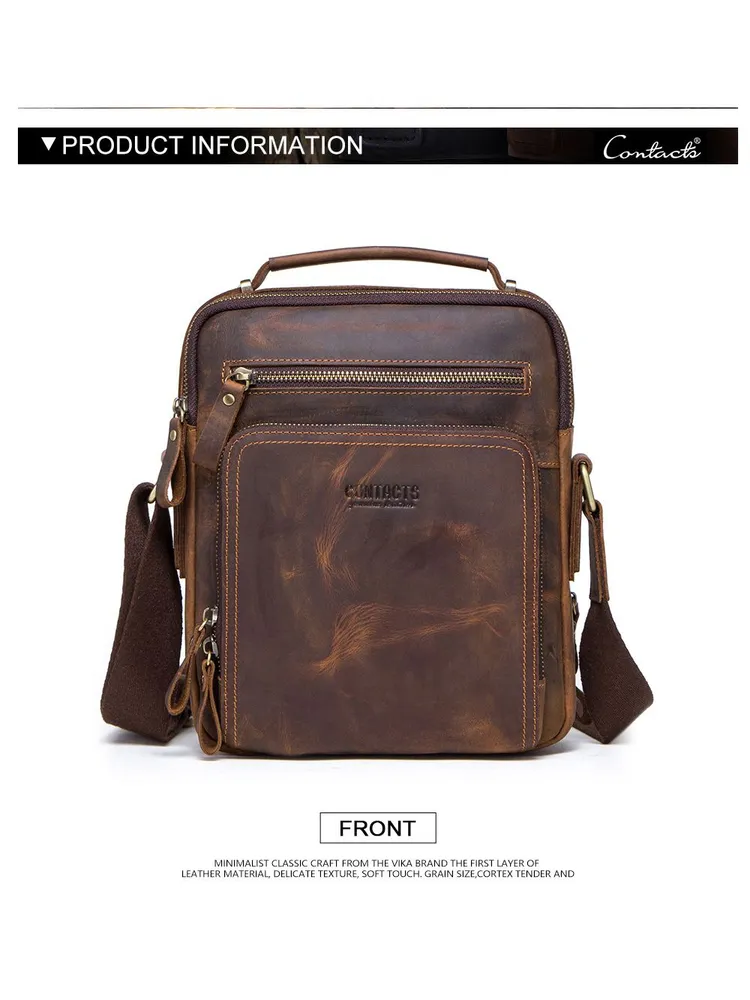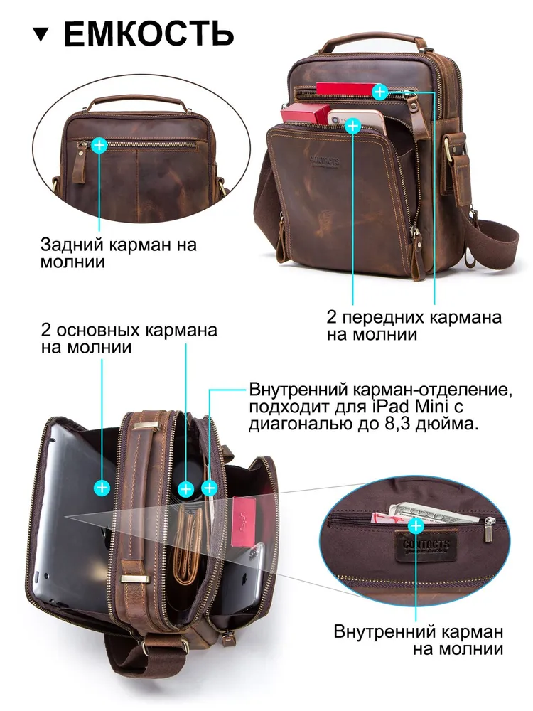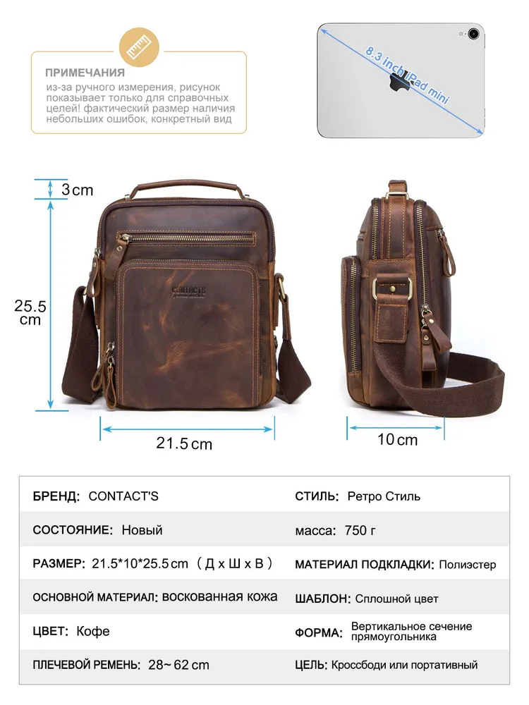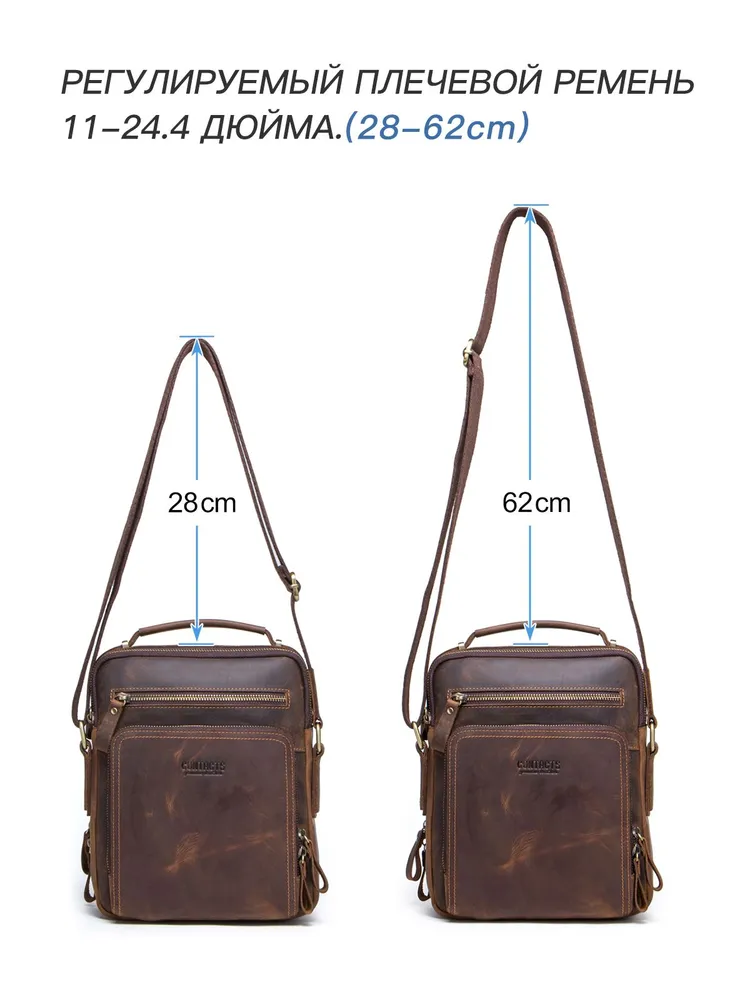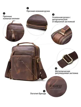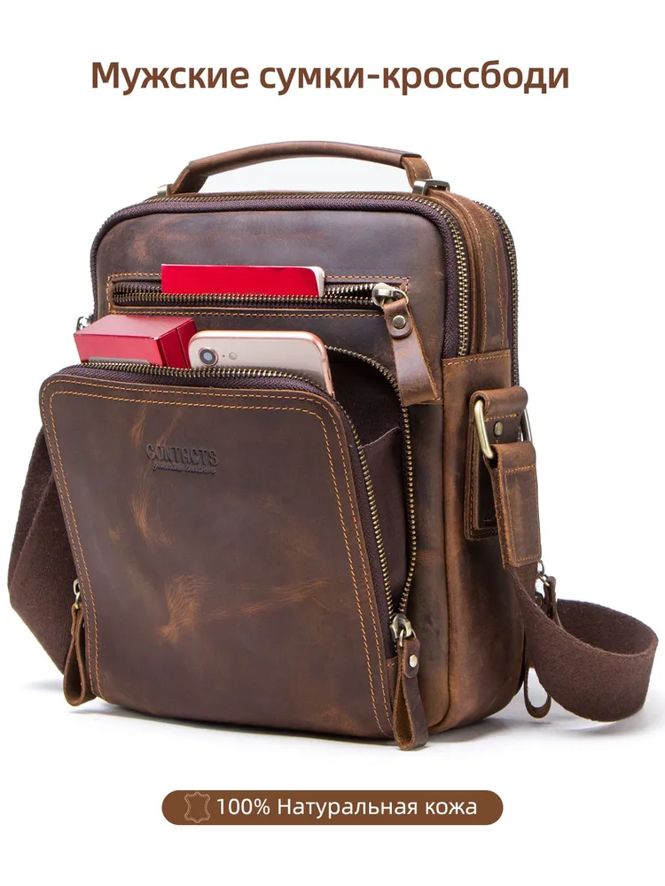 Отдайте предпочтение вечной элегантности и практичности с сумкой через плечо CONTACT'S из натуральной кожи. Изготовленная из высококачественной натуральной кожи, эта сумка в стиле ретро излучает изысканность, обеспечивая при этом прочность. С размерами 21.5*10*25.5 см и весом всего 750 г, она идеально сочетает в себе легкий дизайн и просторную функциональность. С достаточным пространством для размещения планшета диагональю 9.7 дюйма, она станет идеальным спутником для ежедневных поездок или путешествий. Доступна в четырех классических цветах - кофе, коричневый, черный и серый - эта универсальная сумка на ремне легко дополнит любой наряд. Ее ненавязчивый шарм и высокое качество изготовления делают ее неотъемлемым аксессуаром для каждого современного мужчины. Независимо от того, идете ли вы по городским улицам или исследуете новые направления, эта тщательно изготовленная сумка через плечо предлагает стиль и функциональность в равной мере.