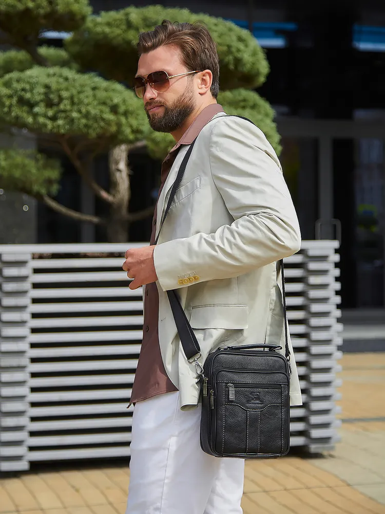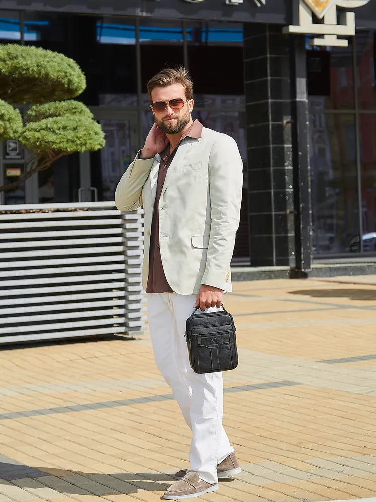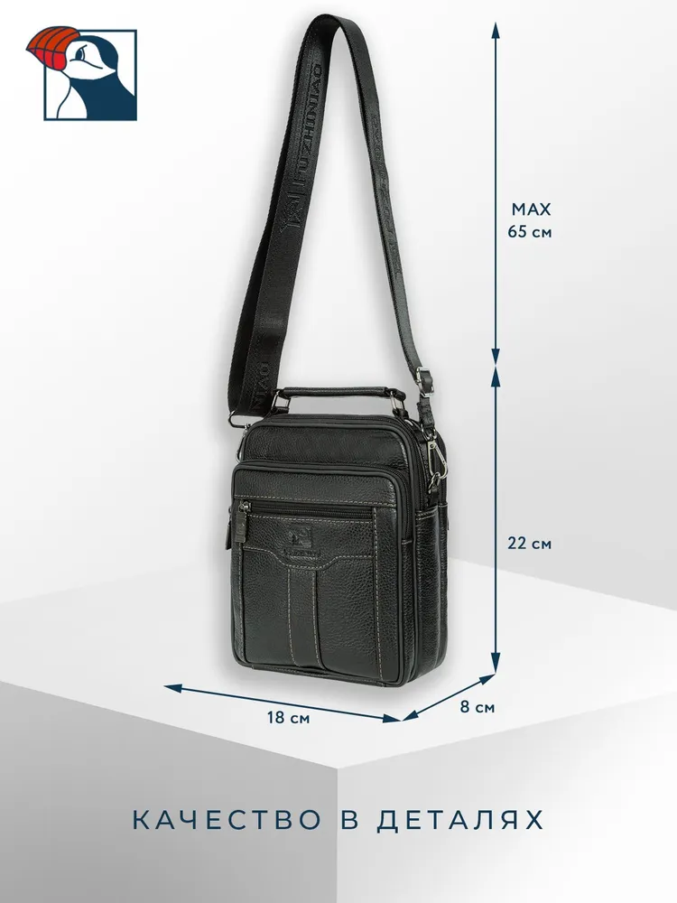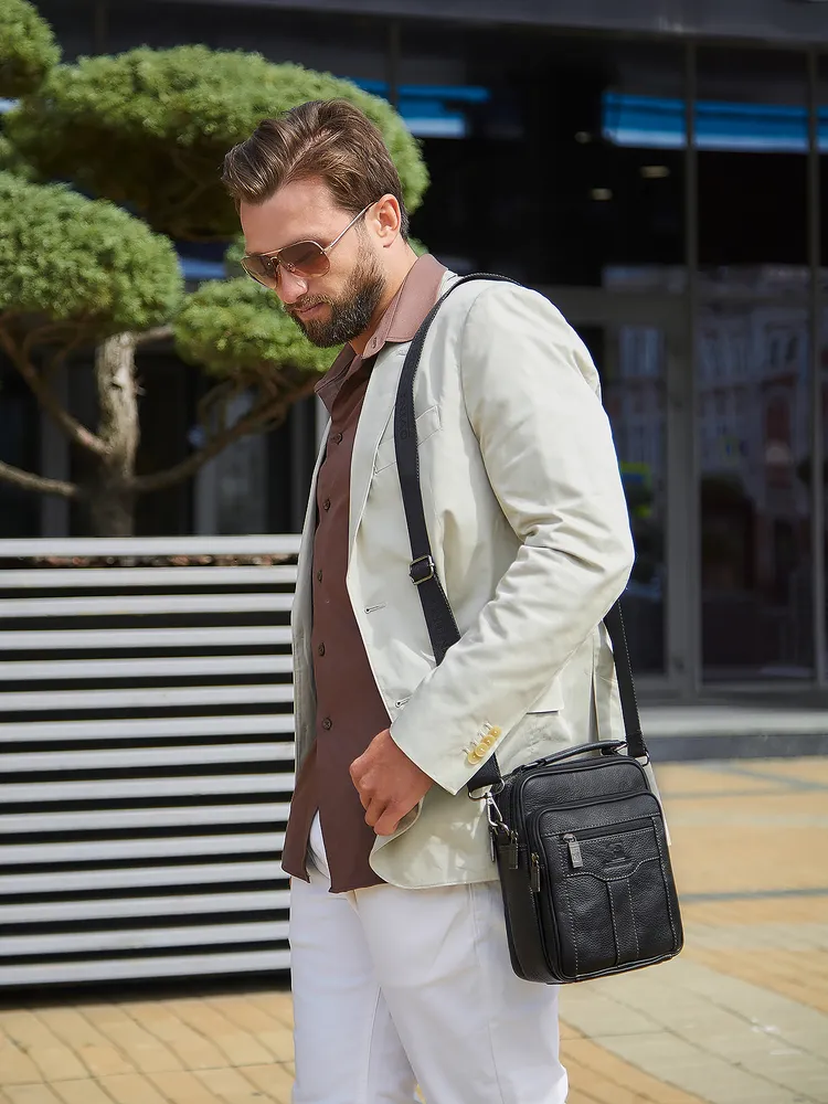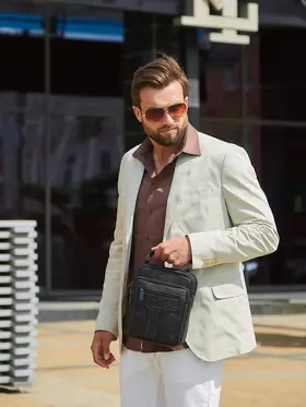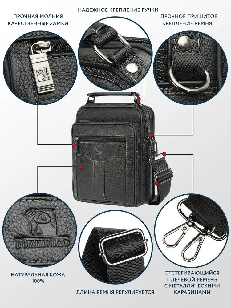 Барсетка мужская через плечо кожаная от FUZHINIAO Представляем мужскую кожаную барсетку Fuzhiniao — стильное и практичное решение для повседневного использования. Эта сумка выполнена из натуральной кожи высочайшего качества, что гарантирует долговечность и элегантный внешний вид. Черный цвет и минималистичный дизайн делают ее универсальным аксессуаром, подходящим для любого стиля и случая. Сумка имеет продуманную конструкцию с тремя внешними карманами и одним внутренними отделениями, что позволяет легко организовать хранение ваших вещей. Внутри предусмотрены специальные отделения для мобильного телефона, ключей, зарядного устройства и аксессуаров, а также внутренний карман для очков и карман для записи адреса и ФИО. Все ваши важные вещи будут в порядке и всегда под рукой. Прочный наплечный ремень обеспечивает комфортную носку на плече, а удобная ручка на запястье позволяет использовать сумку как барсетку. Надежная молния защищает содержимое от выпадения, а качественная фурнитура из металла и пластика гарантирует долгий срок службы изделия. Fuzhiniao — это не только практичная сумка для мужчин, но и аксессуар, который подчеркивает ваш вкус и внимание к деталям. Несмотря на компактный размер, сумка не вмещает формат А4, что делает её идеальным выбором для тех, кто ценит мобильность и удобство. Эта кожаная барсетка станет вашим незаменимым спутником в деловых и повседневных ситуациях. Fuzhiniao — это надежность, стиль и функциональность в одном аксессуаре.