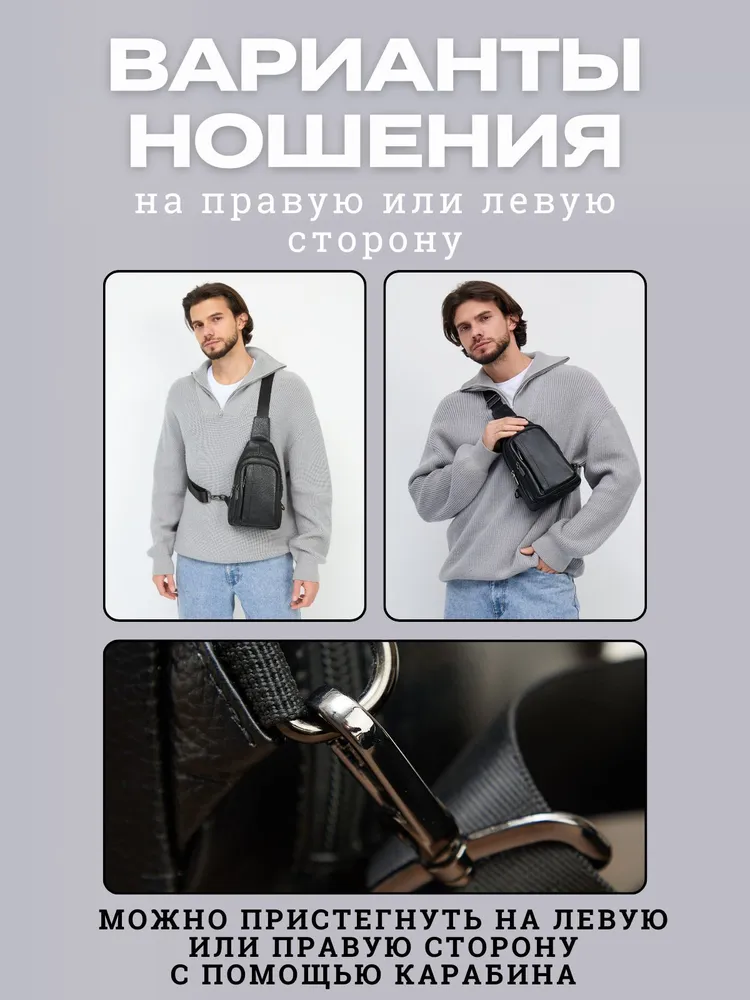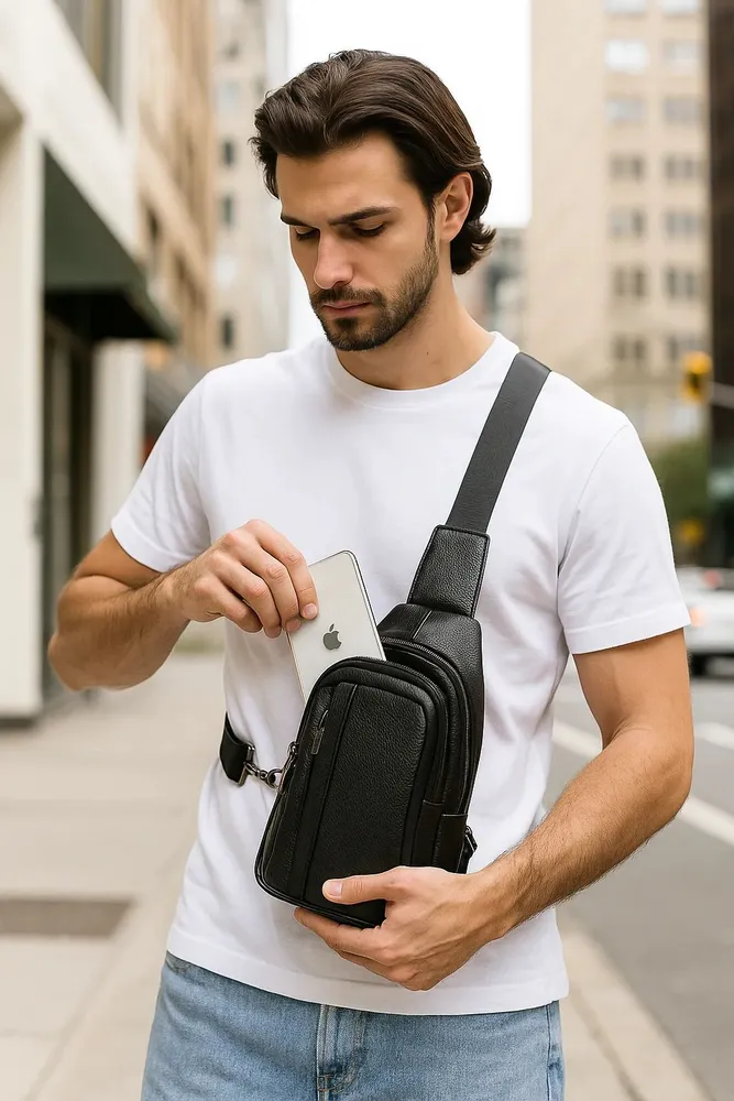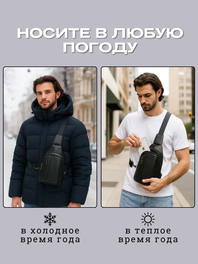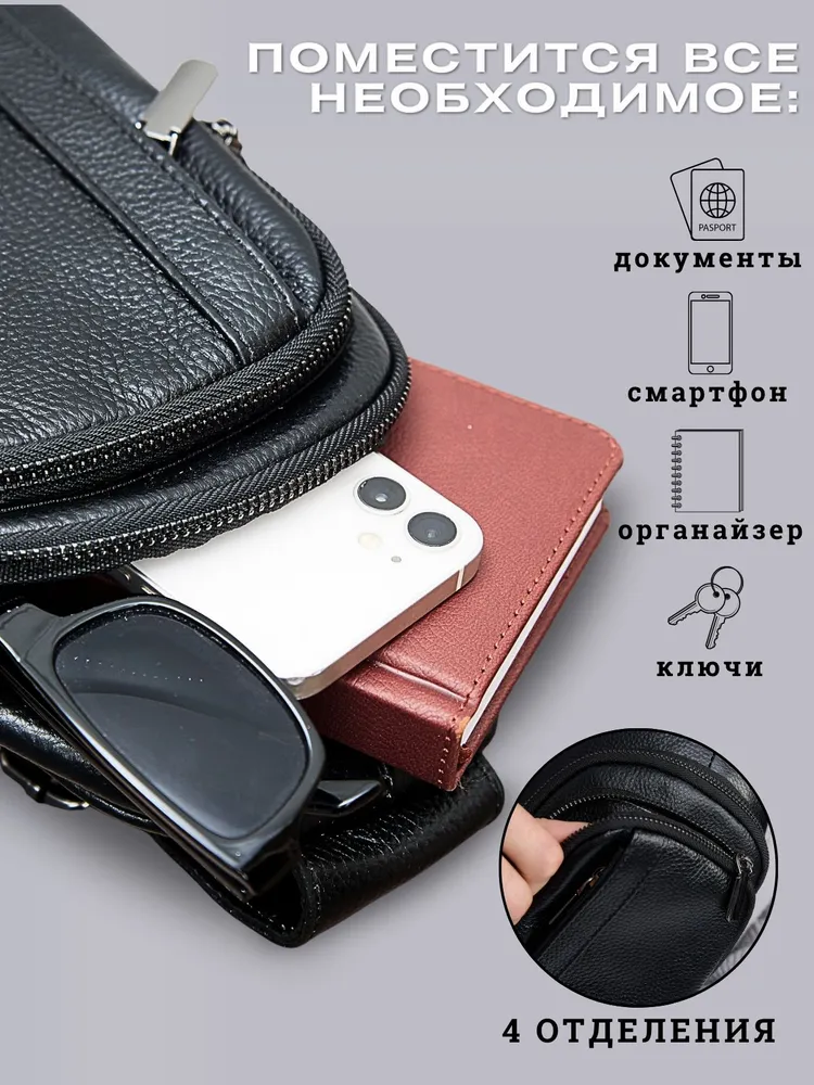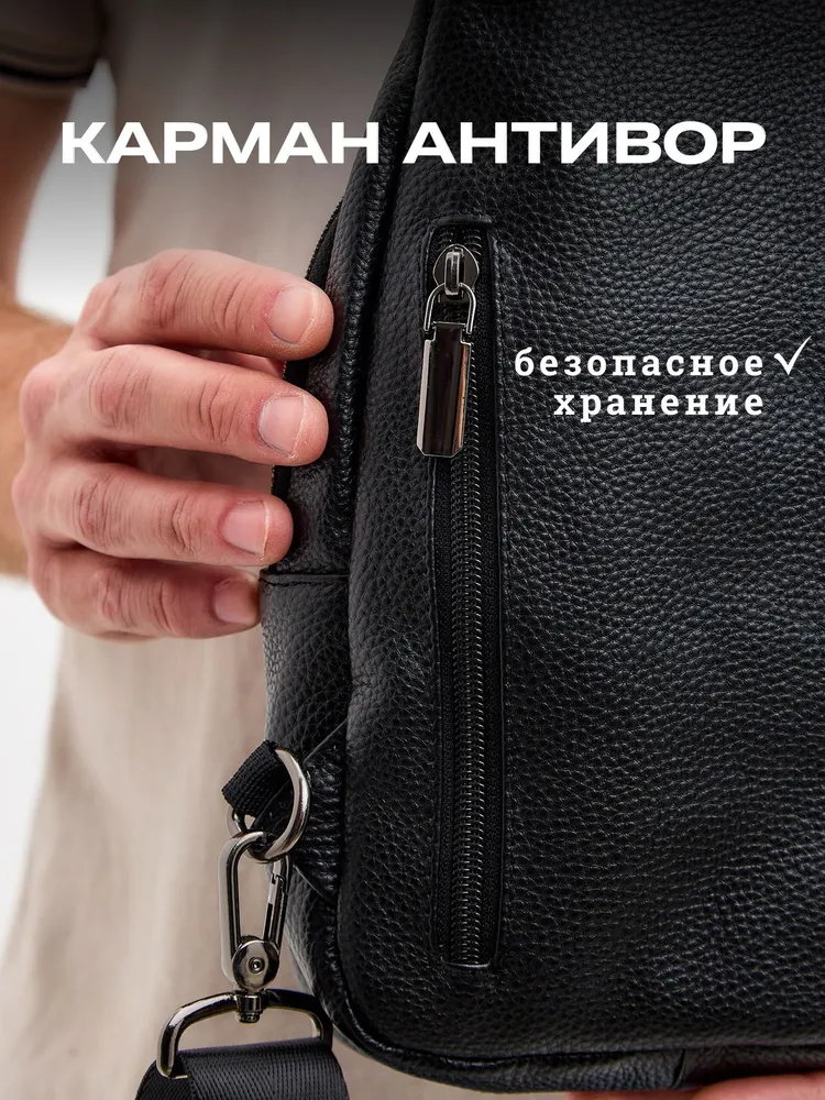 Стильная сумка для современного мужчины Ищете удобную и стильную сумку для повседневного ношения? Наша модель идеально подойдёт для мужчин, ценящих практичность. Эта сумка мужская через плечо станет незаменимой для тех, кто предпочитает держать всё необходимое под рукой. Изготовленная из натуральной кожи, она обладает долговечностью и стильным дизайном, что делает её отличным выбором для любого случая - будь то деловая встреча, прогулка по городу или путешествие. Регулируем ремень Ремень выполнен из плотного нейлона. Длина ремня регулируется от 85см до 159см, что позволяет выбрать комфортную длину человеку любого роста и телосложения. Фурнитура При производстве сумки использовалась только надежная металлическая фурнитура, которая прослужит Вам долгие годы. Карман Анти-вор Задний карман антивор для самого ценного. Вместит ключи, наличные или банковские карты. Вместительность Несмотря на небольшие размеры, сумка оснащена большим количеством отделений. 1 основное и 4 кармана. Организация хранения Внутри основного отдела расположен карман на молнии, который идеально подойдет для хранения документов. Универсальность. Сумка из натуральной кожи станет Вашим любимым аксессуаром на каждый день. К ней не просто приятно прикасаться и удобно использовать - каждый её элемент говорит о том, что она была создана именно для вас. Этот аксессуар подчеркнет Ваш стиль и индивидуальность.