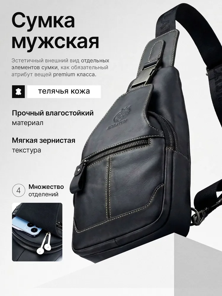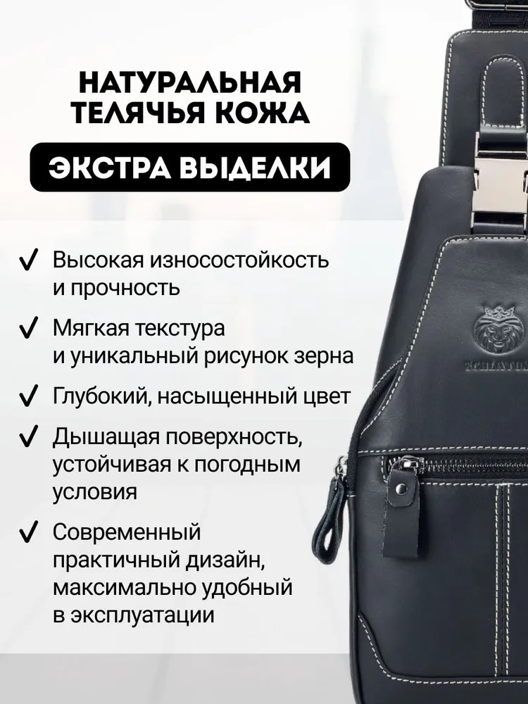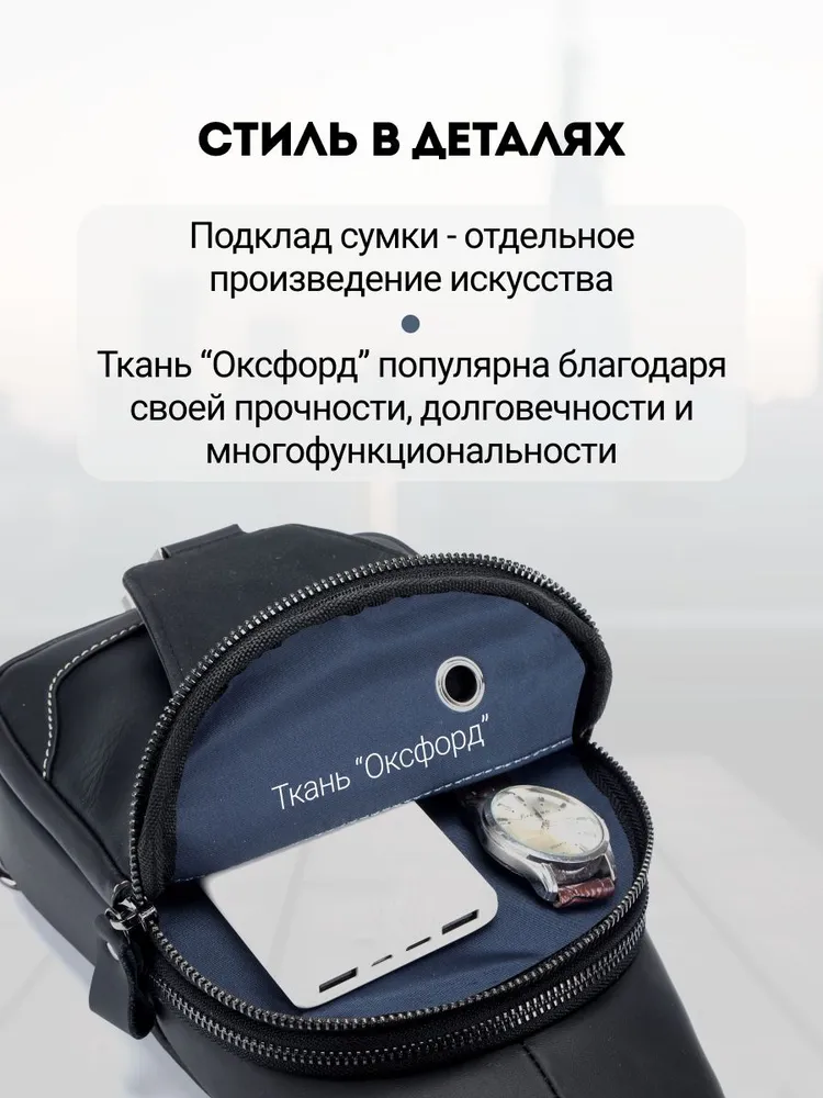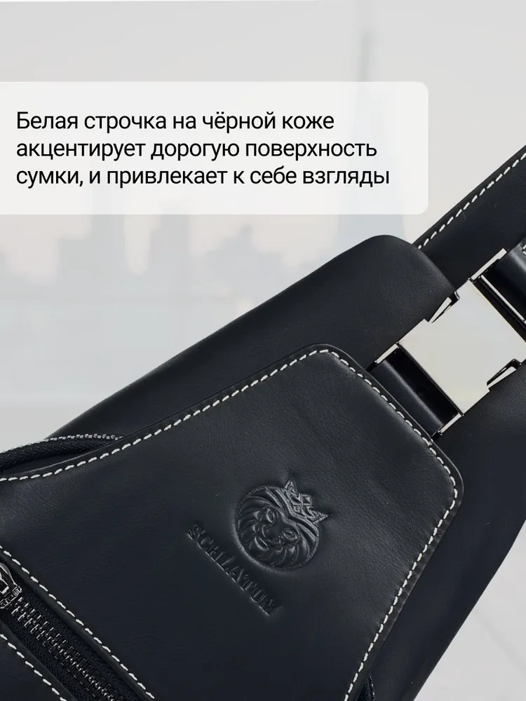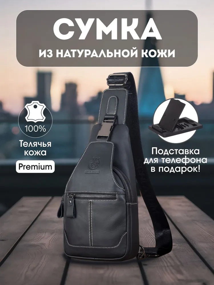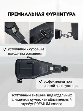 Премиальное качество / Телячья кожа / Сумка выполнена из премиальной телячьей кожи экстра выделки, что обеспечивает: 1. Высокую износостойкость и прочность; 2. Мягкость текстуры и уникальный рисунок зерна; 4. Глубокий и насыщенный цвет; 4. Дышащую поверхность, устойчивую к суровым погодным условиям; 5. Современный и практичный дизайн, максимально функциональный в эксплуатации. Высокая функциональность в классическом исполнении 1. 4е внешних кармана для быстрого доступа во все отделения; 2. Железные молнии и карабины для частой эксплуатации и эстетичного внешнего вида; 3. Длинный (110 см.) ремень для любого роста. Премиальная фурнитура Металлические карабины и железные молнии устойчивы к суровым погодным условиям. Эффективны при частой эксплуатации. Эстетичный внешнего вид отдельных элементов сумки, как обязательный атрибут вещей premium класса. Материал подкладки / Оксфорд / Стильный подклад сумки - как отдельное произведение искусства. Сам "Оксфорд" - это ткань, которая завоевала популярность благодаря своей прочности, долговечности и многофункциональности. Цвет подклада - как стильное продолжение дизайна продуманного до мелочей. Самые популярные размеры в стильной классике Высокую функциональность обеспечивает современный эргономический дизайн. Белая строчка на чёрной коже, акцентирует дорогую поверхность сумки, которая сразу привлекает к себе взгляд. Металлический хромированный карабин, как заметный и дорогой, но в тоже время функциональный атрибут Белая строчка на чёрной коже, акцентирует дорогую поверхность сумки, которая сразу привлекает к себе взгляды. Металлический хромированный карабин, как заметный и дорогой, но в тоже время функциональный атрибут