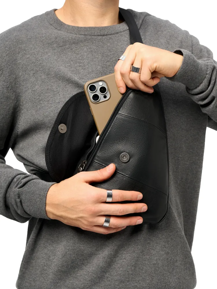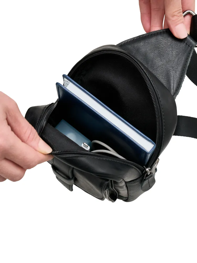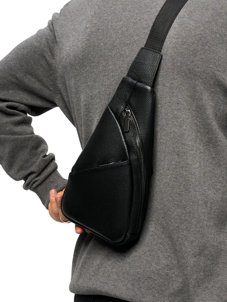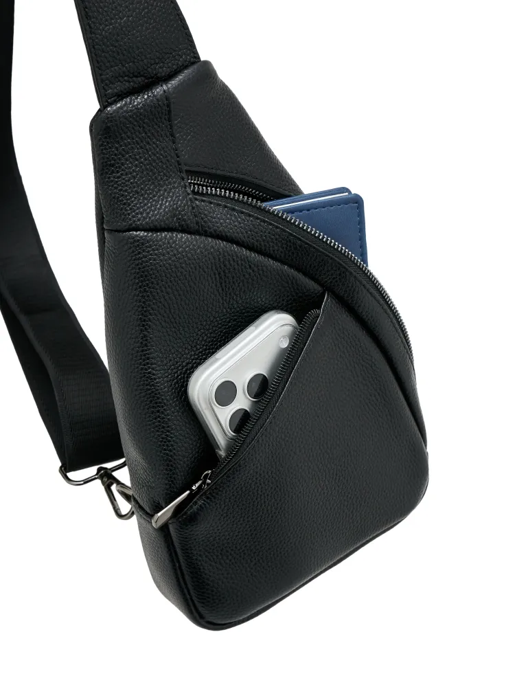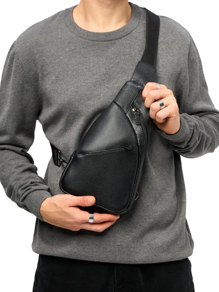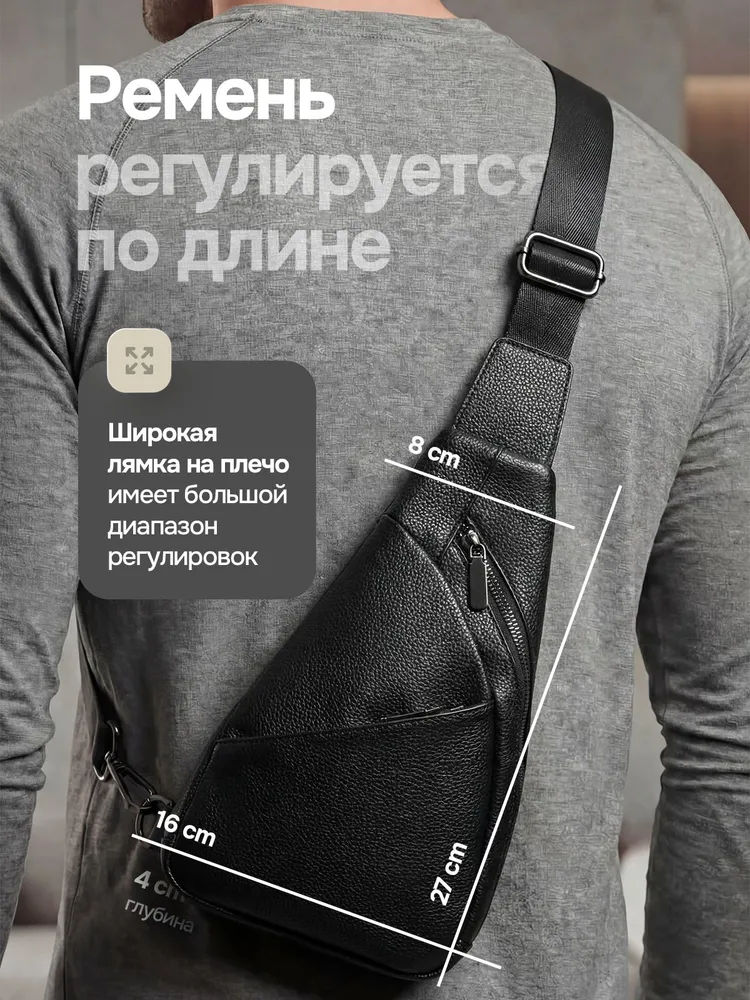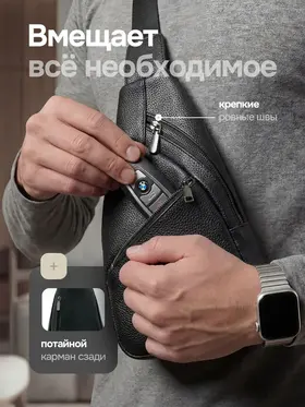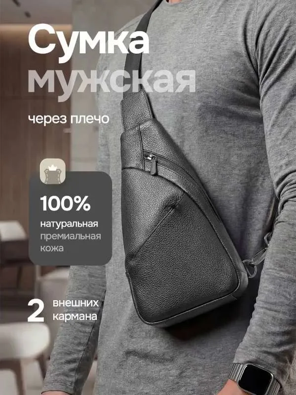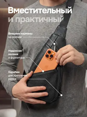 Качество и стиль Мужская сумка через плечо изготовлена из натуральной кожи высокого качества. Даже избалованный качеством человек будет доволен исполнением. Сумка кросс-боди выглядит очень стильно и подходит как к классическому стилю, повседневному, офисному, деловому, так и к спортивному стилю. Практичность Мужская сумка бананка имеет 3 внешних карманов. Основные карманы закрываются на надежную молнию, и один на магнитную клипсу. Один из карманов находиться с задней части сумки. Теперь не стоит выбор, что взять с собой, все необходимое вместит сумка слинг. Ремень Ремень выполнен из плотной ткани, которая прослужит долгие годы и не будет протираться. Большой диапазон регулировок длины ремня позволит подобрать комфортное расположение человеку практически любой комплекции.