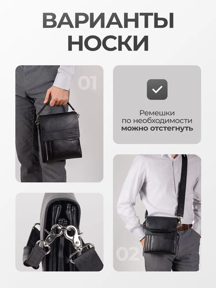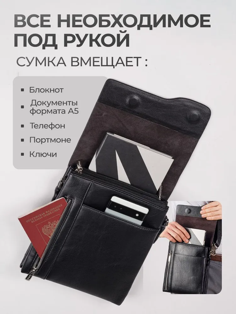 Надежность Качество Гарантия 6 месяцев Стиль УНИВЕРСАЛЬНЫЕ РАЗМЕРЫ ДЛЯ КАЖДОГО Размеры и варианты: • Большая сумка(21×24 см) !ВЫ СМОТРИТЕ ЭТОТ ВАРИАНТ!: подходит для ежедневника и документов формата A5, удобна для студентов и работы • Средняя кросс-боди (18×22 см): универсальные габариты для повседневного ношения, идеальна для ежедневного ношения паспорта и других мелочей • Маленькая сумка-мессенджер (16×19 см): компактная, может заменить кошелек благодаря множеству отделений *ВСЕ РАЗМЕРЫ ВЫГЛЯДЯТ ИДЕНТИЧНО КАК ВНУТРИ ТАК И СНАРУЖИ СТИЛЬНАЯ Барсетка изготовлена из премиальной экокожи и натуральной кожи, что придает ей стиля и сочетания с любым образом от делового до повседневного ВМЕСТИТЕЛЬНАЯ Благодаря своей эргономики, сумка вмещает все нужные вещи от бумаг А5, до ключей, повербанка, портмоне и других важный мелочей КАЧЕСТВЕННЫЕ И НАДЕЖНЫЕ МАТЕРИАЛЫ Принесут вам только положительные эмоции в процессе эксплуатации барсетки Гарантия 6 месяцев На все наши товары в магазине! Вы в любой момент можете задать вопрос и мы обязательно на него ответим и поможем в спорных ситуациях!
