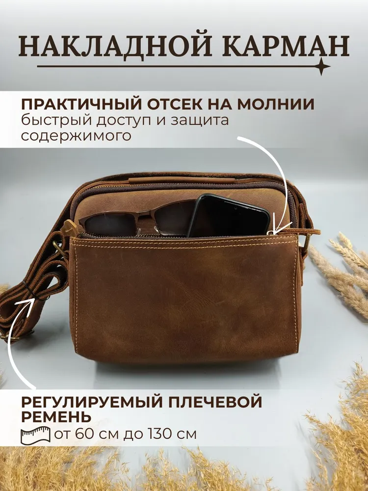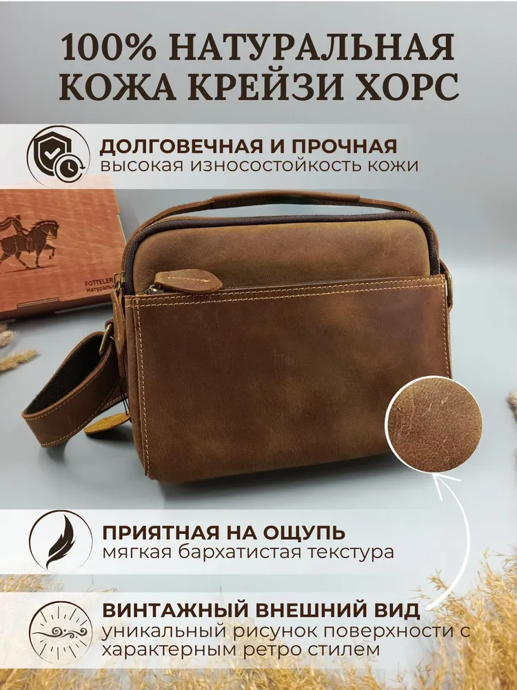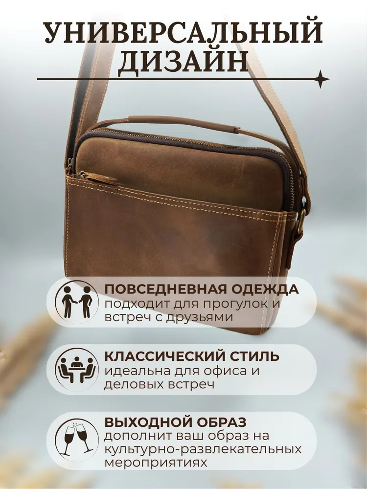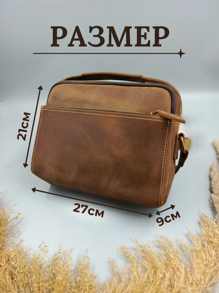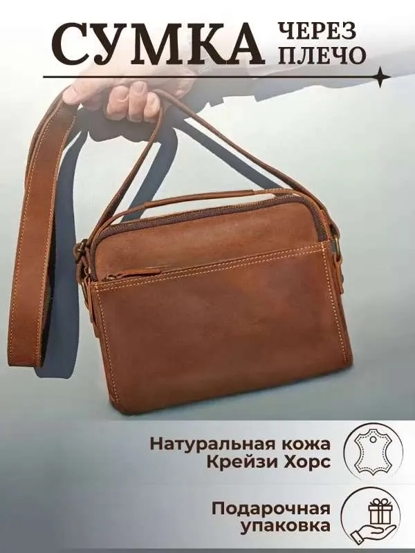 Ваш надежный спутник: сумка из натуральной кожи Мужская сумка через плечо из натуральной кожи Crazy Horse — это практичный и стильный аксессуар, который одинаково уместен в городе, на работе, в путешествии или в университете. Размер 27×21×9 см делает её достаточно вместительной для документов формата А5, тетрадей, планшета и повседневных мелочей, а многочисленные внутренние и внешние карманы позволяют держать всё в порядке. Универсальный дизайн гармонично сочетается с деловой, повседневной и выходной одеждой. Идеальный подарок Каждый экземпляр поставляется в подарочной деревянной коробке, упакованной в крафтовую бумагу с защитой, что делает её готовым подарком на день рождения или юбилей. Это не просто сумка мужская кожаная — это аксессуар с характером, который станет частью вашей личной истории. Кожа Crazy Horse: стиль и качество Кожа Crazy Horse ценится за долговечность, прочность и благородный винтажный эффект. Бархатистая текстура приятна на ощупь, а со временем приобретает уникальную патину, делая каждую сумку неповторимой. Эта кросс-боди модель сохраняет безупречный внешний вид даже при активной эксплуатации и ежедневно подчёркивает стиль владельца. Элегантная мужская сумка: от офиса до прогулки Кросс боди сумка мужская удобна для ношения через плечо или в руке, обеспечивая комфорт благодаря продуманной лямке. Она подойдёт как для рабочих встреч, так и для учебы или городских прогулок. Независимо от того, нужна ли вам большая барсетка, мессенджер или компактная кожаная сумка на каждый день — этот вариант сочетает в себе солидность и функциональность.
