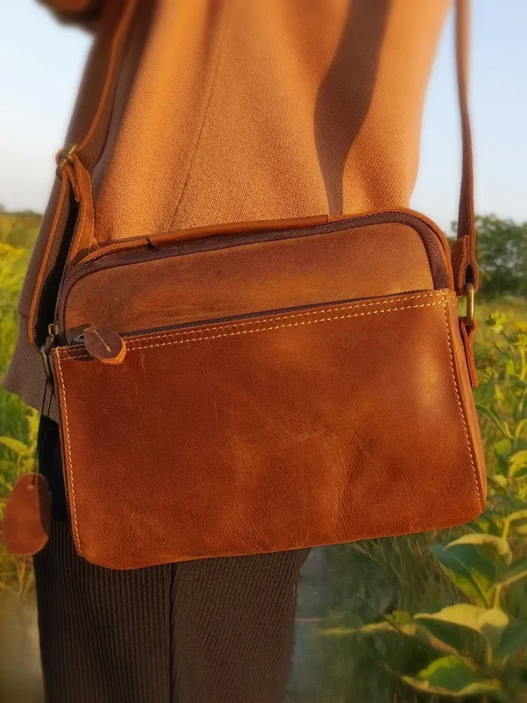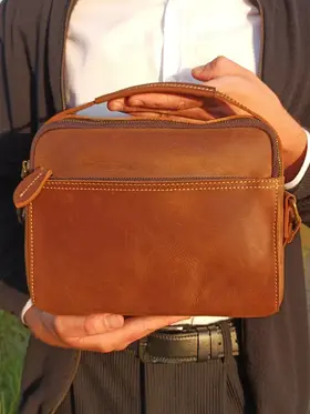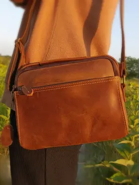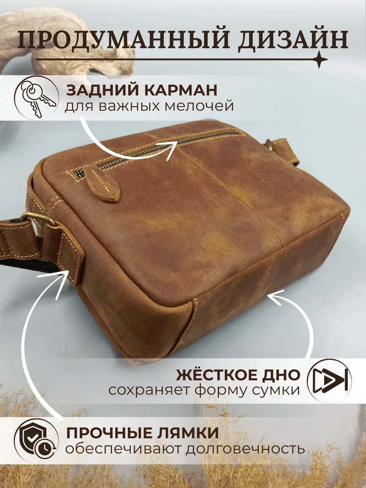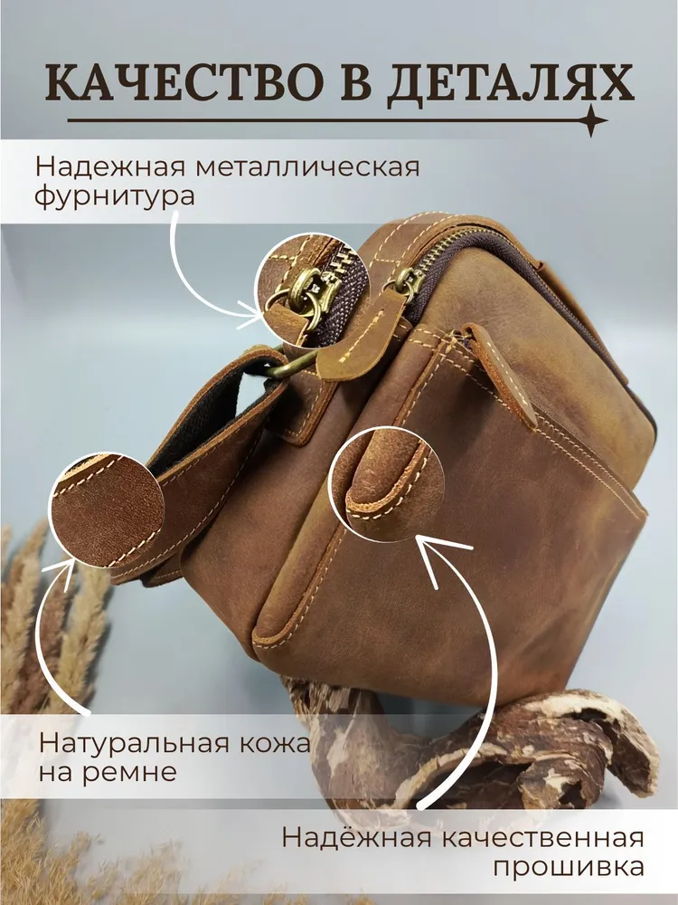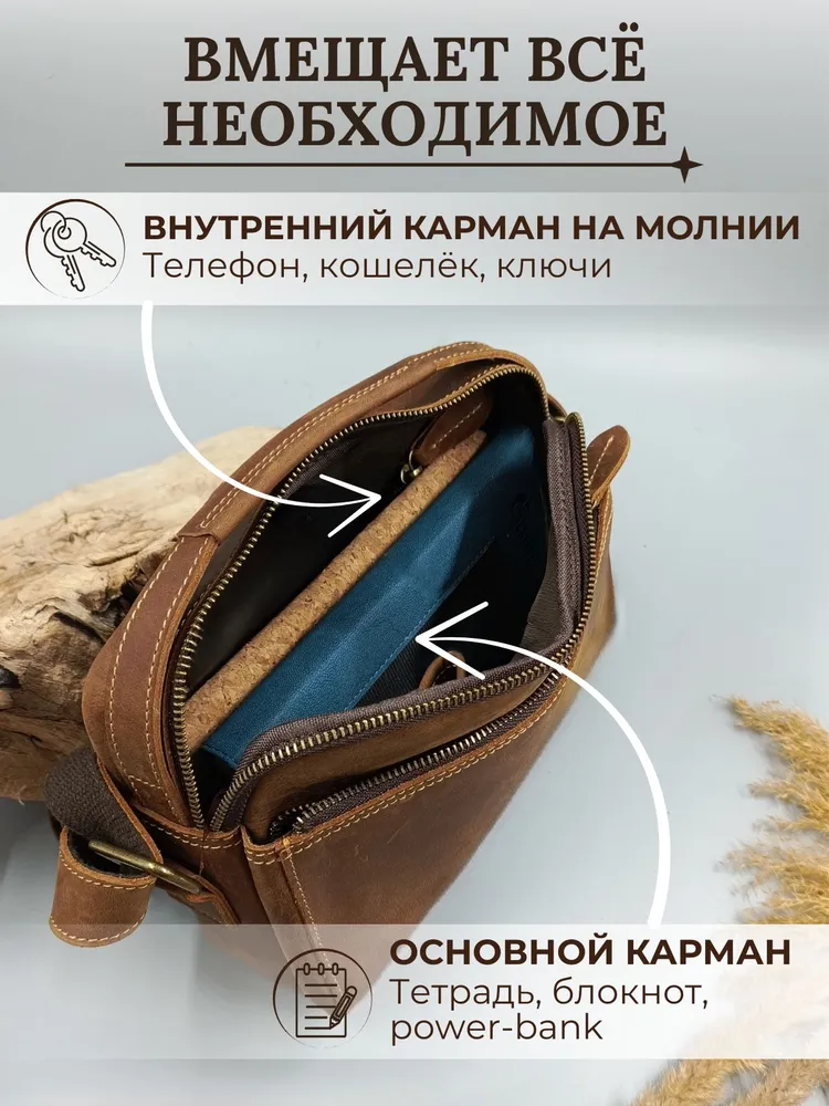 Ваш надежный спутник: сумка из натуральной кожи Мужская сумка через плечо из натуральной кожи Crazy Horse — это практичный и стильный аксессуар, который одинаково уместен в городе, на работе, в путешествии или в университете. Размер 27×21×9 см делает её достаточно вместительной для документов формата А5, тетрадей, планшета и повседневных мелочей, а многочисленные внутренние и внешние карманы позволяют держать всё в порядке. Универсальный дизайн гармонично сочетается с деловой, повседневной и выходной одеждой. Идеальный подарок Каждый экземпляр поставляется в подарочной деревянной коробке, упакованной в крафтовую бумагу с защитой, что делает её готовым подарком на день рождения или юбилей. Это не просто сумка мужская кожаная — это аксессуар с характером, который станет частью вашей личной истории. Кожа Crazy Horse: стиль и качество Кожа Crazy Horse ценится за долговечность, прочность и благородный винтажный эффект. Бархатистая текстура приятна на ощупь, а со временем приобретает уникальную патину, делая каждую сумку неповторимой. Эта кросс-боди модель сохраняет безупречный внешний вид даже при активной эксплуатации и ежедневно подчёркивает стиль владельца. Элегантная мужская сумка: от офиса до прогулки Кросс боди сумка мужская удобна для ношения через плечо или в руке, обеспечивая комфорт благодаря продуманной лямке. Она подойдёт как для рабочих встреч, так и для учебы или городских прогулок. Независимо от того, нужна ли вам большая барсетка, мессенджер или компактная кожаная сумка на каждый день — этот вариант сочетает в себе солидность и функциональность.