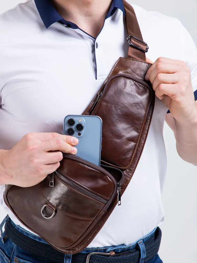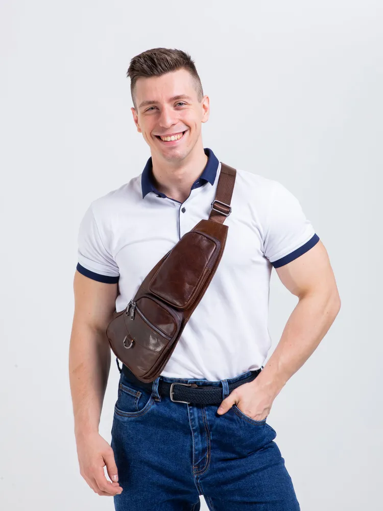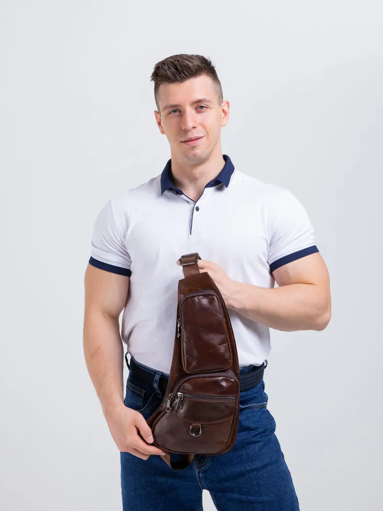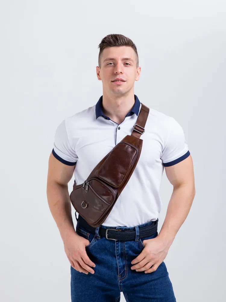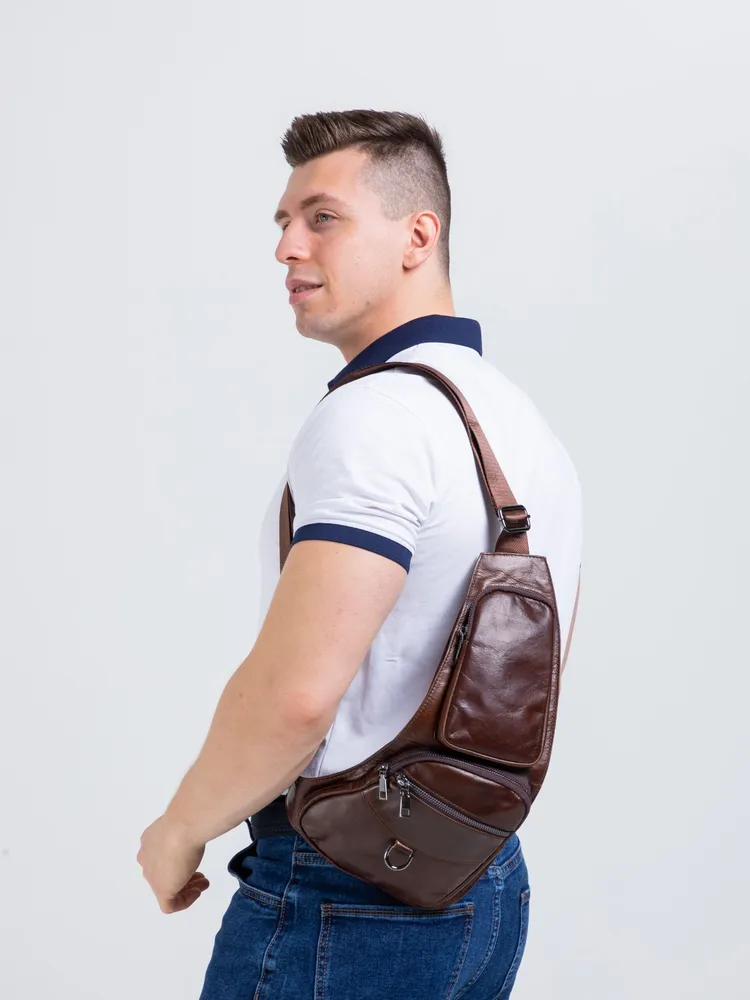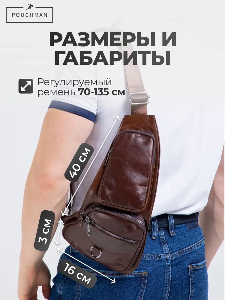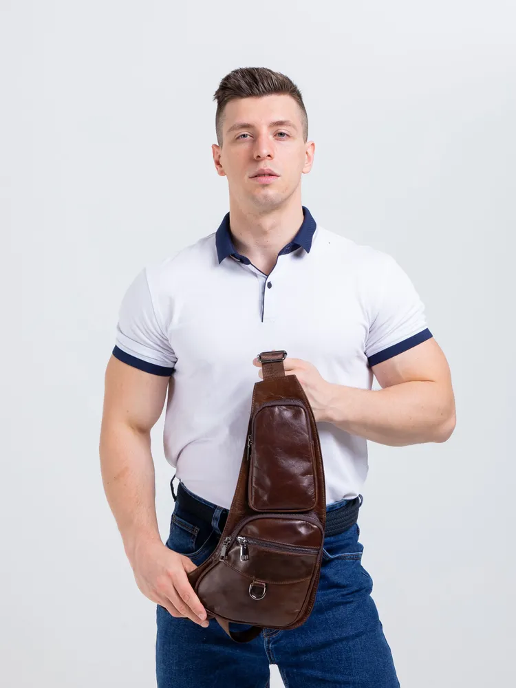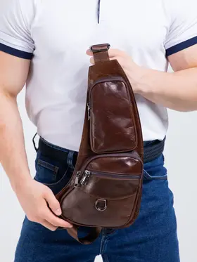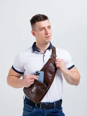 Сумка мужская через плечо кожаная натуральная - это стильный и универсальный аксессуар для повседневного использования. Коричневая кросс боди для мужчин небольшая и станет надежным помощником в повседневной жизни. Изготовлена из натуральной кожи, поэтому прочная и прослужит долго. Отличается функциональностью и классическим, но оригинальным дизайном, поэтому подойдет подростку и деловому мужчине. Тонкая, практически невесомая кроссбоди имеет эргономично изогнутую каплевидную форму в виде кобуры. Сумка рюкзак маленькая и компактная, но вместительная, поэтому в ней легко поместятся документы, ключи и телефон. Благодаря простому и удобному дизайну с карманами, она легко надевается на плечо или на грудь, служит как наплечная и нагрудная, и не ограничивает движения. Можно носить как легкую барсетку с любым стилем одежды для работы или езды за рулем. Имеет размеры 40*16*3 см, основное отделение и три кармана. Вход в основное отделение расположен сбоку под рукой, ширина - 20 см. Сзади карман 16*8 см, в который можно убрать паспорт. Спереди карман для телефона 18*11 см. Ниже - накладной карман на молнии 18*14 см и кармашек на магнитной кнопке под клапаном 13*14 см. Ремень сумки тканевый, имеет крепление с правой стороны. Верх ремня - натуральная кожа. Размер ремня 70-135 см, ширина 4 см. Глубина сумки составляет всего 2 см, что позволяет расположить ее под верхней одеждой как сумку скрытого ношения. В подарочной коробке. Отличный подарок на день рождения или юбилей мужу или парню, также отцу, дедушке, папе или брату.