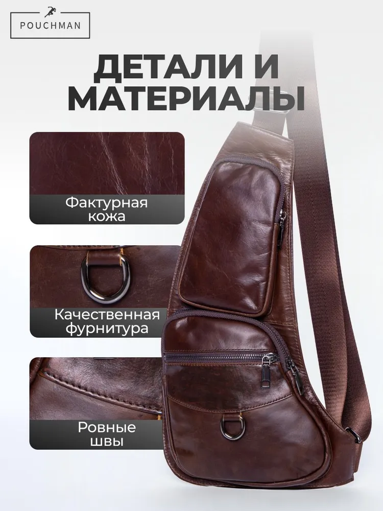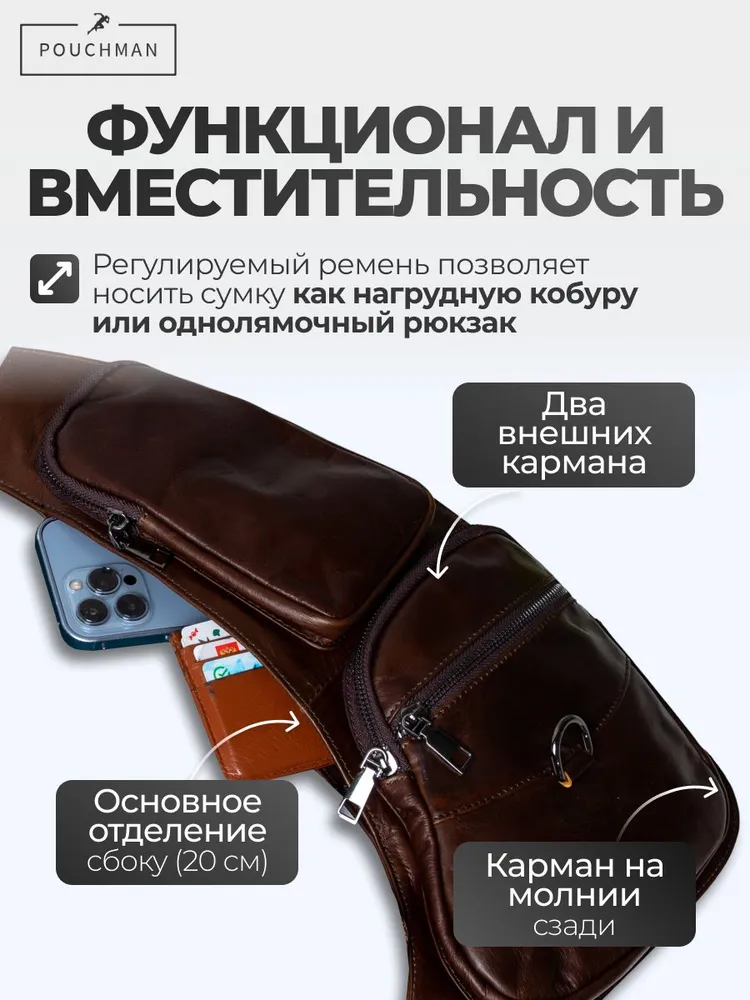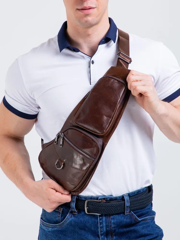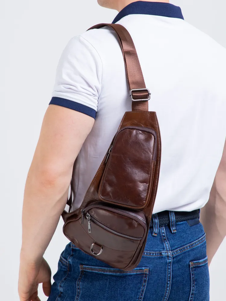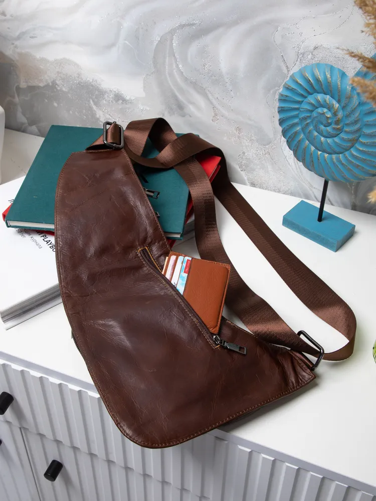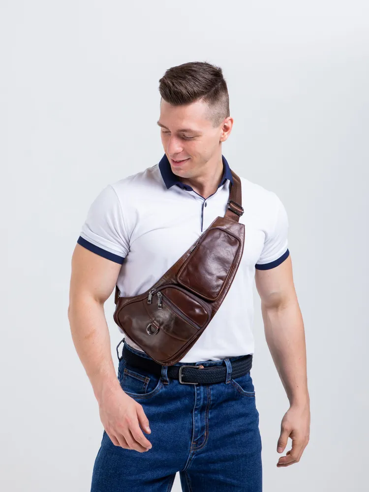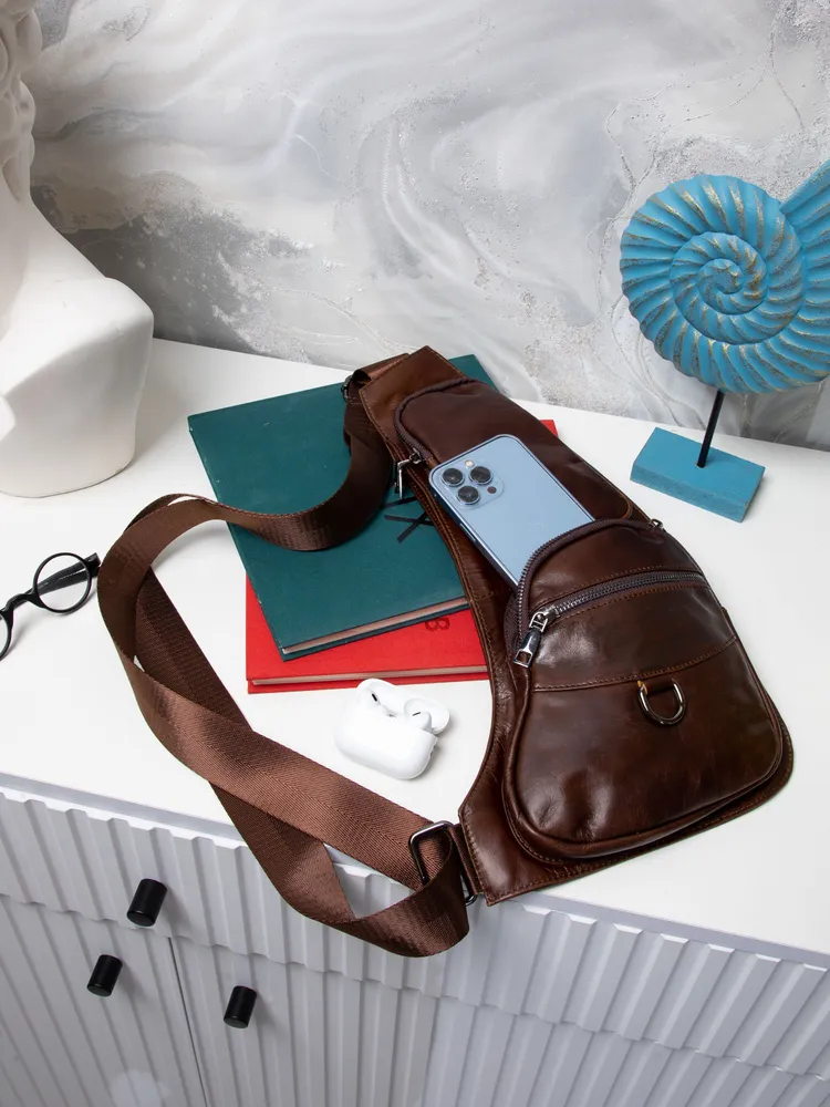 Сумка мужская через плечо кожаная натуральная - это стильный и универсальный аксессуар для повседневного использования. Коричневая кросс боди для мужчин небольшая и станет надежным помощником в повседневной жизни. Изготовлена из натуральной кожи, поэтому прочная и прослужит долго. Отличается функциональностью и классическим, но оригинальным дизайном, поэтому подойдет подростку и деловому мужчине. Тонкая, практически невесомая кроссбоди имеет эргономично изогнутую каплевидную форму в виде кобуры. Сумка рюкзак маленькая и компактная, но вместительная, поэтому в ней легко поместятся документы, ключи и телефон. Благодаря простому и удобному дизайну с карманами, она легко надевается на плечо или на грудь, служит как наплечная и нагрудная, и не ограничивает движения. Можно носить как легкую барсетку с любым стилем одежды для работы или езды за рулем. Имеет размеры 40*16*3 см, основное отделение и три кармана. Вход в основное отделение расположен сбоку под рукой, ширина - 20 см. Сзади карман 16*8 см, в который можно убрать паспорт. Спереди карман для телефона 18*11 см. Ниже - накладной карман на молнии 18*14 см и кармашек на магнитной кнопке под клапаном 13*14 см. Ремень сумки тканевый, имеет крепление с правой стороны. Верх ремня - натуральная кожа. Размер ремня 70-135 см, ширина 4 см. Глубина сумки составляет всего 2 см, что позволяет расположить ее под верхней одеждой как сумку скрытого ношения. В подарочной коробке. Отличный подарок на день рождения или юбилей мужу или парню, также отцу, дедушке, папе или брату.
