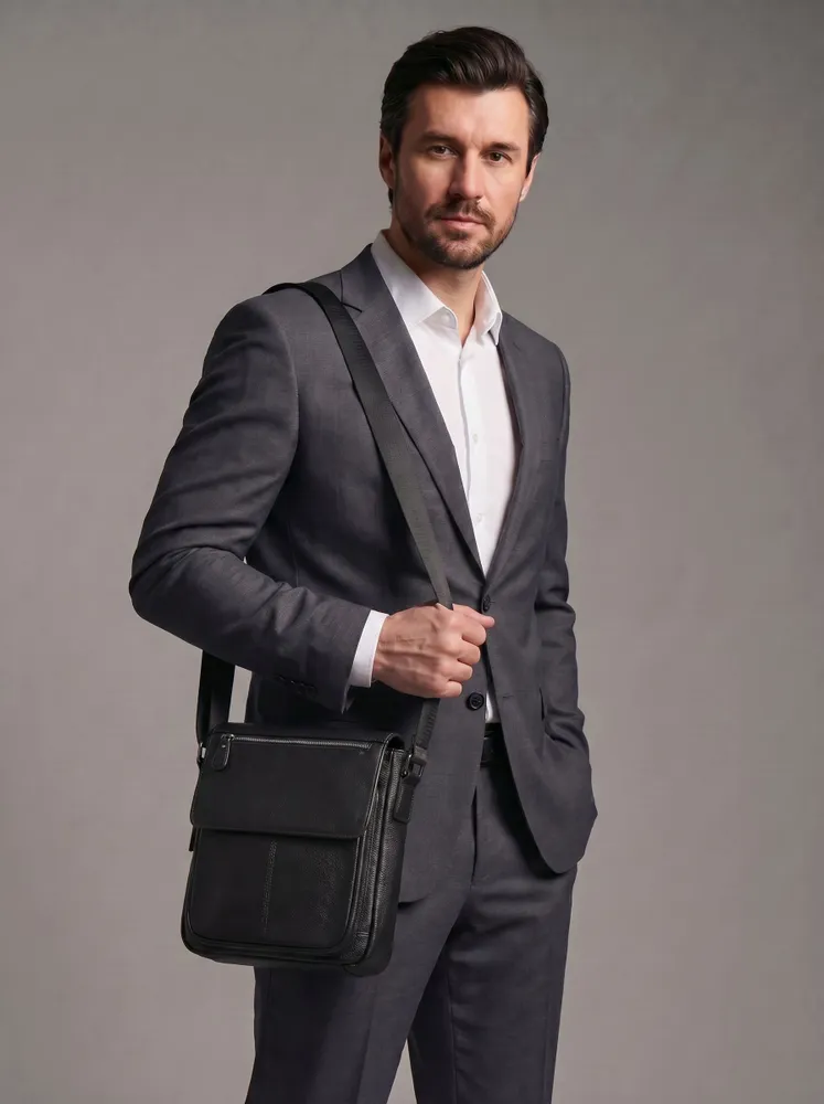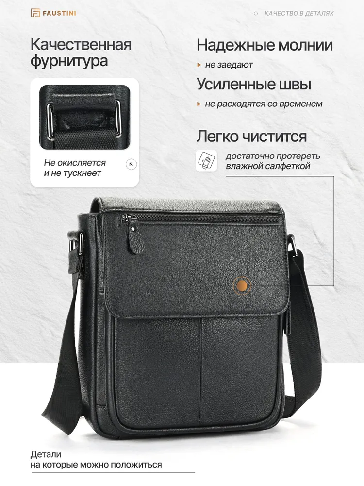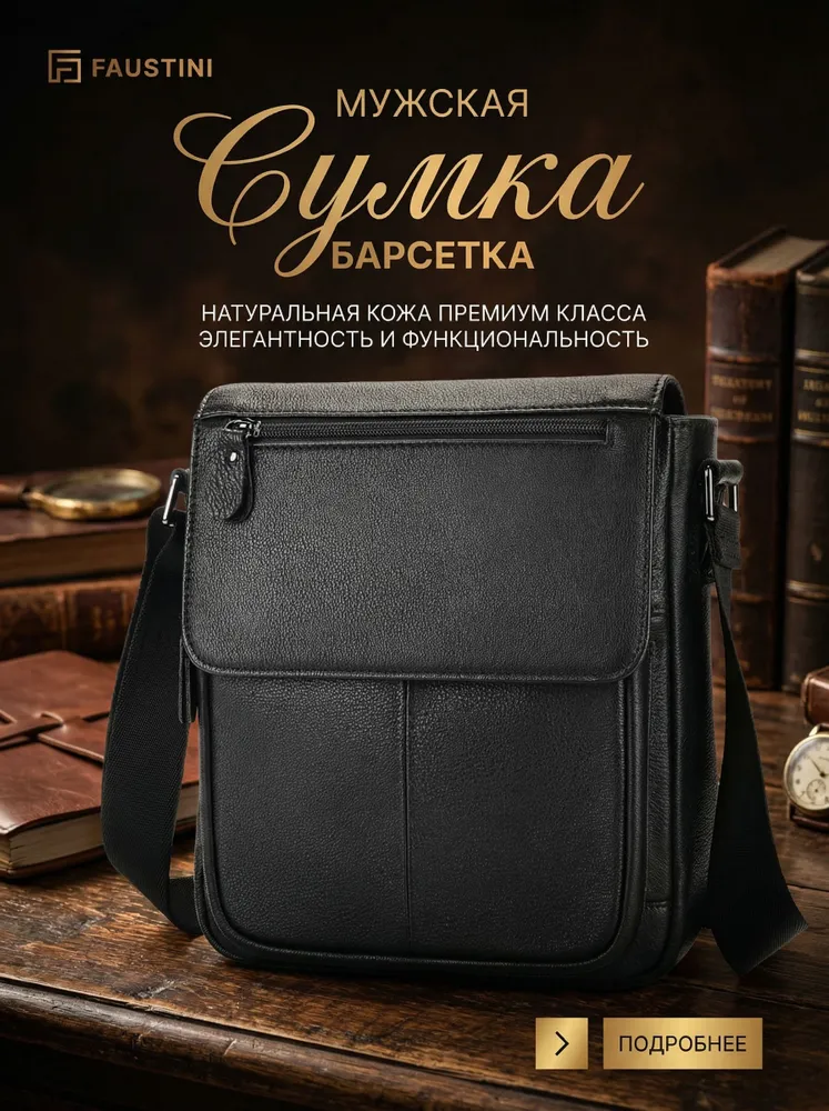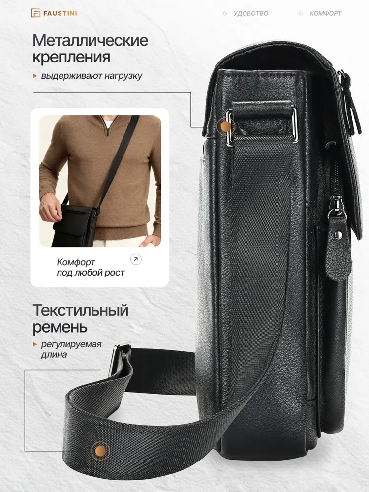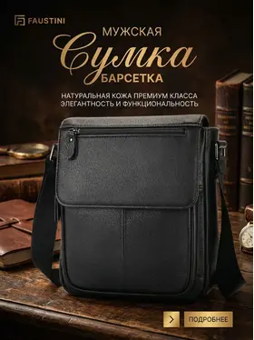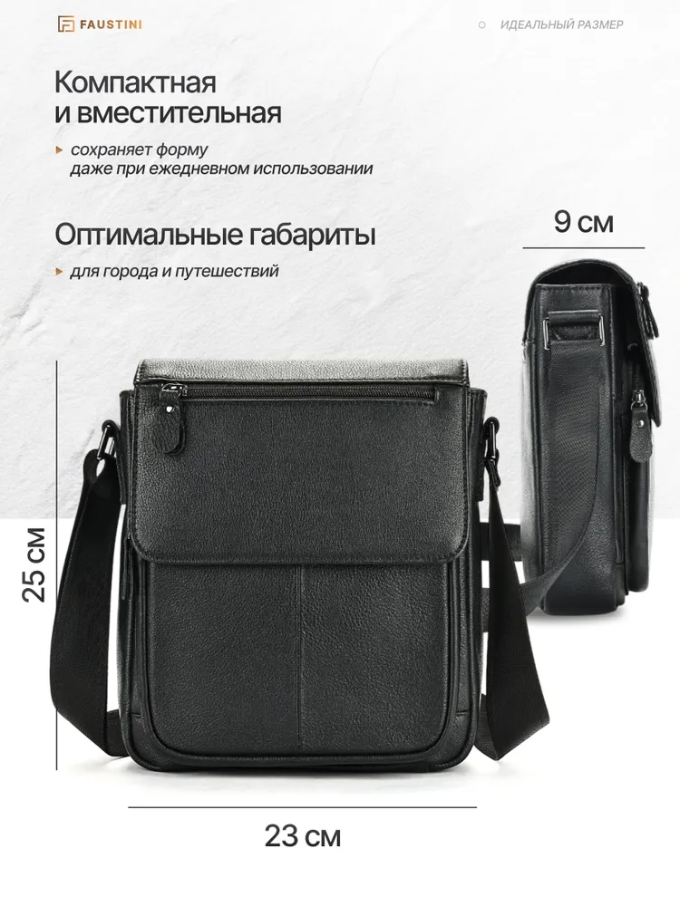 Сумка мужская кожаная FAUSTINI Представляем вашему вниманию стильную мужскую сумку через плечо из натуральной кожи от Faustini. Эта барсетка станет идеальным спутником для современного мужчины, который ценит практичность и элегантный дизайн. Благодаря своему универсальному стилю, изделие отлично подходит как для повседневного использования, так и для деловых встреч. Универсальный черный цвет подойдет под любой образ. Изготовленная из высококачественной кожи, сумка отличается прочностью и долговечностью. Каждый элемент продуман до мелочей: от аккуратных швов до удобных карманов. Внутреннее пространство позволяет удобно разместить все необходимые вещи – от документов и кошелька до телефона и других мелочей. Размеры барсетки: Высота - 25 см Ширина - 23 см Глубина - 9 см Мужская кожаная сумка через плечо имеет регулируемый ремень, что обеспечивает дополнительный комфорт. Вы можете носить её как на плече, так и на груди. Это удобно, особенно если вам нужно иметь доступ к важным вещам в любой момент. Эта барсетка станет отличным дополнением к вашему образу, подчеркнув стиль и индивидуальность. Ее классический вид не выходит из моды, а натуральная кожа придает изысканность. Простой, но привлекательный дизайн позволяет сочетать сумку с различной одеждой – от спорта до классики. Приобретая эту сумку, вы выбираете качество и стиль. Она будет надежным помощником в повседневной жизни, а также станет отличным подарком для мужчины, стремящегося подчеркнуть свою индивидуальность. Не упустите возможность обратить на себя внимание с помощью этой мужской кожаной сумки через плечо.
