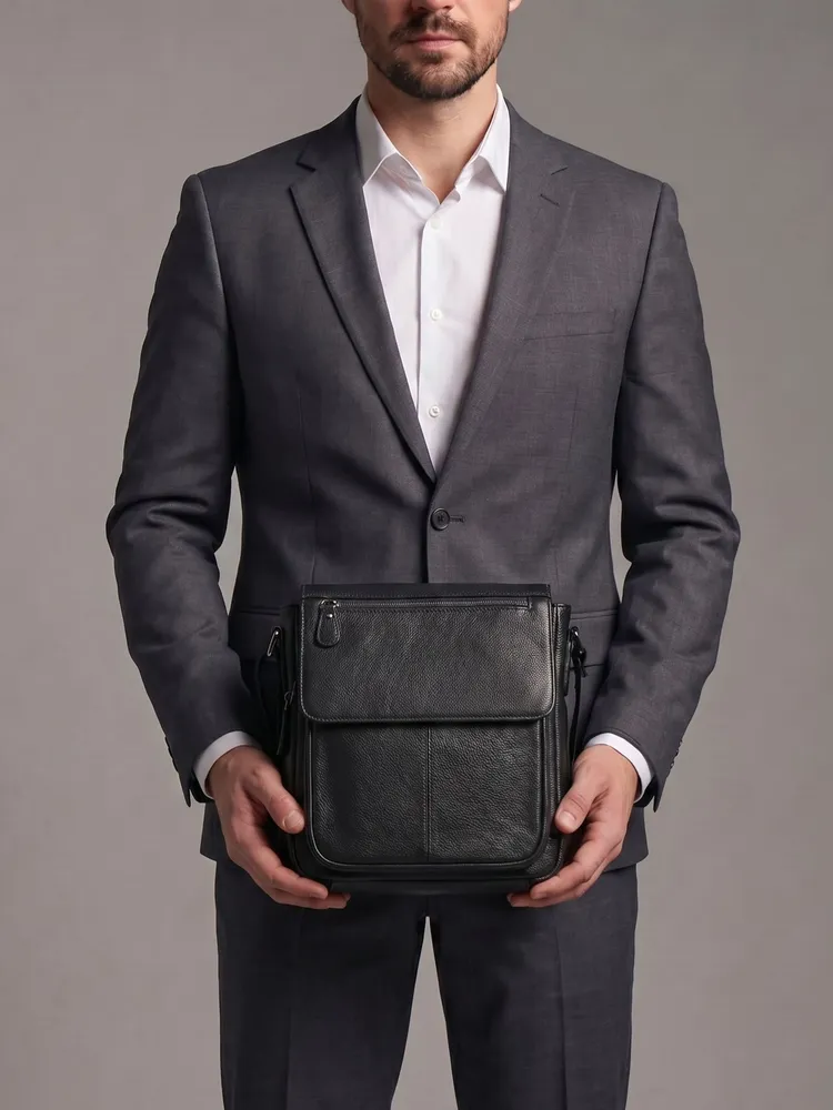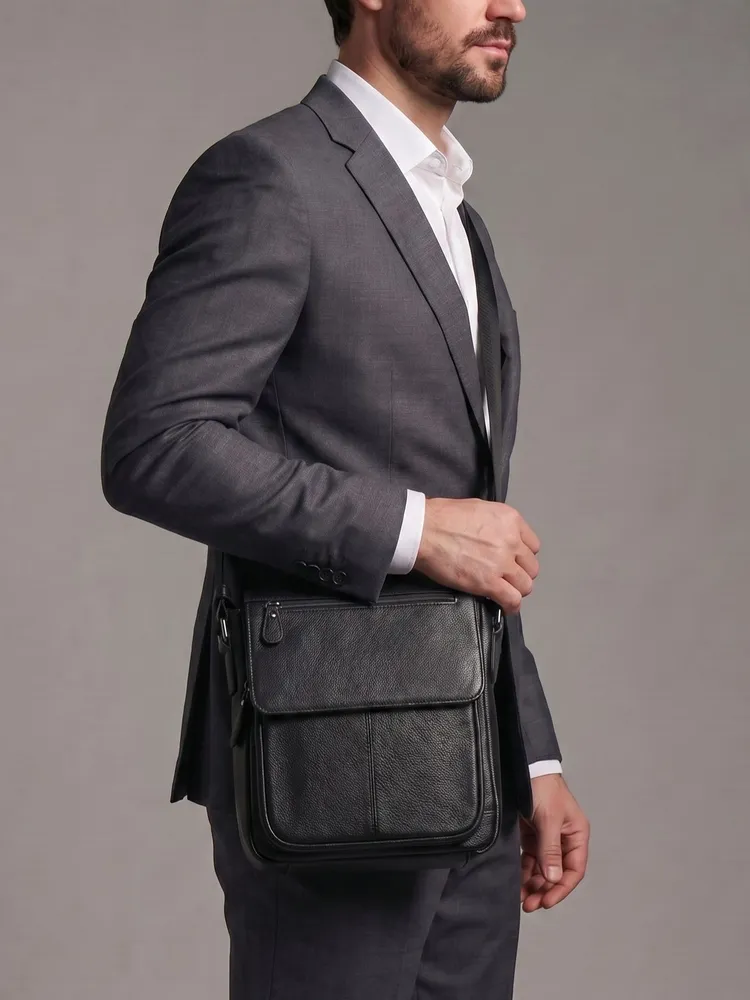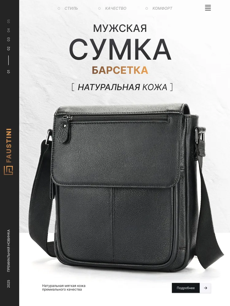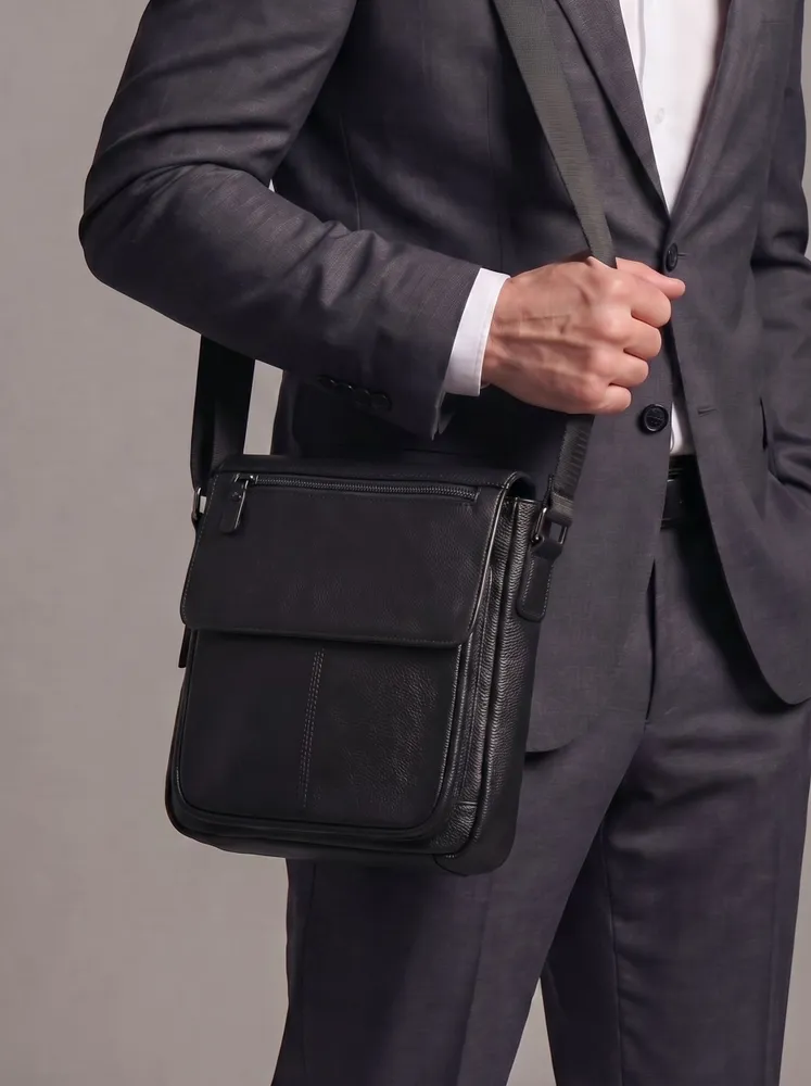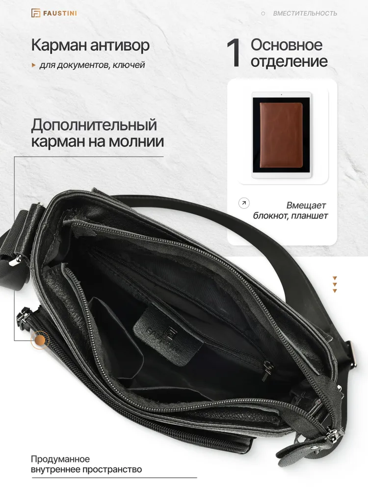Сумка мужская кожаная FAUSTINI Представляем вашему вниманию стильную мужскую сумку через плечо из натуральной кожи от Faustini. Эта барсетка станет идеальным спутником для современного мужчины, который ценит практичность и элегантный дизайн. Благодаря своему универсальному стилю, изделие отлично подходит как для повседневного использования, так и для деловых встреч. Универсальный черный цвет подойдет под любой образ. Изготовленная из высококачественной кожи, сумка отличается прочностью и долговечностью. Каждый элемент продуман до мелочей: от аккуратных швов до удобных карманов. Внутреннее пространство позволяет удобно разместить все необходимые вещи – от документов и кошелька до телефона и других мелочей. Размеры барсетки: Высота - 25 см Ширина - 23 см Глубина - 9 см Мужская кожаная сумка через плечо имеет регулируемый ремень, что обеспечивает дополнительный комфорт. Вы можете носить её как на плече, так и на груди. Это удобно, особенно если вам нужно иметь доступ к важным вещам в любой момент. Эта барсетка станет отличным дополнением к вашему образу, подчеркнув стиль и индивидуальность. Ее классический вид не выходит из моды, а натуральная кожа придает изысканность. Простой, но привлекательный дизайн позволяет сочетать сумку с различной одеждой – от спорта до классики. Приобретая эту сумку, вы выбираете качество и стиль. Она будет надежным помощником в повседневной жизни, а также станет отличным подарком для мужчины, стремящегося подчеркнуть свою индивидуальность. Не упустите возможность обратить на себя внимание с помощью этой мужской кожаной сумки через плечо.