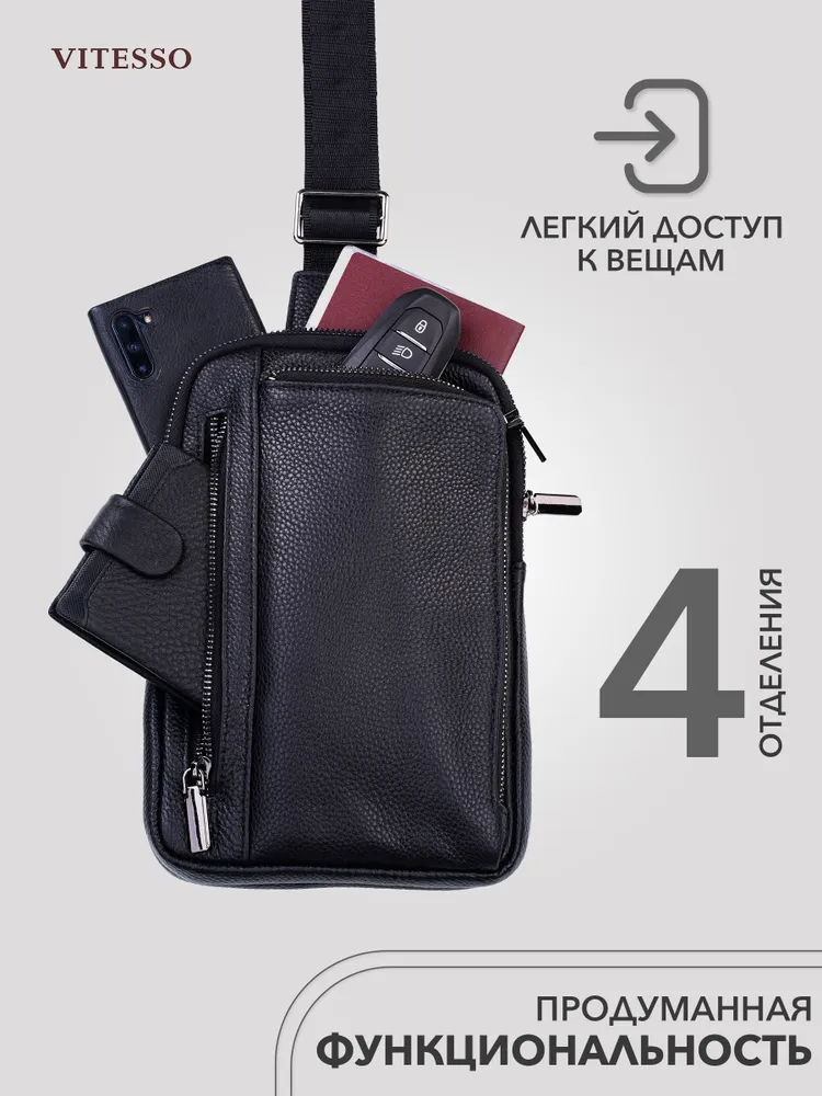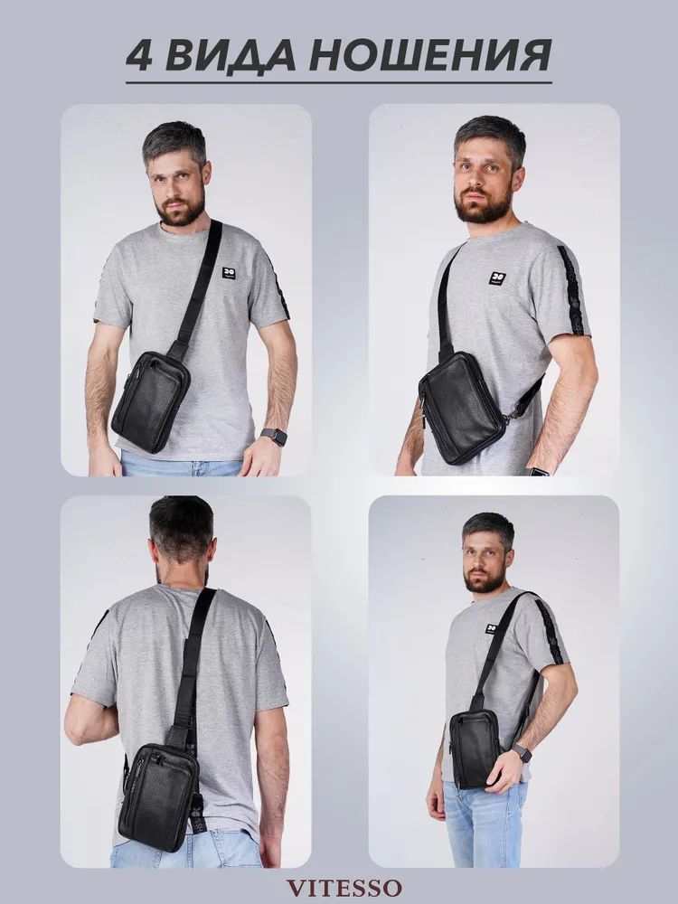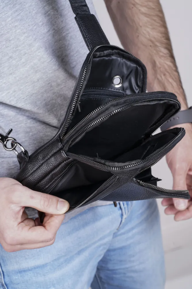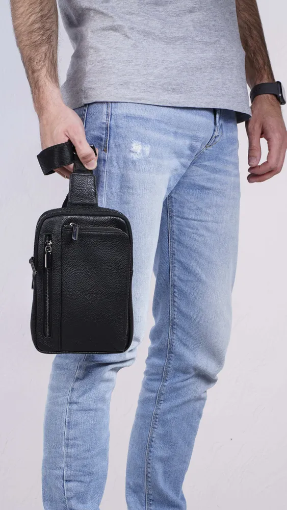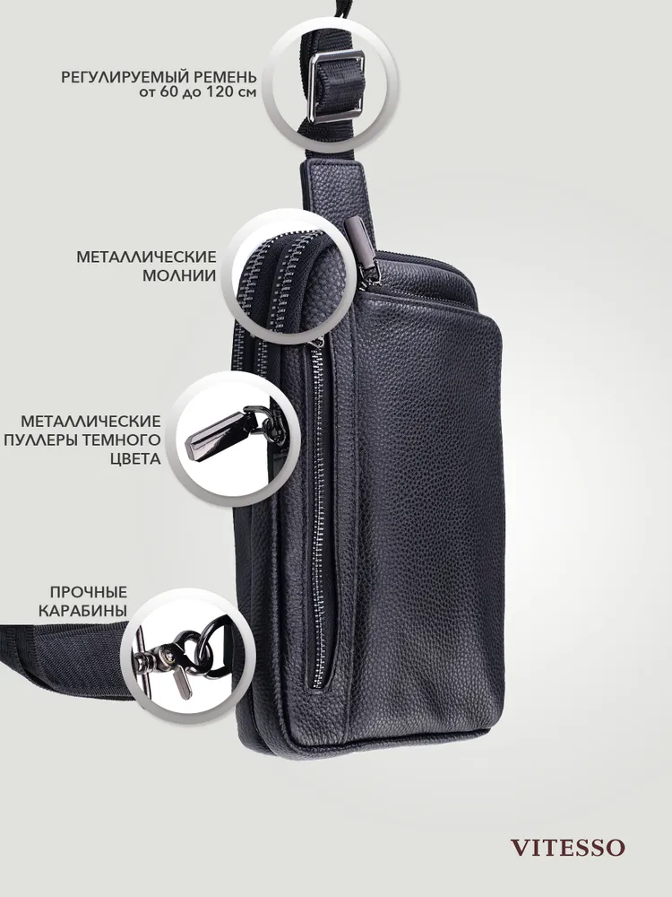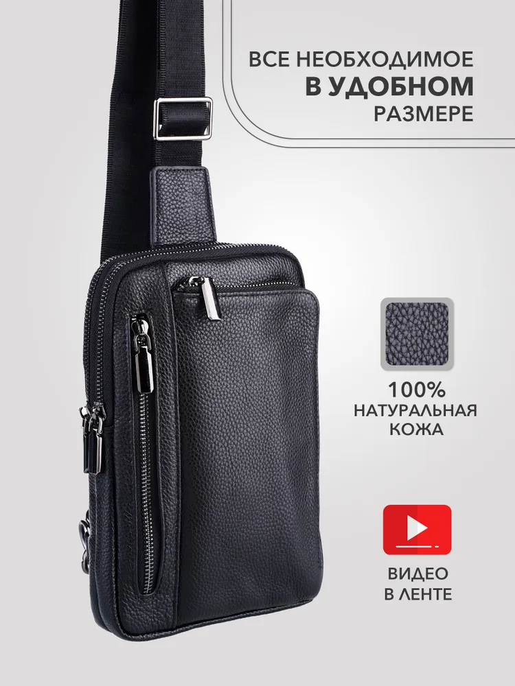 Сумка мужская через плечо обеспечивает презентабельность и комфорт настоящему мужчине. Для изготовления сумки используется высококачественная натуральная кожа с вощенной отделкой, приятная на ощупь, а также надежная фурнитура темного цвета. Данная кожаная нагрудная сумка имеет 4 отделения разного размера, разделенных стенками, что позволяет предметам не смешиваться. В отделениях помещаются документы, кошелек, телефон, ключи и другие необходимые мелочи. Два основных отделения снабжены внутренними карманами. На задней стенке имеется отверстие для удобного использования наушников и power-банков. Эргономичные отделения на молнии обеспечивают легкий доступ к содержимому и надежно его защищают. Размеры: 24х17х4 см. В комплекте идет ремень, регулируемый по длине от 60 до 120 см. Кожаная сумка содержит два карабина, благодаря чему ремень можно перестегнуть, и носить сумку на грудь через правое или левое плечо. Отмеченные характеристики гарантируют удобство и функциональность. Черная мужская нагрудная сумка прекрасно дополнит любой стиль и образ. Сумка мужская через плечо представлена в двух вариантах - с металлическими или кожаными пуллерами.