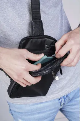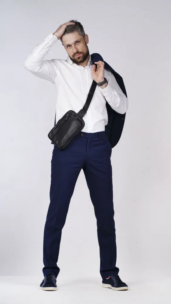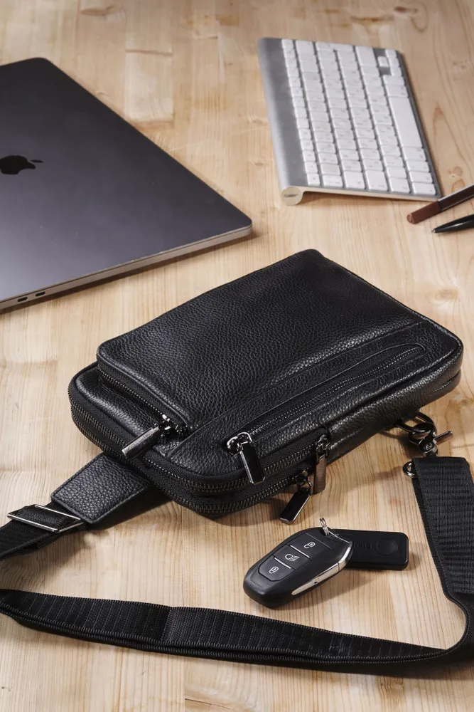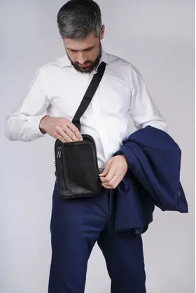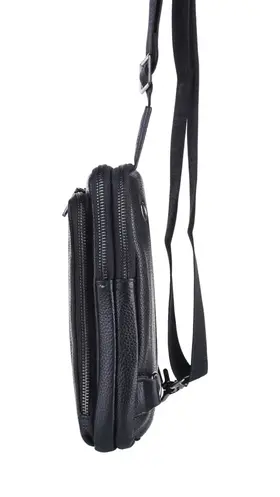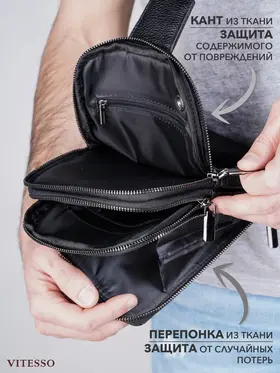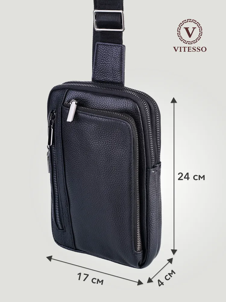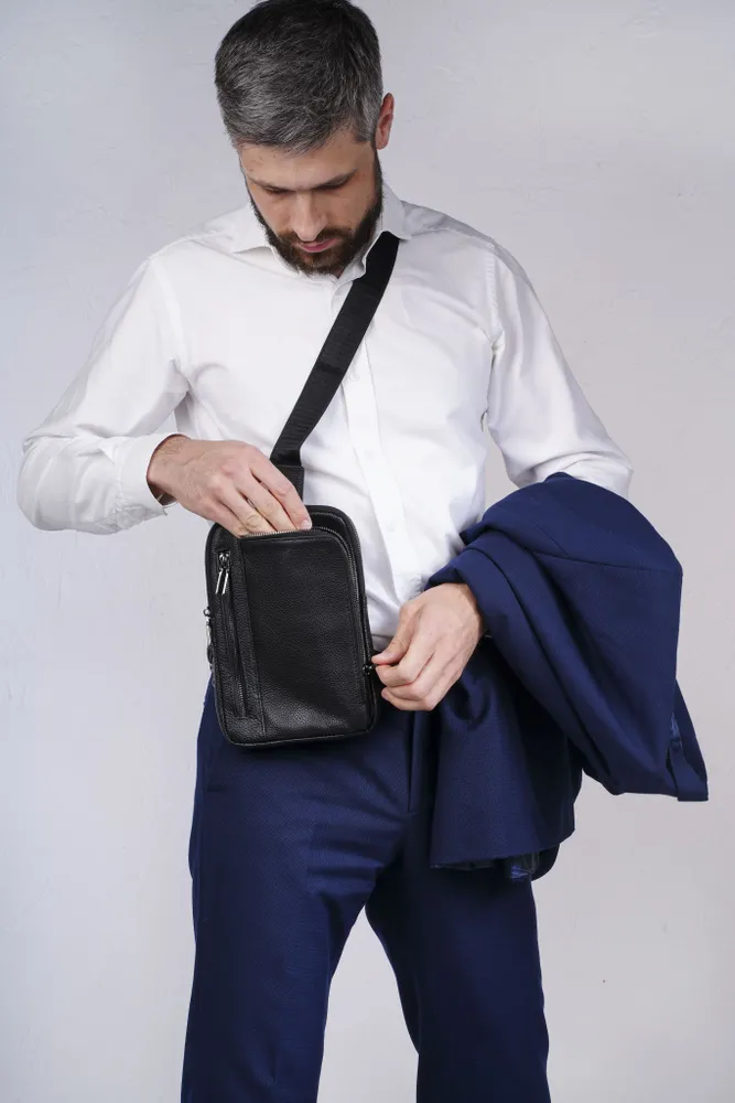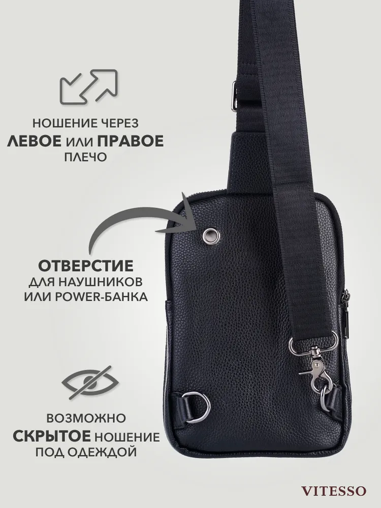 Сумка мужская через плечо обеспечивает презентабельность и комфорт настоящему мужчине. Для изготовления сумки используется высококачественная натуральная кожа с вощенной отделкой, приятная на ощупь, а также надежная фурнитура темного цвета. Данная кожаная нагрудная сумка имеет 4 отделения разного размера, разделенных стенками, что позволяет предметам не смешиваться. В отделениях помещаются документы, кошелек, телефон, ключи и другие необходимые мелочи. Два основных отделения снабжены внутренними карманами. На задней стенке имеется отверстие для удобного использования наушников и power-банков. Эргономичные отделения на молнии обеспечивают легкий доступ к содержимому и надежно его защищают. Размеры: 24х17х4 см. В комплекте идет ремень, регулируемый по длине от 60 до 120 см. Кожаная сумка содержит два карабина, благодаря чему ремень можно перестегнуть, и носить сумку на грудь через правое или левое плечо. Отмеченные характеристики гарантируют удобство и функциональность. Черная мужская нагрудная сумка прекрасно дополнит любой стиль и образ. Сумка мужская через плечо представлена в двух вариантах - с металлическими или кожаными пуллерами.
