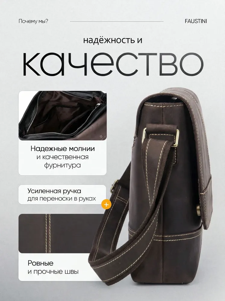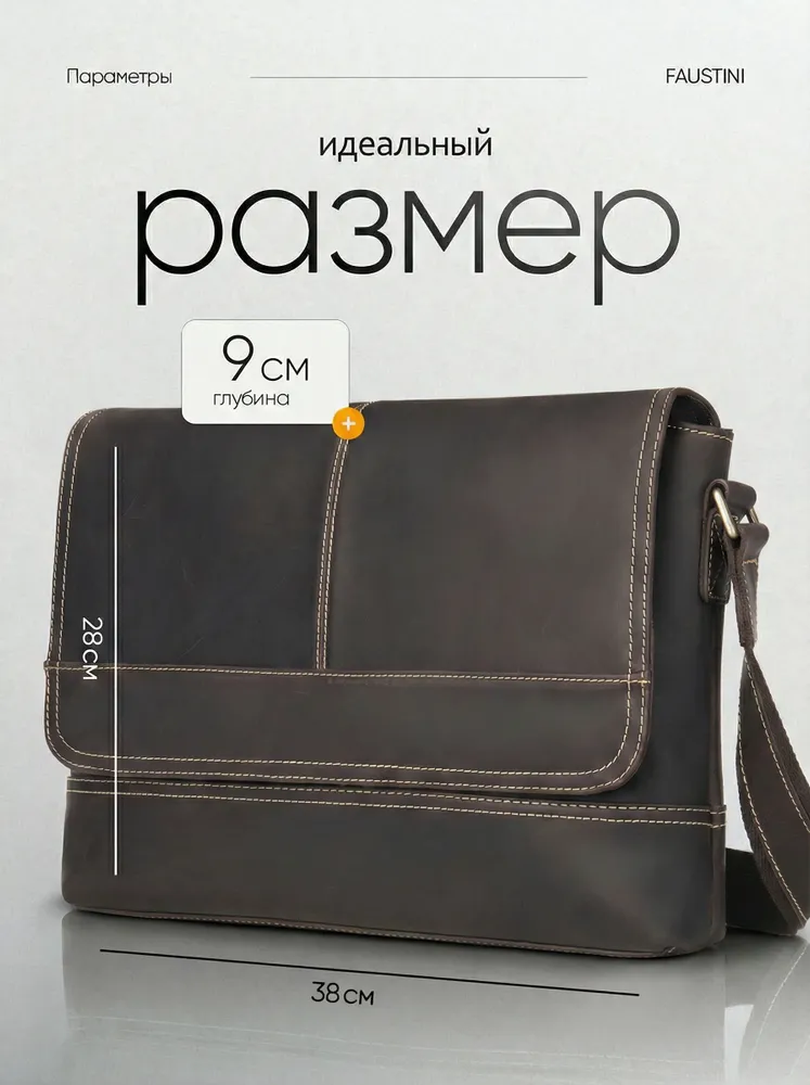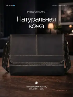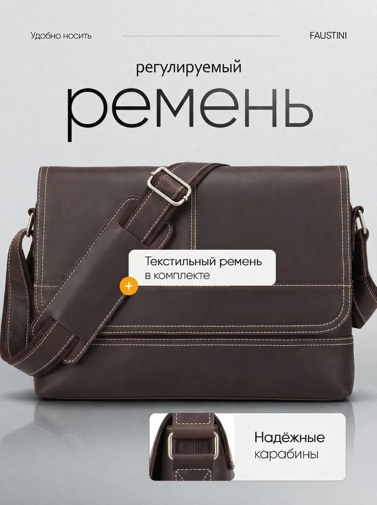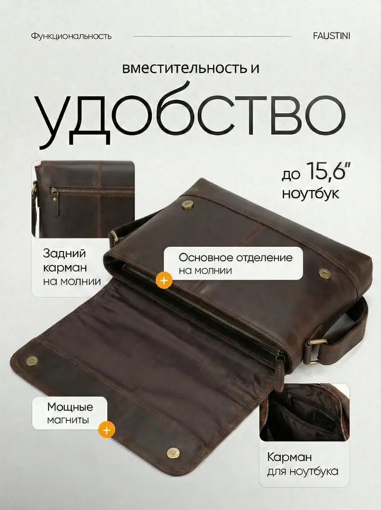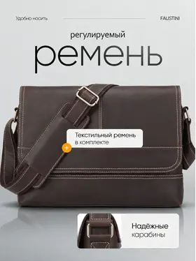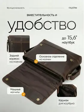 Сумка мужская кожаная для документов Faustini Сумка мужская кожаная для документов A4 изготовлена из высококачественной натуральной кожи премиум класса в эксклюзивном дизайне. Выбирая бренд FAUSTINI - вы выбираете качество, роскошный и неповторимый стиль. Разрешите себе использовать надежные аксессуары премиального бренда FAUSTINI, которые будут служить вам долгие годы. Кожаная сумка мужская легко вмещает документы формата А4 и ноутбука до 15 дюймов. Внутри прочная тканевая подкладка, два основных отделения, разделенных перегородкой на молнии. Также имеется два открытых кармана на передней стенке. На обратной стороне сумки для ноутбука расположен довольно большой карман на молнии. В комплект входит регулируемый по длине ремень. Достойный подарок мужчине на любой праздник!