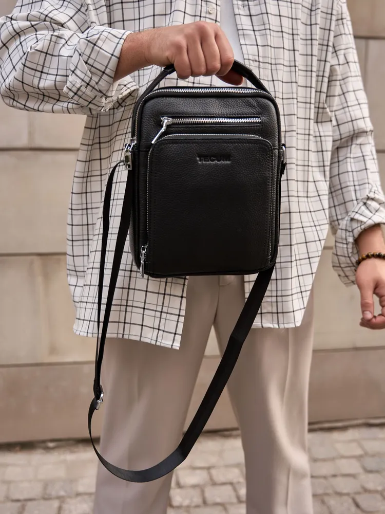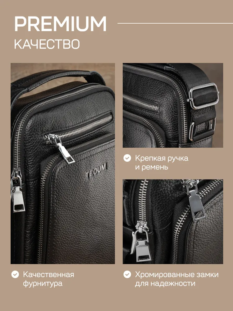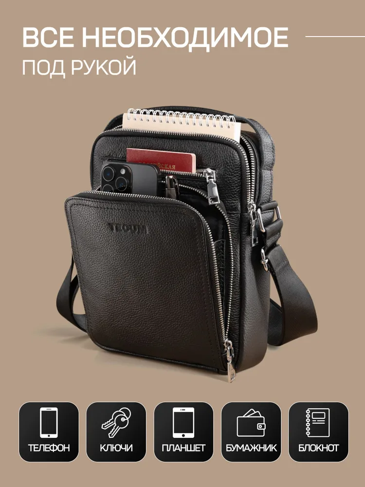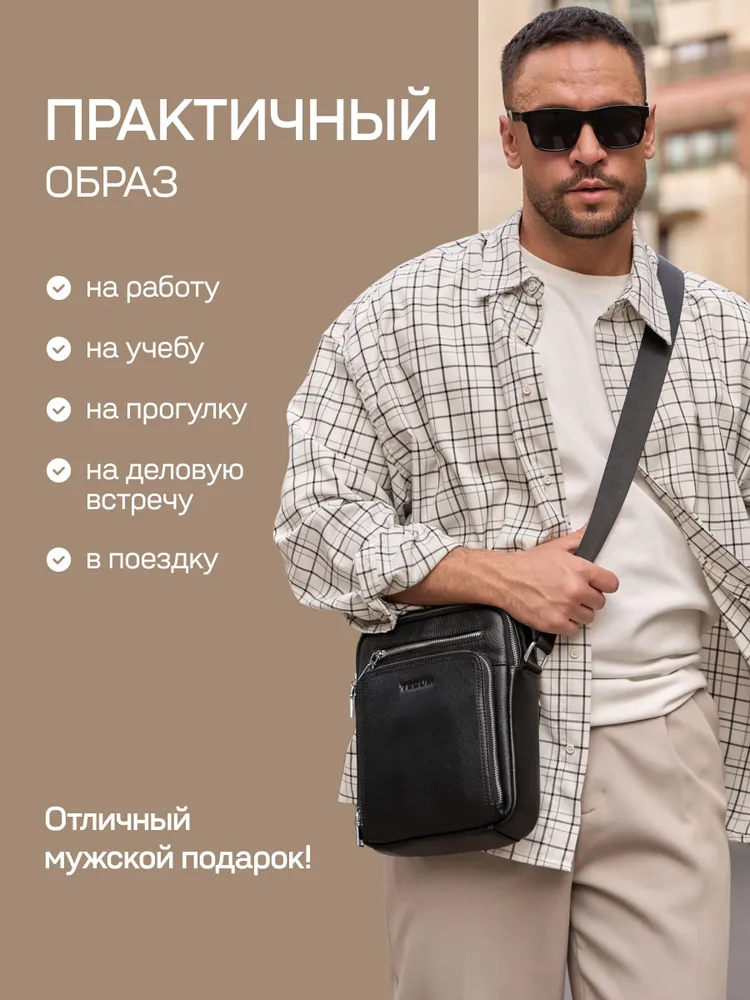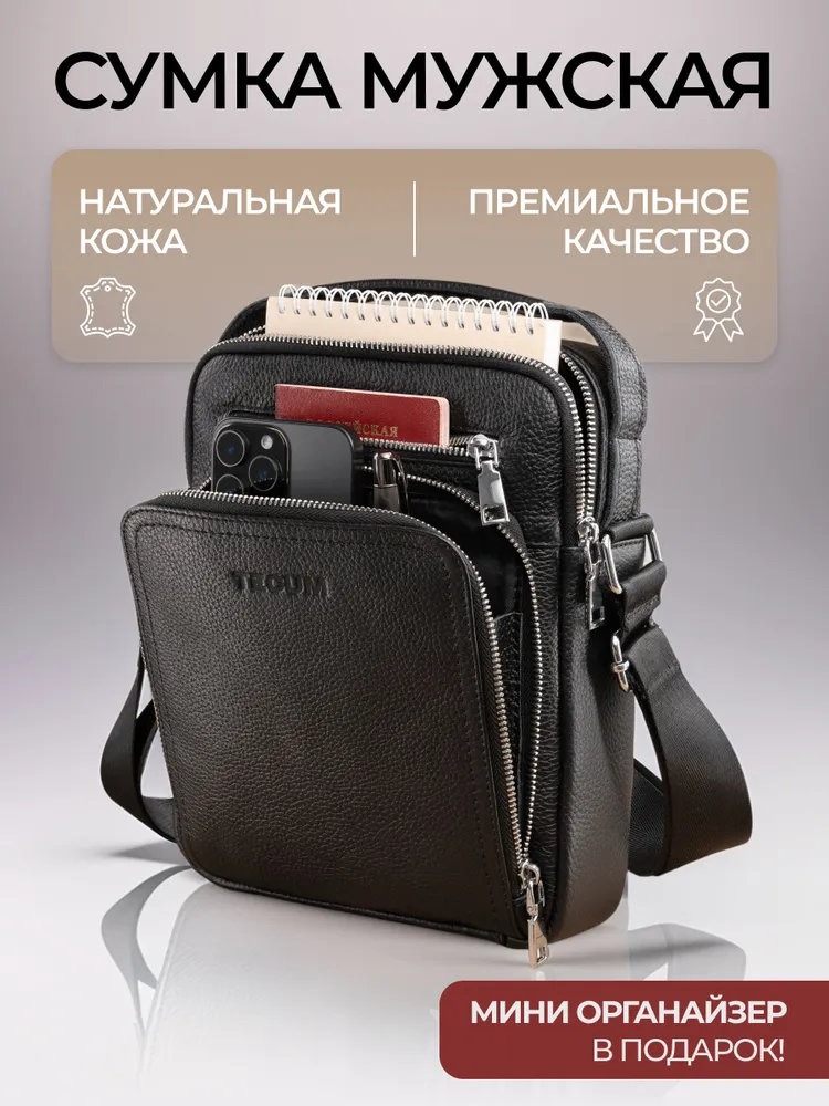 Стиль и качество. Эта сумка не просто аксессуар, это стильная и удобная вещь, которая станет незаменимым помощником в повседневной жизни. Сумка выполнена из натуральной кожи Premium качества и является настоящим предложением для мужчин, которые ценят практичность, качество и стиль. Комфортная форма. Сумка подходит для любых случаев - от повседневной носки до особых мероприятий. Благодаря регулируемому поясному ремню, можно настроить сумку на любую высоту вашего тела. Прочная и долговечная. Сверхпрочная фурнитура гарантирует безопасность и сохранность ваших вещей. Компактная и вместительная сумка состоит из 7 отделений, которые помогут держать все вещи в порядке и быстро находить нужные вещи, находясь при этом за рулем в машине или передвигаясь по городу. Приятный бонус! Мы любим и благодарны нашим покупателям за выбор нашего магазина. При покупке сумки мы с удовольствием дарим Вам практичный презент, который вы может использовать в разных вариантах жизни. Практичная. Удобная. Отличный презент! Сумка мессенджер - это универсальный аксессуар на все случаи жизни. Вы можете использовать сумку как повседневно, так и в качестве презента коллегам, а также важным или близким вам людям. Добро пожаловать в наш магазин бренда TECUM! Все наши изделия выполнены из качественных материалов, а также из натуральной кожи высокого качества и прошли все этапы сертификации. Кликайте на фото, заходите к нам на страничку и выбирайте подходящие для вас или ваших близких аксессуары нашего магазина под ваш стиль жизни. Носите с удовольствием наши изделия! Спасибо за выбор нашего магазина. Ваш бренд TECUM!