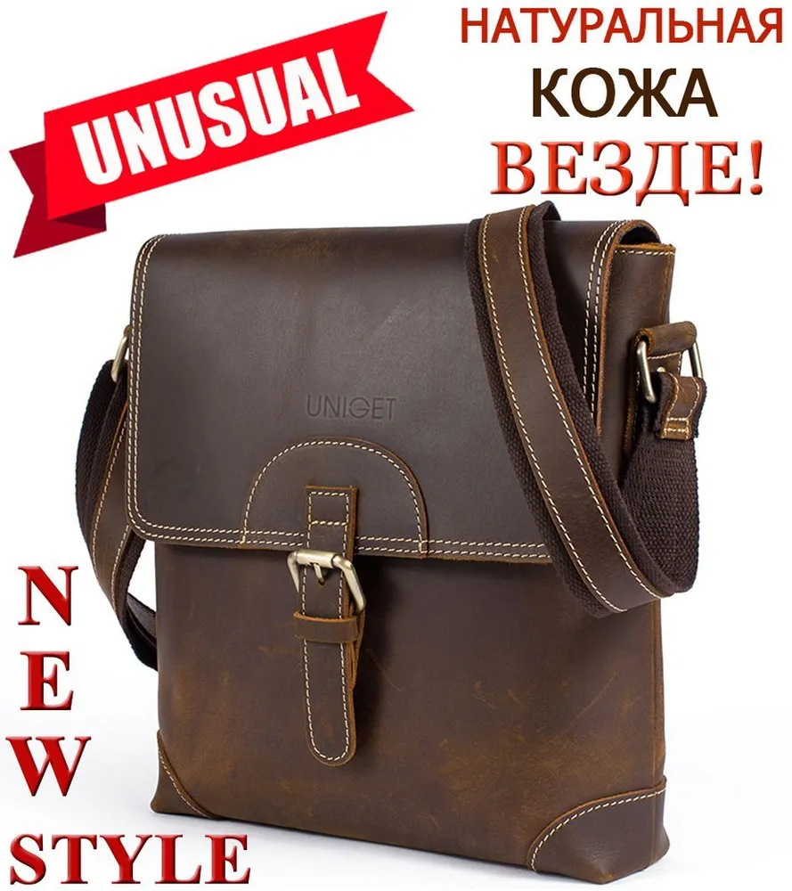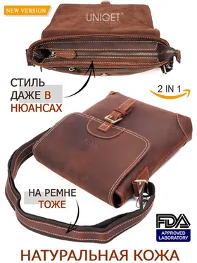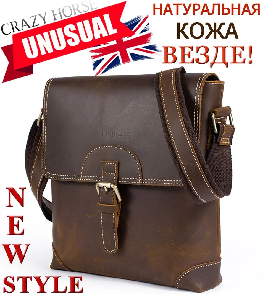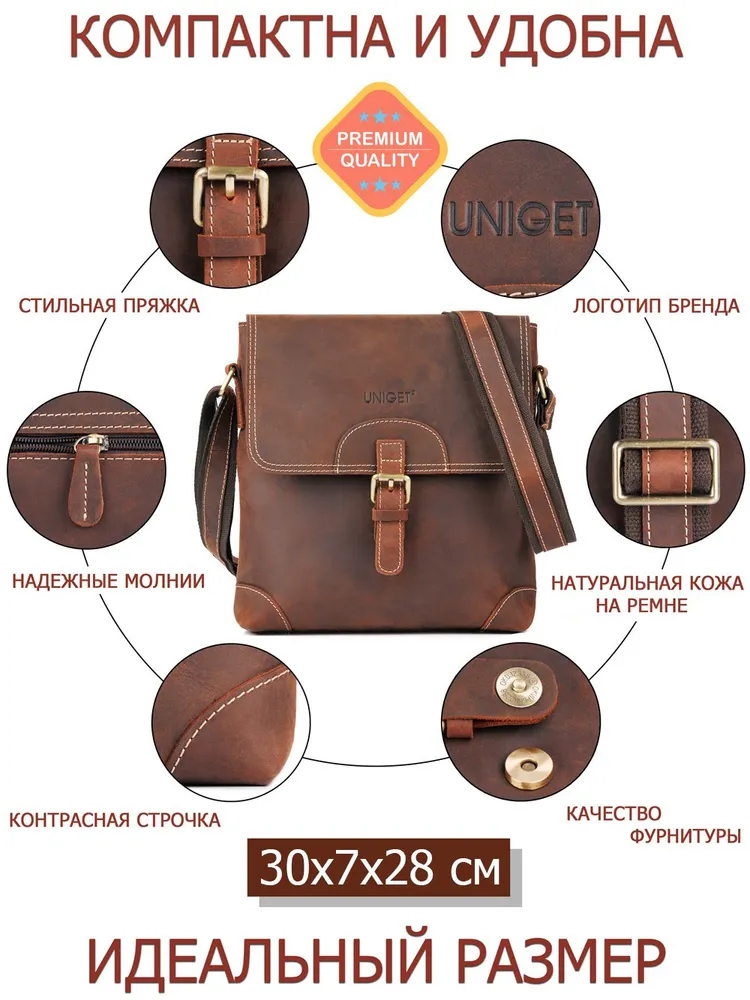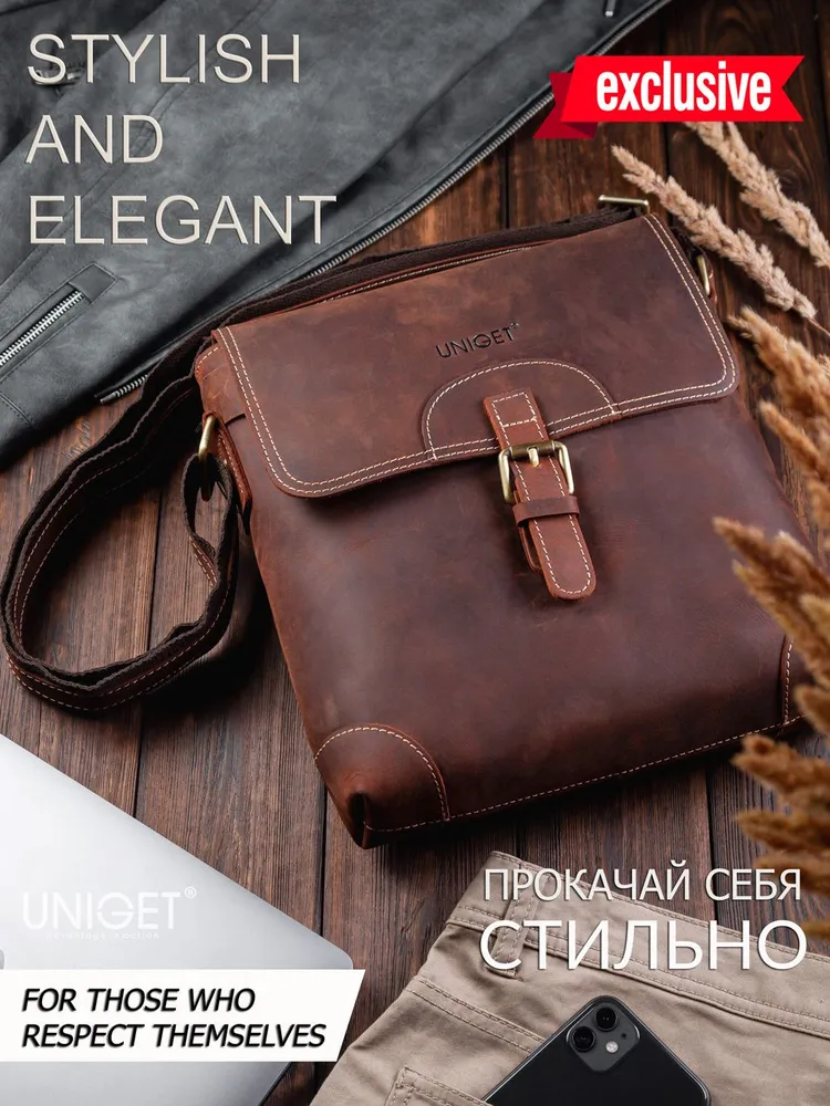 Стильная сумка UNIGET® из натуральной кожи Цените комфорт, стиль, лаконичность и натуральные материалы? Представляем вашему вниманию кожаную сумку-планшет в легком винтажном стиле. ✦ Компактная по своим размерам, она способна вместить все, что необходимо современному жителю мегаполиса и не только. Ее размеры 30х7х28 см позволят вам взять с собой важные документы и, конечно же, телефон и планшет – как без них? UNIGET® Официально зарегистрированный Торговый Знак ✦ Качественная сумка на плечо выполнена из натуральной кожи Crazy Horse высокой категории. Надежная отстрочка не порвется, поэтому ваш аксессуар долгие годы будет выглядеть так, словно вы только вчера его купили. ✦ В некоторых сумках часто протираются уголки. Мы обратили внимание на этот момент и дополнительно укрепили нижнюю часть этой сумки стильным накладным кожаным уголком. Получился дополнительный дизайнерский элемент и более надежная защита от появления дефектов. ✦ Нижняя и боковая часть сумки укреплена плотным швом, который не только все эффективно фиксирует, но и является декоративным элементом. ОСТЕРЕГАЙТЕСЬ ПОДДЕЛОК ПО НИЗКОЙ ЦЕНЕ BEWARE OF FAKES AT A LOW PRICE! ✦ Эту мужскую кожаную сумку удобно носить через плечо благодаря специальной обработке ремня дополнительной тканевой лентой из 100% хлопка. ✦ Соприкасаясь даже в жаркую погоду с обнаженными частями вашего тела, он не будет доставлять дискомфорт и портиться от влаги. ✦ Язычок небольшого закрывающего механизма тщательно укреплен. Он не оторвется и не повредится во время регулярного использования. ✦ Все элементы сумки ручной работы продуманы под ваши ожидания. ✦ Мы организовали в ней достаточно открытых и закрывающихся на молнии отделов, чтобы вы смогли комфортно для себя разместить все, что необходимо. ✦ Благодаря своему лаконичному стилю эта сумка подходит для мужчин и женщин. ✦ Покупая такую сумку унисекс на подарок, вы дарите не просто дизайнерское изделие, а качественный и надежный аксессуар, как пожелание стабильности и процветания. ✦ Не раздумывайте! Заказывайте прямо сейчас кожаную сумку через плечо UNIGET™, и уже через несколько дней она будет у вас! ОСТЕРЕГАЙТЕСЬ ПОДДЕЛОК ПО НИЗКОЙ ЦЕНЕ BEWARE OF FAKES AT A LOW PRICE!