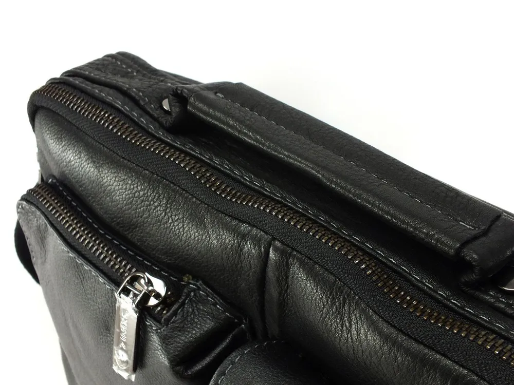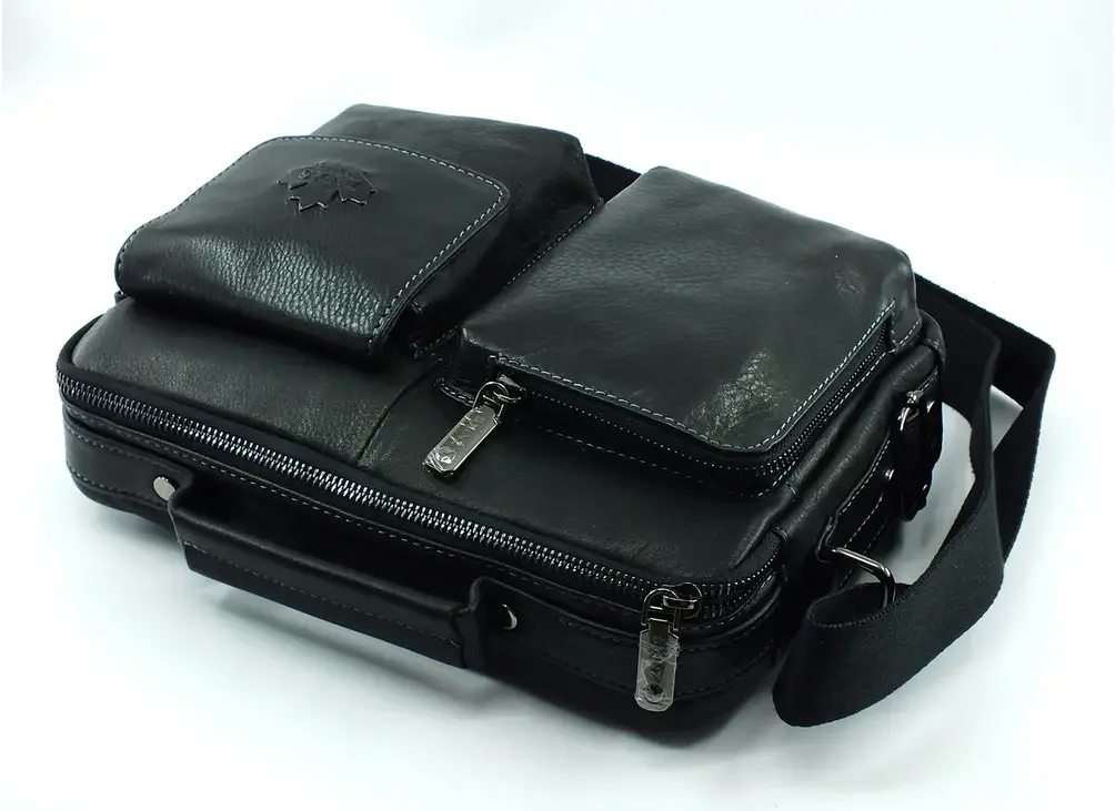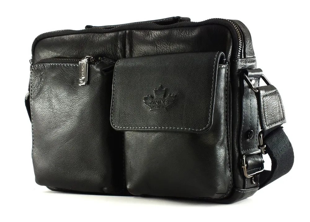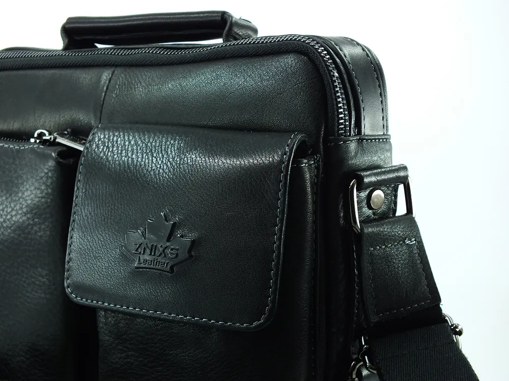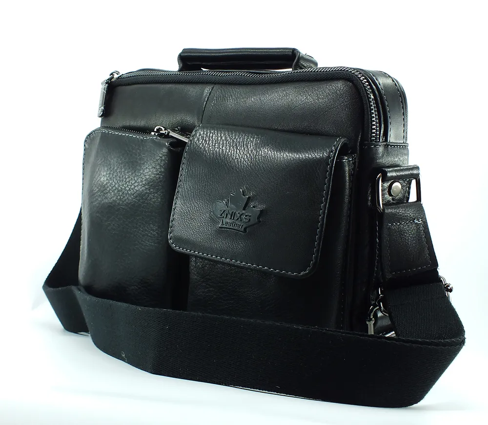 Мужская сумка из натуральной кожи имеет одно вместительное отделение, внутренний карман на молнии, два кармашка под телефон и портмоне. На задней стенке карман быстрого доступа на молнии во всю ширину сумки.С лицевой стороны два накладных объёмных кармана, один на молнии, а второй закрывается клапаном с магнитной кнопкой. Для переноски кожаная ручка и наплечный тканевый ремень. Отличное качество, стильная и актуальная модель делает этот аксессуар идеальным подарком мужчине по любому поводу. Будьте в тренде, выбирайте качество и практичность с этой вместительной и стильной барсеткой. Сумка изготовлена на фабрике производящей продукцию под марками Znixs, Zinixs,Zinimsk, Zznick общим логотипом которой является кленовый лист.
