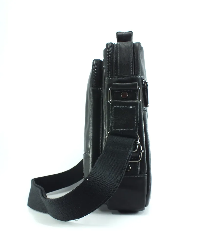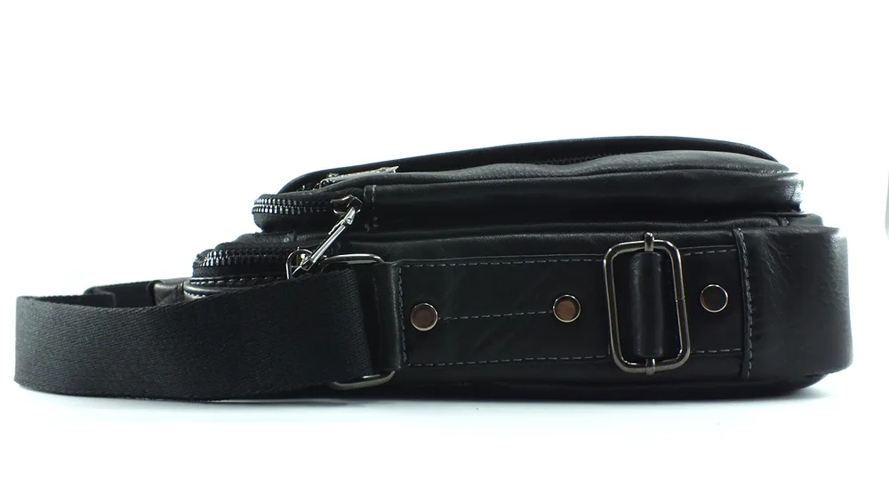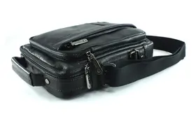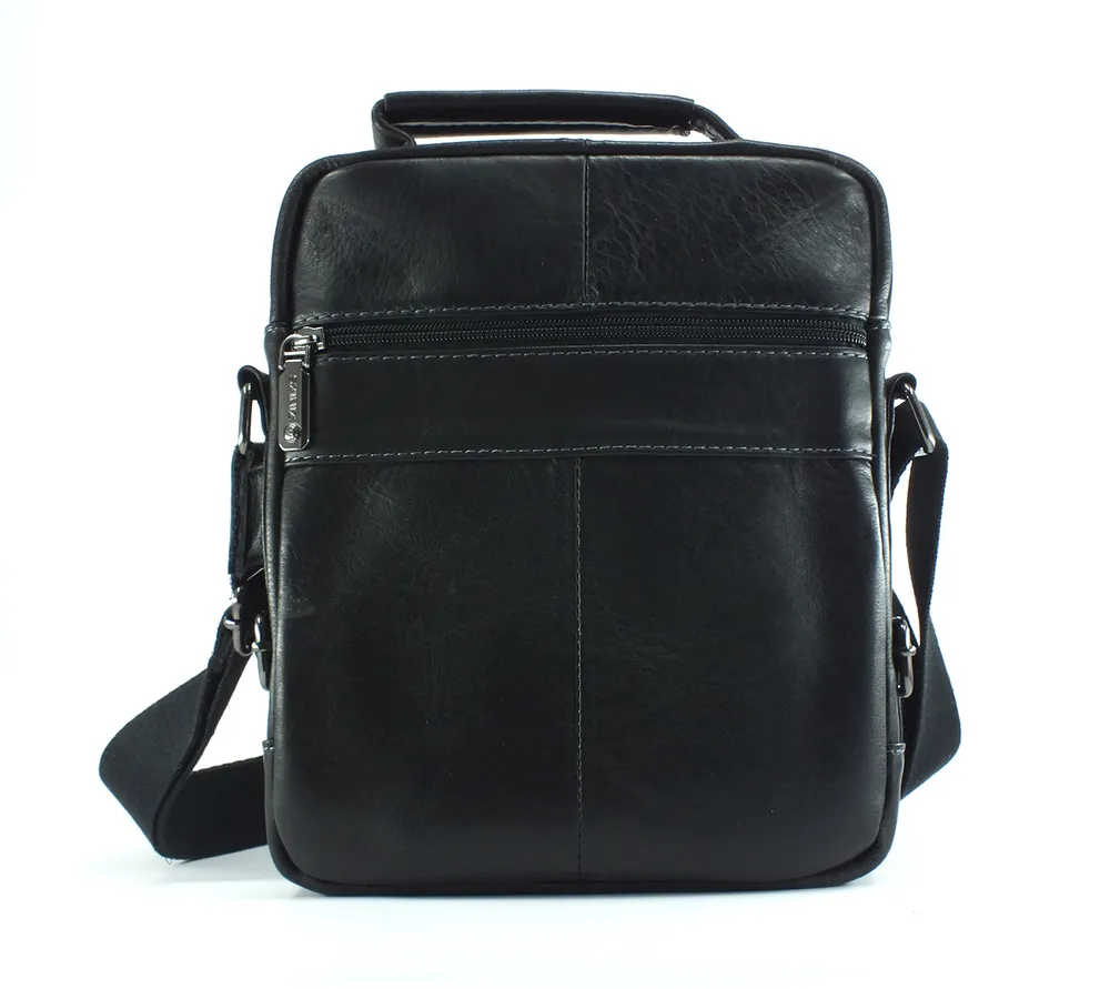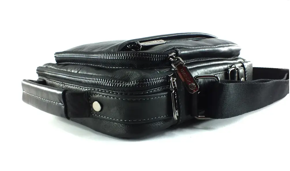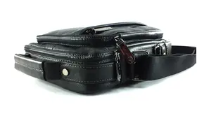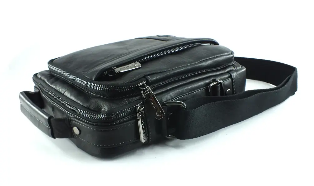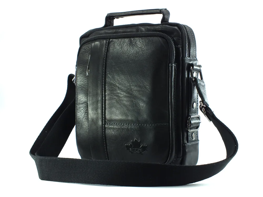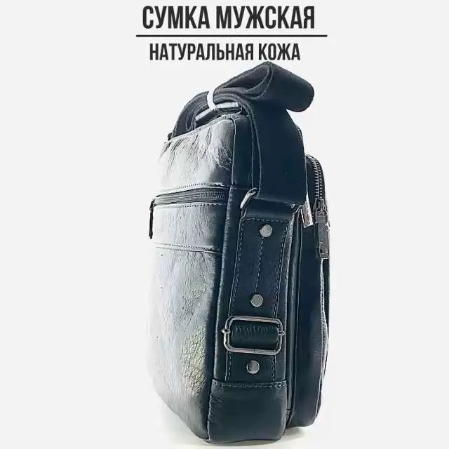 Мужская сумка из натуральной кожи черного цвета. Имеет одно большое отделение на молнии, внутри которого карман на молнии и два открытых кармашка. Сзади карман быстрого доступа на молнии, на лицевой стороне объёмный карман на молнии и дополнительное отделение на вертикальной молнии. Кожаная ручка для переноски и регулируемый плечевой ремень. Отличное качество бренда , стильная и актуальная модель делает этот аксессуар идеальным подарком мужчине по любому поводу. Сумка изготовлена на фабрике производящей продукцию под марками Znix,Znixs, Zinixs, Zinimsk, Zzick общим логотипом которой является кленовый лист.