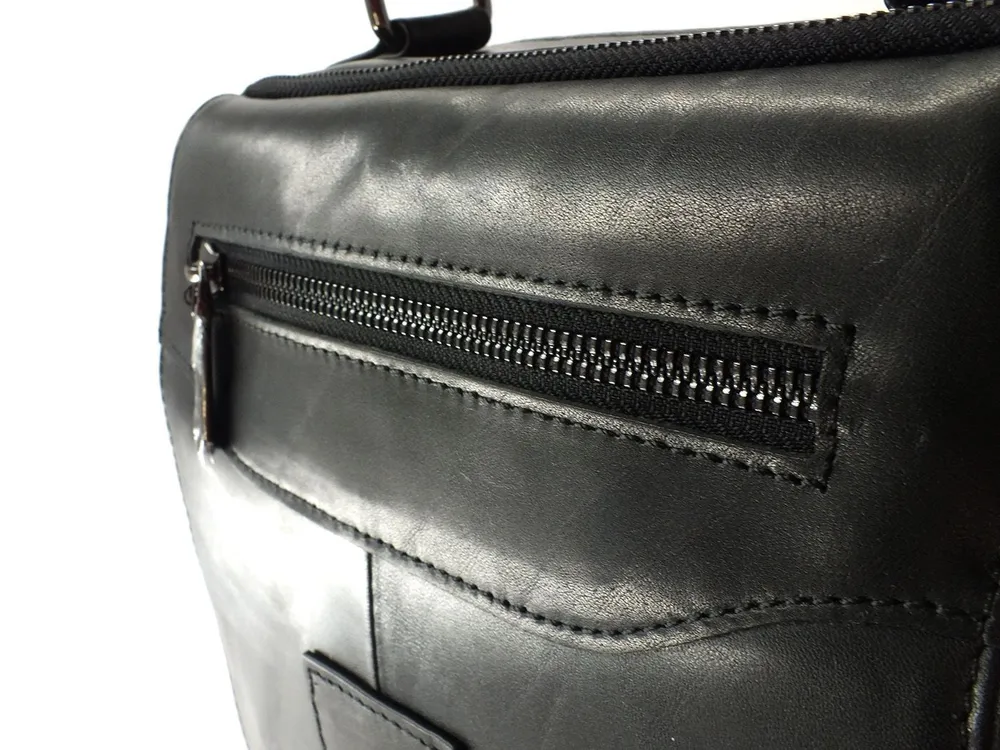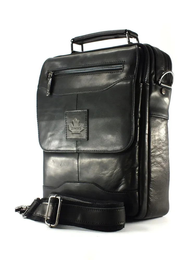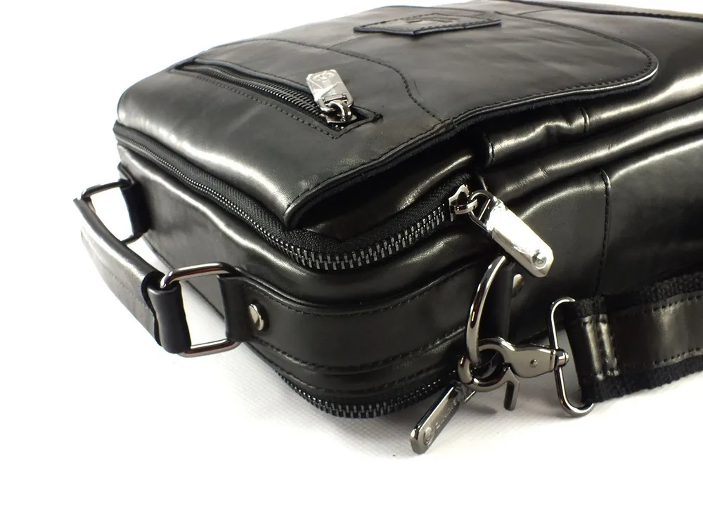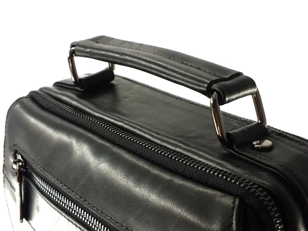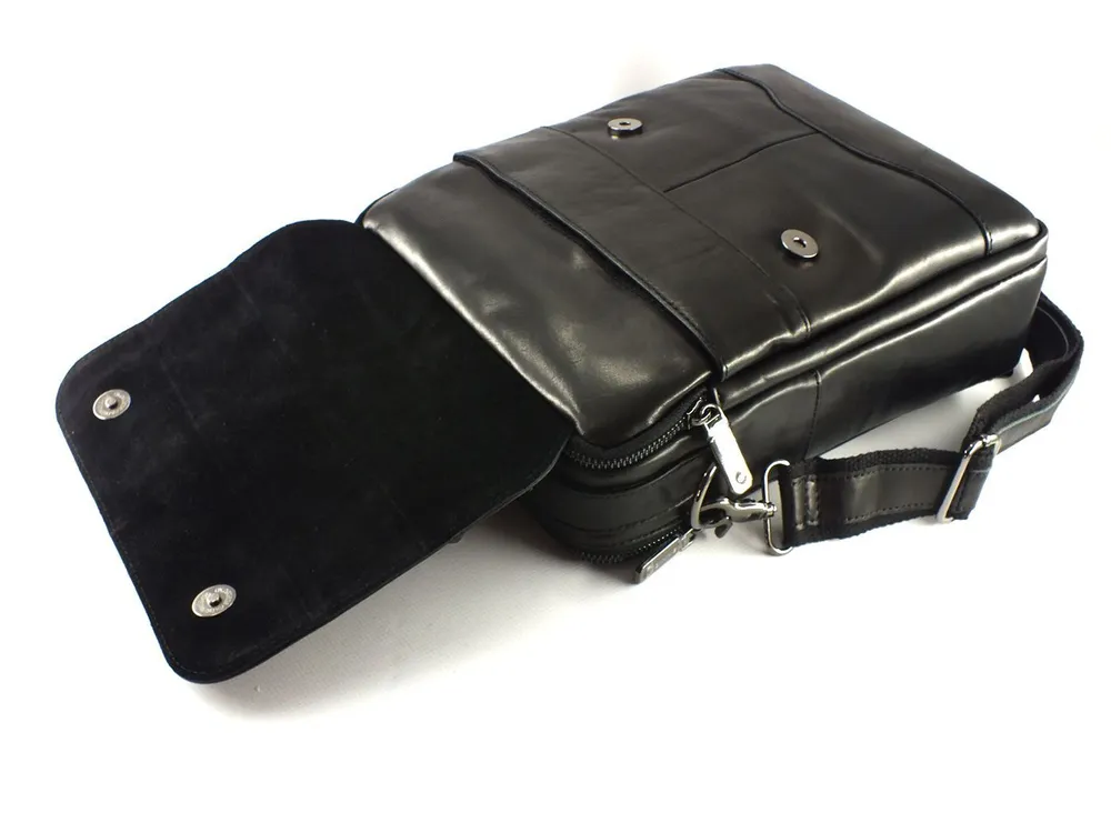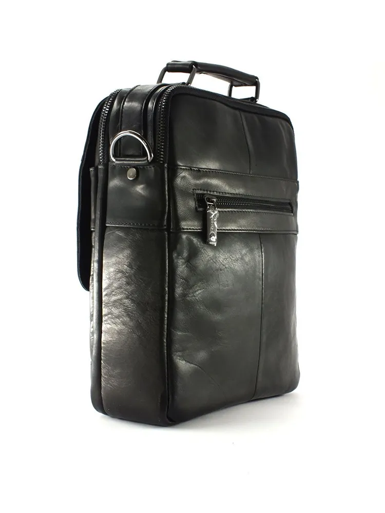 Мужская сумка из натуральной кожи черного цвета.Имеет два вместительных отдела с внутренними карманами, два наружных кармана на лицевой стороне: один на молнии на клапане, второй под клапаном на магнитах, на задней стенке карман для быстрого доступа на молнии . Вся фурнитура и швы прочные, долговечные, водонепроницаемый материал обеспечивают длительное время использования и надёжно защищают содержимое от механических повреждений и намокания. Сумка имеет ручку для переноски в руке и регулируемый плечевой ремень с кожаной нашивкой во всю длину. Как ухаживать: 1. Не храните в полиэтиленовом пакете, а также на солнце и вблизи отопительных приборов, не сушить. 2. Не чистить мылом и обильным количеством воды. 3. Очищайте изделие по мере загрязнения специальным средством, согласно инструкции. 4. Для блеска и дополнительной защиты используйте бесцветный крем, для скрытия царапин и заломов применяйте крем цветной. Отличное качество бренда, стильная и актуальная модель делает этот аксессуар идеальным подарком мужчине по любому поводу.