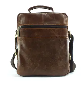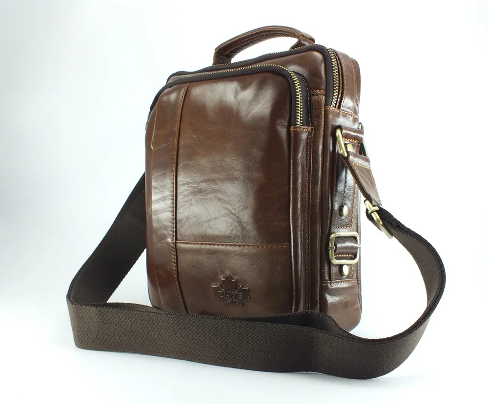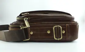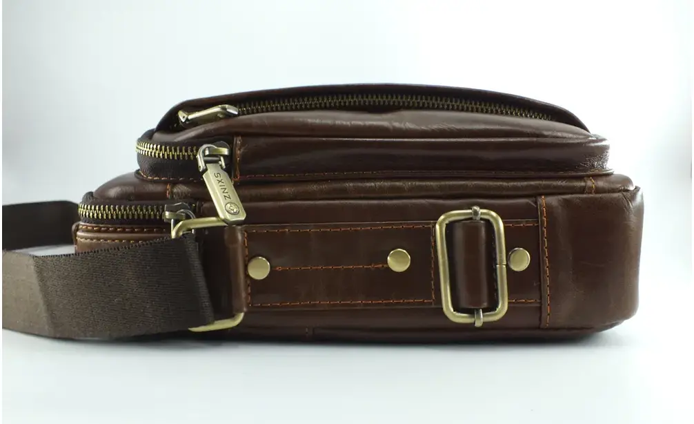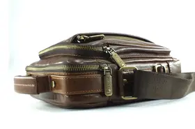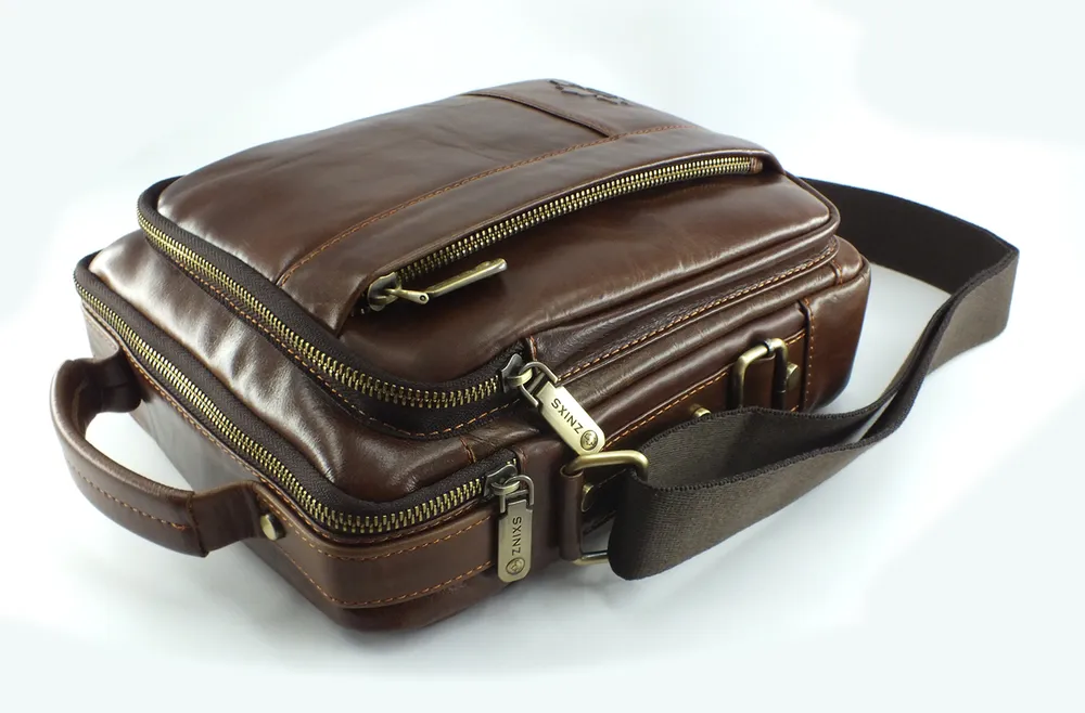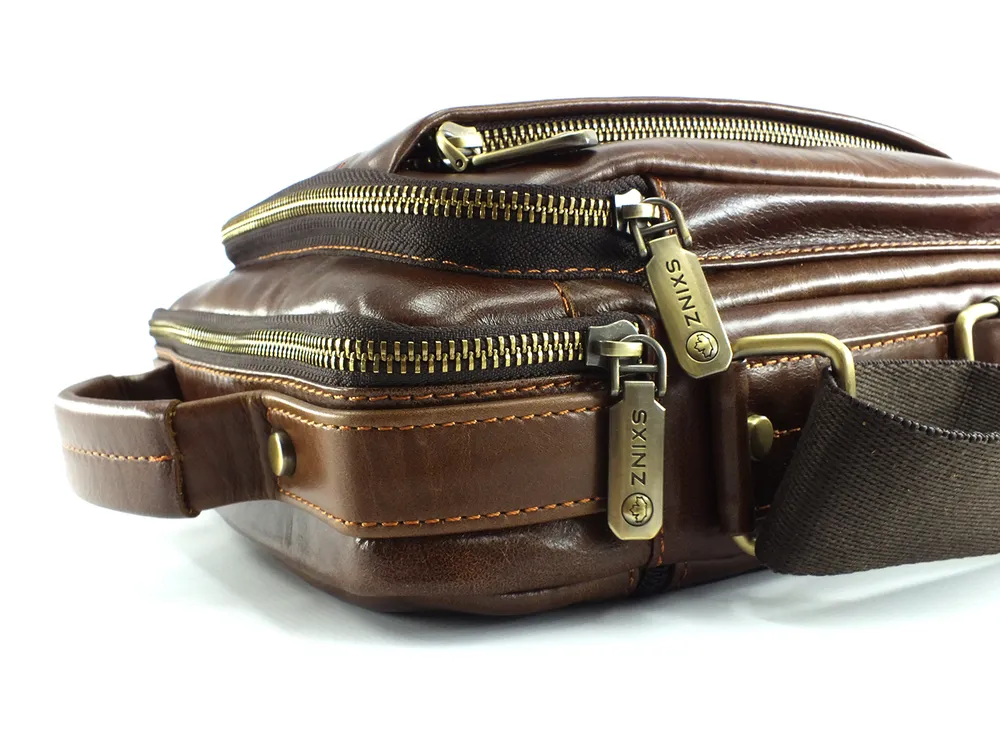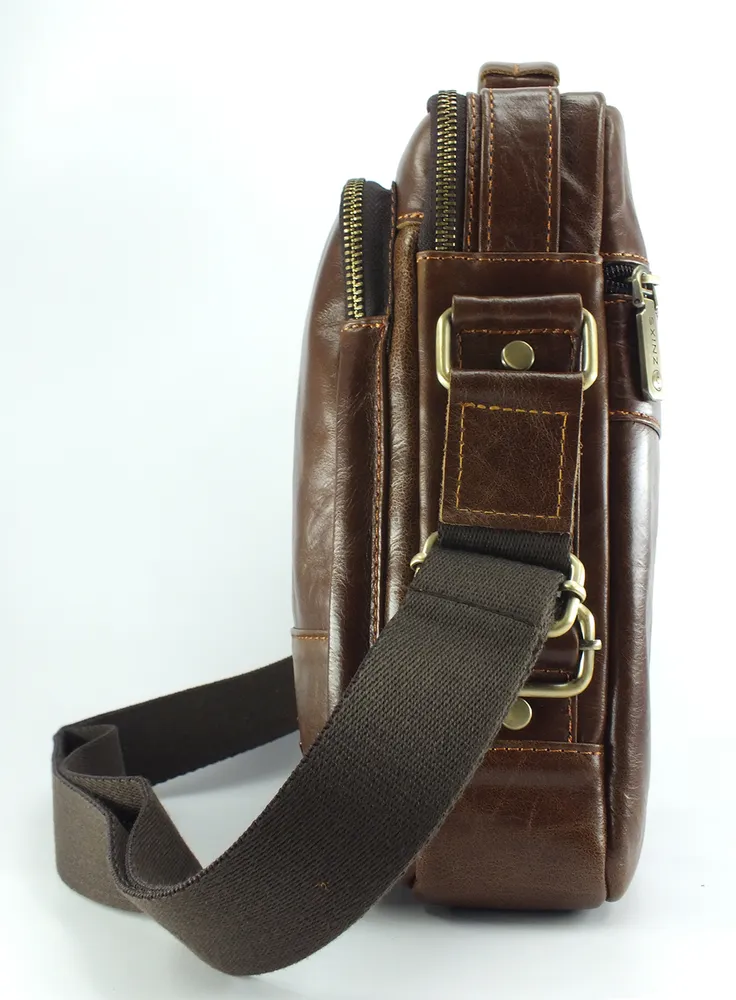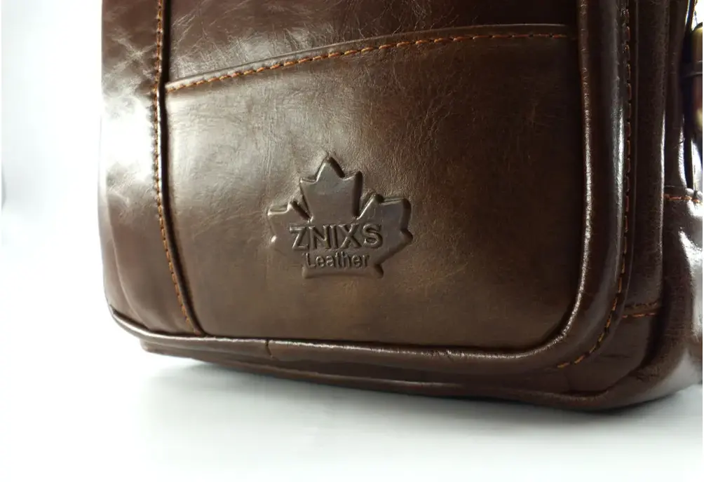Мужская сумка из натуральной кожи коричневого цвета. Имеет одно большое отделение на молнии, внутри которого карман на молнии и два открытых кармашка. Сзади карман быстрого доступа на молнии,спереди объёмный карман на молнии и дополнительное отделение на вертикальной молнии. Кожаная ручка для переноски и регулируемый плечевой ремень. Отличное качество бренда, стильная и актуальная модель делает этот аксессуар идеальным подарком мужчине по любому поводу. Сумка изготовлена на фабрике производящей продукцию под марками Znixs, Zinixs, Zinimsk, Zznick общим логотипом которой является кленовый лист.