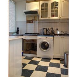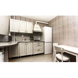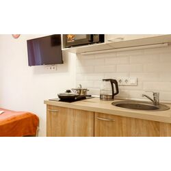 Кухонная зона оборудована кухонным гарнитуром с необходимой техникой для приготовления и хранения продуктов и обеденным столиком для двоих, также есть необходимая посуда на двух персон.